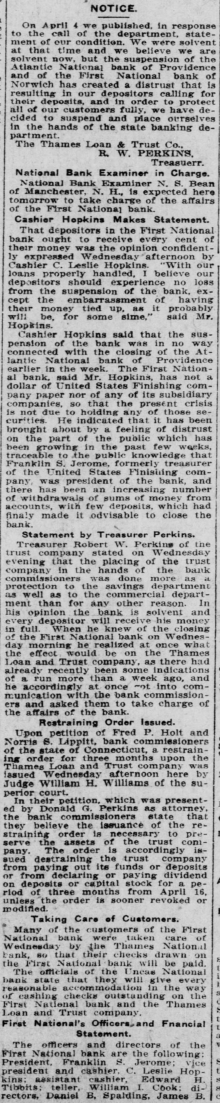 NOTICE. 4 we published. in response stateOn April of the department, solvent to the call condition. We were are ment of our time and we believe we of bank of that now, but the suspension Providence the First National has created a for in our depositors solvent Atlantic and at Norwich of the National order distrust calling to bank protect that of is resulting deposits, and in have detheir customers fully, we ourselves all of our suspend and place decided in the to hands of the state banking partment. The Thames Loan R. W. & Trust PERKINS, Co., Treasuerr. National Bank Examiner in Charge. Bean Bank Examiner N. S. here National N. H., is expected affairs of Manchester, to take charge of the tomorrow the First National bank. of Cashier Hopkins Makes Statement. National depositors in the First cent of That receive every bank ought was to the opinion confident- by ly their expressed money Wednesday afternoon With our our C. Leslie Hopkins. believe Cashier properly handled, I loss loans should experience bank, no exdepositors the suspension of the of having from embarrassment probably cept the tied up, as it said Mr. their will be, money for some sime," Hopkins. Cashier Hopkins said that in the no sus- way pension of with the the bank closing was Providence of the Atconnected National bank of Nationearlier lantic in the week. Mr. Hopkins, The First has not com- a al bank. United said States Finishing subsidiary dollar of nor of any of its crisis pany paper so that the present those secompanies, to holding any of has been is not due indicated that it distrust curities. about He by a feeling of which brought the public the part of past few weeks, that has on growing in the knowledge been traceable S. to Jerome, the public formerly treasurer comFranklin United States Finishing bank, and of the president of the number pany, was been an increasing from there has of sums of money which had of withdrawals with few deposits, close the accounts, finaly made it odvisable to bank. Statement by Treasurer Perkins. of Robert W. Perkins Wednesday the Treasurer stated on the trust trust company that the placing of the bank company evening in the hands done of more as a commissioners the was savings department departprotection well as to to the commercial other reason. In than for bank is solvent ment as his opinion the any will receive his closing money and every depositor he knew of the Wednesin of the full. First When National bank at on once what day morning would he realized be on the there Thames had Loan the effect and Trust company, been some as indications and already recently than a week ago, comof a run more at once -nt commission- into he accordingly with the bank charge of munication and asked them to take ers the affairs of the bank. Restraining Order Issued. of Fred P. Holt and Upon petition LAppitt, bank commissioners restrainof Norris the state S. of Connecticut, months a upon the ing order for and three Trust company here was by Thames Wednesday Loan afternoon the suissued Judge William H. Williams of perior court. petition, which was attorney, presentIn their Donald G. Perkins as state that ed by bank commissioners of the reI the the issuance to prethey order is trust straining believe necessary the con- isserve the assets of is accordingly pany. The order the trust company sued destraining out its funds or deposits A from from paying declaring or paying stock for dividend a peor on deposits or months capital from April 16, riod unless of the three order is sooner revoked or modified. Taking Care of Customers. Many of bank the customers were taken of the National care First of National by the Thames drawn on S Wednesday that their checks be paid. bank, so National bank will National i the First officials of the Uncas give every I The that they will bank state accommodation in the on way the reasonable checks outstanding Thames of cashing National bank and the First and Trust company. Statement. Loan First National's Officers, and Fnancial officers and directors following: of the S The National bank are the Jerome; vice t First President, Franklin S. Leslie HopS president and cashier, C. Edward H. kins; assistant cashier, William I. Cook: did rectors, Tibbits; Daniel teller, B, Spalding, James B.