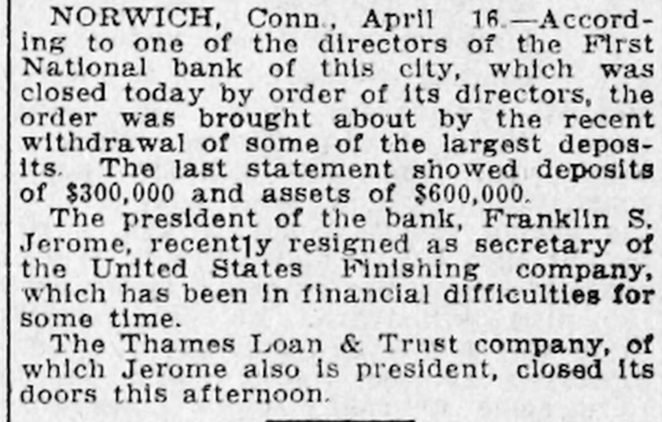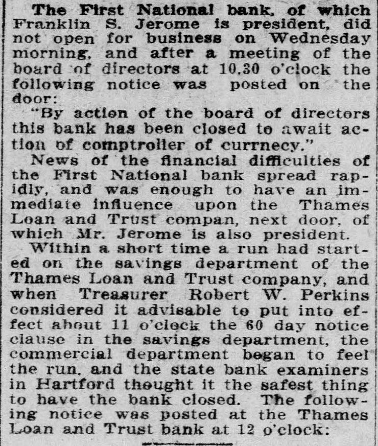 The First National bank, of which Franklin S. Jerome is president, did not open for business on Wednesday morning, and after a meeting of the board of directors at 10.30 o'clock the following notice was posted on the door: "By action of the board of directors this bank has been closed to await action of comptroller of currnecy." News of the financial difficulties of the First National bank spread rapidly, and was enough to have an immediate influence upon the Thames Loan and Trust compan, next door. of which Mr. Jerome is also president. Within a short time a run had started on the savings department of the Thames Loan and Trust company, and when Treasurer Robert W. Perkins considered it advisable to put into effect about 11 o'clock the 60 day notice clause in the savings department, the commercial department began to feel the run. and the state bank examiners in Hartford thought it the safest thing to have the bank closed. The following notice was posted at the Thames Loan and Trust bank at 12 o'clock: