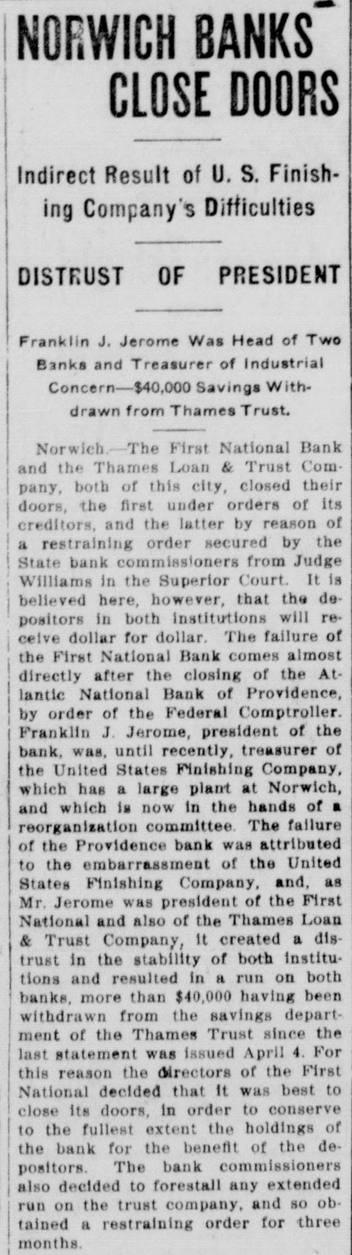 NORWICH BANKS CLOSE DOORS Indirect Result of U. S. Finishing Company's Difficulties DISTRUST OF PRESIDENT Franklin J. Jerome Was Head of Two Banks and Treasurer of Industrial Concern-$40,000 Savings Withdrawn from Thames Trust. Norwich.-The First National Bank and the Thames Loan & Trust Company, both of this city, closed their doors, the first under orders of its creditors, and the latter by reason of a restraining order secured by the State bank commissioners from Judge Williams in the Superior Court. It is believed here, however, that the depositors in both institutions will recelve dollar for dollar. The failure of the First National Bank comes almost directly after the closing of the Atlantic National Bank of Providence, by order of the Federal Comptroller. Franklin J. Jerome, president of the bank, was, until recently, treasurer of the United States Finishing Company, which has a large plant at Norwich, and which is now in the hands of a reorganization committee. The failure of the Providence bank was attributed to the embarrassment of the United States Finishing Company, and, as Mr. Jerome was president of the First National and also of the Thames Loan & Trust Company, it created a distrust in the stability of both institutions and resulted in a run on both banks, more than $40,000 having been withdrawn from the savings department of the Thames Trust since the last statement was issued April 4. For this reason the directors of the First National decided that It was best to close its doors, in order to conserve to the fullest extent the holdings of the bank for the benefit of the depositors. The bank commissioners also decided to forestall any extended run on the trust company, and so obtained a restraining order for three months.