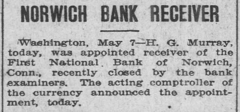 NORWICH BANK RECEIVER Washington, May 7-H. G. Murray, today, was appointed receiver of the First National Bank of Norwich, Conn., recently closed by the bank examiners. The acting comptroller of the currency announced the appointment, today.