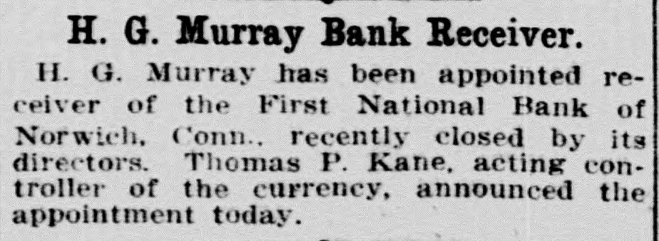 H. G. Murray Bank Receiver. H. G. Murray has been appointed receiver of the First National Bank of Norwich. Conn., recently closed by its directors. Thomas P. Kane, acting controller of the currency, announced the appointment today.