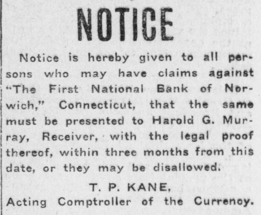 NOTICE Notice is hereby given to all persons who may have claims against "The First National Bank of Norwich," Connecticut, that the same must be presented to Harold G. Murray, Receiver, with the legal proof thereof, within three months from this date, or they may be disallowed. T. P. KANE, Acting Comptroller of the Currency.