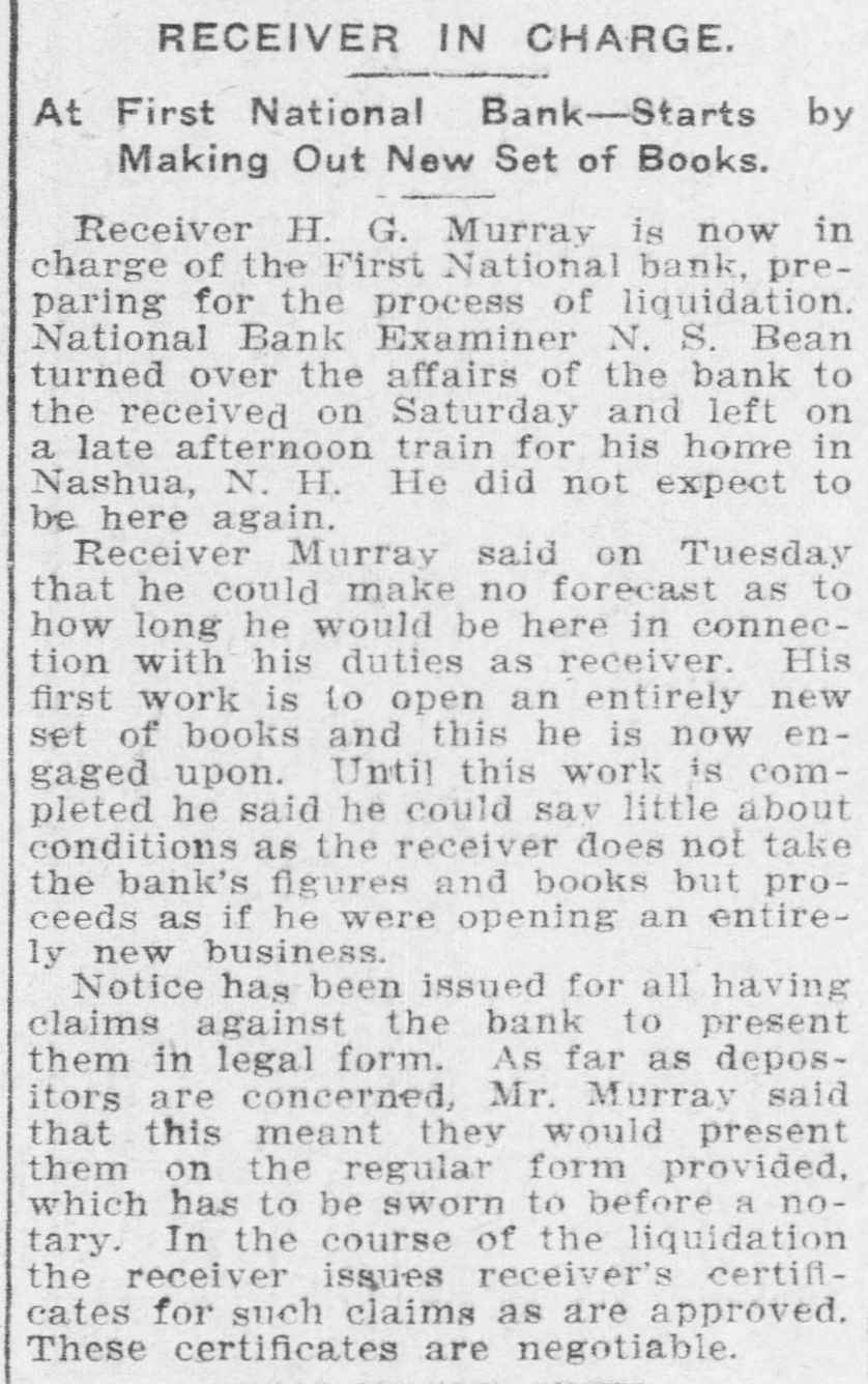 RECEIVER IN CHARGE. At First National Bank-Starts by Making Out New Set of Books. Receiver H. G. Murray is now in charge of the First National bank, preparing for the process of liquidation. National Bank Examiner N. S. Bean turned over the affairs of the bank to the received on Saturday and left on a late afternoon train for his home in Nashua, N. H. He did not expect to be here again. Receiver Murray said on Tuesday that he could make no forecast as to how long he would be here in connection with his duties as receiver. His first work is to open an entirely new set of books and this he is now engaged upon. Until this work is completed he said he could sav little about conditions as the receiver does not take the bank's figures and books but proceeds as if he were opening an entirely new business. Notice has been issued for all having claims against the bank to present them in legal form. As far as depositors are concerned, Mr. Murray said that this meant they would present them on the regular form provided, which has to be sworn to before a notary. In the course of the liquidation the receiver issues receiver's certificates for such claims as are approved. These certificates are negotiable.