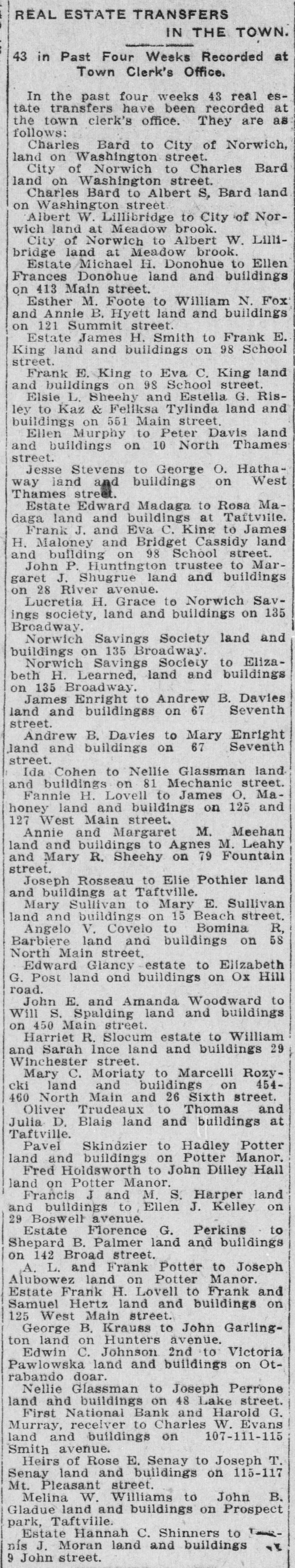 REAL ESTATE TRANSFERS IN THE TOWN. 43 in Past Four Weeks Recorded at Town Clerk's Office. In the past four weeks 43 real estate transfers have been recorded at the town clerk's office. They are as follows: Charles Bard to City of Norwich, land on Washington street. City of Norwich to Charles Bard land on Washington street. Charles Bard to Albert S, Bard land on Washington street Albert W. Lillibridge to City of Norwich land at Meadow brook. City of Norwich to Albert W. Lillibridge land at Meadow brook. Estate Michael H. Donohue to Ellen Frances Donohue land and buildings on 413 Main street. Esther M. Foote to William N. Fox and Annie B. Hyett land and buildings on 121 Summit street. Estate James H. Smith to Frank E. King land and buildings on 98 School street. Frank E. King to Eva C. King land and buildings on 98 School street. Elsie L. Sheehy and Estella G. Risley to Kaz & Feliksa Tylinda land and buildings on 551 Main street, Ellen Murphy to Peter Davis land and buildings on 10 North Thames street. Jesse Stevens to George O. Hathaway land and buildings on West Thames street. Estate Edward Madaga to Rosa Madaga land and buildings at Taftville. Frank J. and Eva C. King to James H. Maloney and Bridget Cassidy land and building on 98 School street. John P. Huntington trustee to Margaret J. Shugrue land and buildings on 28 River avenue. Lucretia H. Grace to Norwich Savings society, land and buildings on 135 Broadway. Norwich Savings Society land and buildings on 135 Broadway. Norwich Savings Society to Elizabeth H. Learned, land and buildings on 135 Broadway. James Enright to Andrew B. Davies Seventh land and buildingss on 67 street. Andrew B. Davies to Mary Enright land and buildings on 67 Seventh street. Ida Cohen to Nellie Glassman land and buildings on 81 Mechanic street. Fannie H. Lovell to James O. Mahoney land and buildings on 125 and 127 West Main street. Annie and Margaret M. Meehan land and buildings to Agnes M. Leahy and Mary R. Sheehy on 79 Fountain street. Joseph Rosseau to Elie Pothier land and buildings at Taftville. Mary Sullivan to Mary E. Sullivan land and buildings on 15 Beach street. Angelo V. Covelo to Bomina R. Barbiere land and buildings on 58 North Main street, Edward Glancy estate to Eiizabeth G. Post land ond buildings on Ox Hill road. John E. and Amanda Woodward to Will S. Spalding land and buildings on 450 Main street. Harriet R. Slocum estate to William and Sarah Ince land and buildings 29 Winchester street. Mary C. Moriaty to Marcelli Rozycki land and buildings on 454460 North Main and 26 Sixth street. Oliver Trudeaux to Thomas and Julia D. Blais land and buildings at Taftville. Pavel Skindzier to Hadley Potter land and buildings on Potter Manor, Fred Holdsworth to John Dilley Hall land on Potter Manor. Francis J and M. S. Harper land and buildings to Ellen J. Kelley on 29 Boswell avenue. Estate Florence G. Perkins to Shepard B. Palmer land and buildings on 142 Broad street. A. L. and Frank Potter to Joseph Alubowez land on Potter Manor. Estate Frank H. Lovell to Frank and Samuel Hertz land and buildings on 125 West Main street. George B. Krauss to John Garlington land on Hunters avenue. Edwin C. Johnson 2nd to Victoria Pawlowska land and buildings on Otrabando doar. Nellie Glassman to Joseph Perrone land and buildings on 48 Lake street. First National Bank and Harold G. Murray, receiver to Charles W. Evans land and buildings on 107-111-115 Smith avenue. Heirs of Rose E. Senay to Joseph T. Senay land and buildings on 115-117 Mt. Pleasant street, Melina W. Williams to John B. Gladue land and buildings on Prospect park, Taftville. Estate Hannah C. Shinners to T nis J. Moran land and buildings " 9 John street.