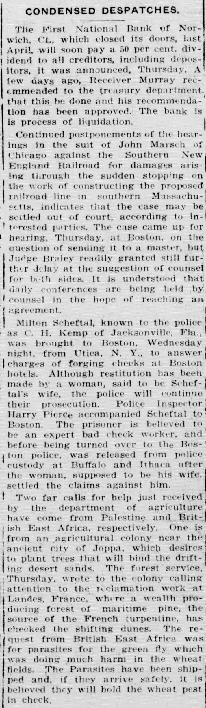 CONDENSED DESPATCHES. The First National Bank of Norwich, Ct., which closed its doors, last April, will soon pay a 50 per cent. dividend to all creditors, including depositors, it was announced, Thursday. A few days ago, Receiver Murray recommended to the treasury department. that this be done and his recommendation has been approved. The bank is is process of liquidation. Continued postponements of the hearings in the suit of John Marsch of Chicago against the Southern New England Railroad for damages arising through the sudden stopping on the work of constructing the proposed railroad line in southern Massachusctts, indicates that the case may be settled out of court, according to interested parties. The case came up for hearing, Thursday, at Boston, on the question of sending it to a master, but Judge Braley readily granted still further delay at the suggestion of counsel for both sides. It is understood that daily conferences are being held by counsel in the hope of reaching an agreement. Milton Scheftal, known to the police as C. H. Kemp of Jacksonville, Fla., was brought to Boston, Wednesday night, from Utica, N. Y., to answer charges of forging checks at Boston hotels. Although restitution has been made by a woman, said to be Scheftal's wife, the police will continue their prosecution. Police Inspector Harry Pierce accompanied Scheftal to Boston. The prisoner is believed to be an expert bad check worker, and before being turned over to the Boston police, was released from police custody at Buffalo and Ithaca after the woman, supposed to be his wife, settled the claims against him. Two far calls for help just received by the department of agrículture have come from Palestine and British East Africa, respectively. One is from an agricultural colony near the ancient city of Joppa, which desires to plant trees that will bind the drifting desert sands. The forest service, Thursday, wrote to the colony calling attention to the reclamation work at Landes, France, where a wealth producing forest of maritime pine, the source of the French turpentine, has checked the shifting dunes. The request from British East Africa was for parasites for the green fly which was doing much harm in the wheat fields. The Parasites have been shipped and, if they arrive safely. it is believed they will hold the wheat pest in check,