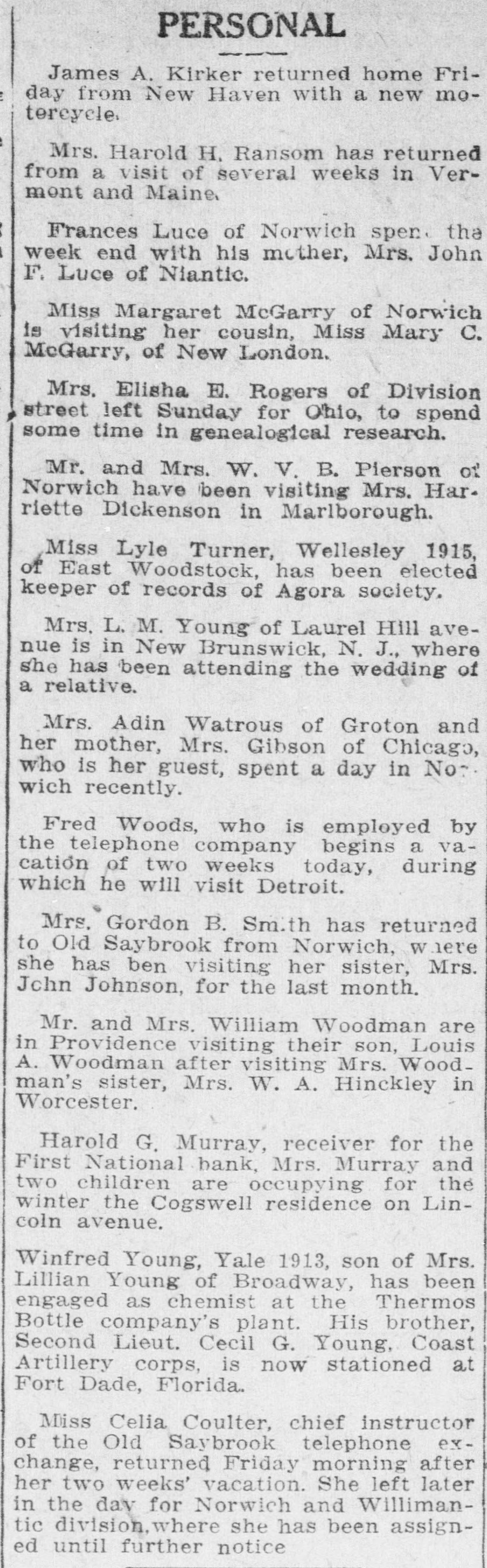 PERSONAL James A. Kirker returned home Friday from New Haven with a new motercycle. Mrs. Harold H. Ransom has returned from a visit of several weeks in Vermont and Maine, Frances Luce of Norwich spen. the week end with his mother, Mrs. John F. Luce of Niantic. Miss Margaret McGarry of Norwich is visiting her cousin, Miss Mary C. McGarry, of New London. Mrs. Elisha E. Rogers of Division street left Sunday for Ohio, to spend some time in genealogical research. Mr. and Mrs. W. V. B. Pierson of Norwich have been visiting Mrs. Har. riette Dickenson in Marlborough. Miss Lyle Turner, Wellesley 1915, of East Woodstock, has been elected keeper of records of Agora society. Mrs. L. M. Young of Laurel Hill avenue is in New Brunswick, N. J., where she has been attending the wedding of a relative. Mrs. Adin Watrous of Groton and her mother, Mrs. Gibson of Chicago, who is her guest, spent a day in No. wich recently. Fred Woods, who is employed by the telephone company begins a vacation of two weeks today, during which he will visit Detroit. Mrs. Gordon B. Sm.th has returned to Old Saybrook from Norwich, where she has ben visiting her sister, Mrs. Jchn Johnson, for the last month. Mr. and Mrs. William Woodman are in Providence visiting their son, Louis A. Woodman after visiting Mrs. Woodman's sister, Mrs. W. A. Hinckley in Worcester. Harold G. Murray, receiver for the First National bank, Mrs. Murray and two children are occupying for the winter the Cogswell residence on Lincoln avenue. Winfred Young, Yale 1913, son of Mrs. Lillian Young of Broadway, has been engaged as chemist at the Thermos Bottle company's plant. His brother, Second Lieut. Cecil G. Young, Coast Artillery corps, is now stationed at Fort Dade, Florida. Miss Celia Coulter, chief instructor of the Old Saybrook telephone exchange, returned Friday morning after her two weeks' vacation. She left later in the day for Norwich and Willimantic division. where she has been assigned until further notice