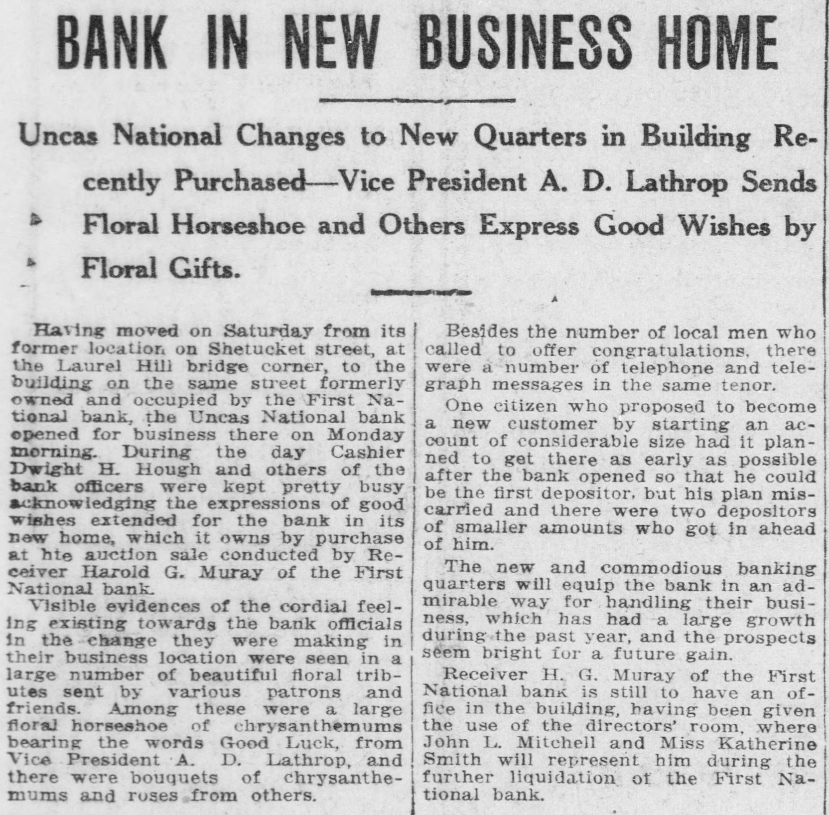 IN NEW BUSINESS HOME BANK ReUncas National Changes to New Quarters in Building cently Purchased -Vice President A. D. Lathrop Sends Floral Horseshoe and Others Express Good Wishes by Floral Gifts. Besides the number of local men who Having moved on Saturday from its former location on Shetucket street, at called to offer congratulations, there the Laurel Hill bridge corner, to the were a number of telephone and telebuilding on the same street formerly graph messages in the same tenor. owned and occupied by the First NaOne citizen who proposed to become tional bank, the Uncas National bank a new customer by starting an acopened for business there on Monday count of considerable size had it planmorning. During the day Cashier ned to get there as early as possible Dwight H. Hough and others of the after the bank opened so that he could bank officers were kept pretty busy be the first depositor, but his plan misacknowledging the expressions of good carried and there were two depositors wishes extended for the bank in its of smaller amounts who got in ahead new home, which it owns by purchase of him. at hte auction sale conducted by ReThe new and commodious banking ceiver Harold G. Muray of the First quarters will equip the bank in an adNational bank. mirable way for handling their busiVisible evidences of the cordial feelness, which has had a large growth ing existing towards the bank officials during the past year, and the prospects in the change they were making in seem bright for a future gain. their business location were seen in a large number of beautiful floral tribReceiver H. G. Muray of the First National bank is still to have an ofutes sent by various patrons and friends. Among these were a large fice in the building, having been given floral horseshoe of ehrysanthemums the use of the directors' room, where John L. Mitchell and Miss Katherine bearing the words Good Luck, from Vice President A. D. Lathrop, and Smith will represent him during the further liquidation of the First Nathere were bouquets of chrysanthetional bank. mums and roses from others.