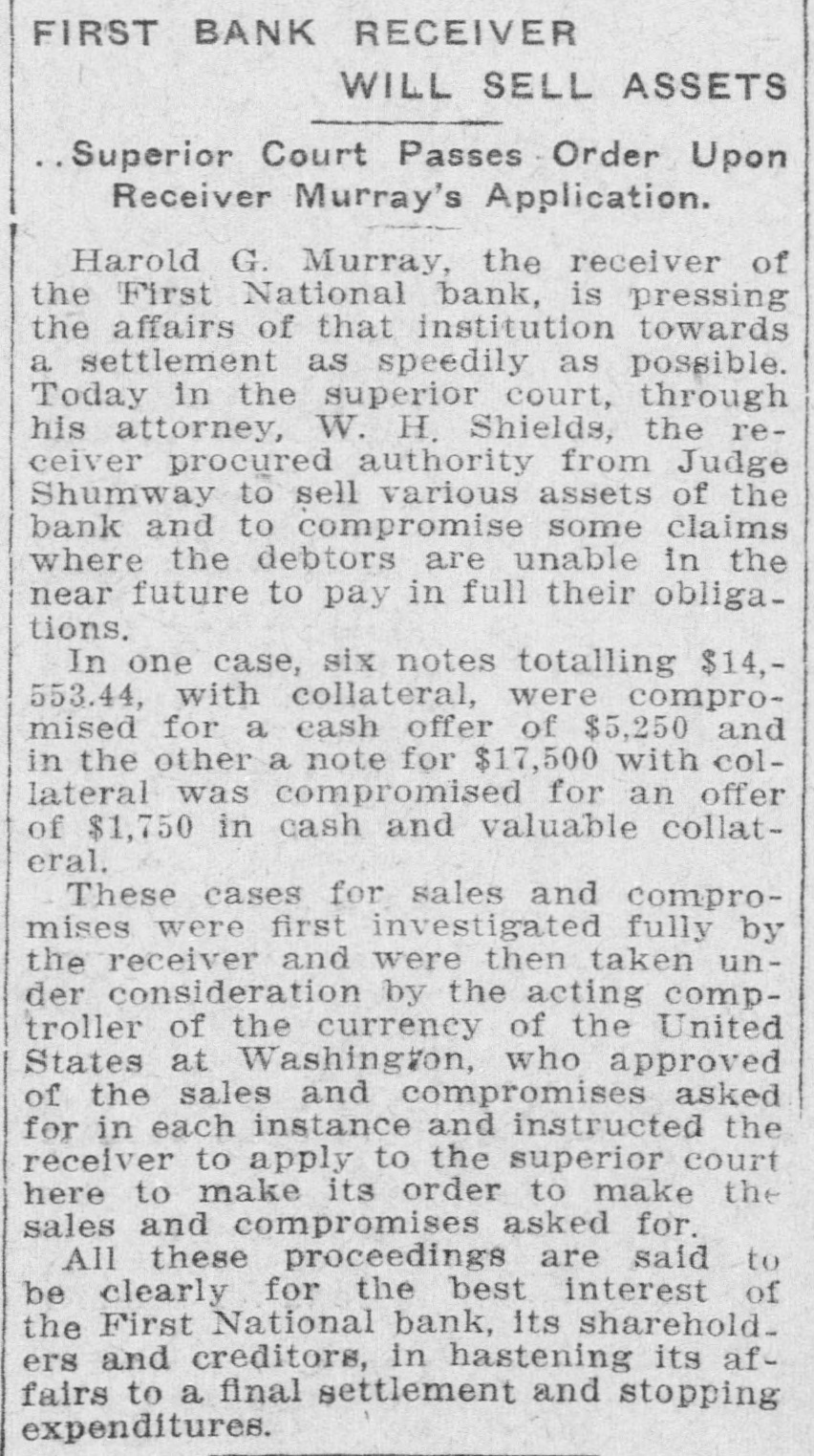 FIRST BANK RECEIVER WILL SELL ASSETS Superior Court Passes - Order Upon Receiver Murray's Application. Harold G. Murray, the receiver of the First National bank, is pressing the affairs of that institution towards a settlement as speedily as possible. Today in the superior court, through his attorney, W. H. Shields, the receiver procured authority from Judge Shumway to sell various assets of the bank and to compromise some claims where the debtors are unable in the near future to pay in full their obligations. In one case, six notes totalling $14,553.44, with collateral, were compromised for a cash offer of $5,250 and in the other a note for $17,500 with collateral was compromised for an offer of $1,750 in cash and valuable collateral. These cases for sales and compromises were first investigated fully by the receiver and were then taken under consideration by the acting comptroller of the currency of the United States at Washington, who approved of the sales and compromises asked for in each instance and instructed the receiver to apply to the superior court here to make its order to make the sales and compromises asked for. All these proceedings are said to be clearly for the best interest of the First National bank, its sharehold. ers and creditors, in hastening its affairs to a final settlement and stopping expenditures.