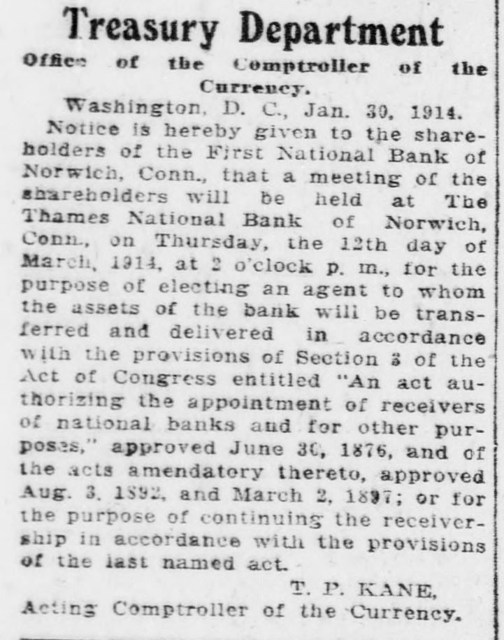 Treasury Department Office of the Comptroller of the Currency. Washington, D. C., Jan. 30, 1914. Notice is hereby given to the shareholders of the First National Bank of Norwich, Conn., that a meeting of the shareholders will be held at The Thames National Bank of Norwich, Conn., on Thursday, the 12th day of March, 1914, at 2 o'clock p. m., for the purpose of electing an agent to whom the assets of the bank will be transferred and delivered in accordance with the provisions of Section 3 of the Act of Congress entitled "An act authorizing the appointment of receivers of national banks and for other purposes," approved June 30, 1876, and of the acts amendatory thereto, approved Aug. 3. 1892, and March 2. 1897; or for the purpose of continuing the receivership in accordance with the provisions of the last named act. I. P. KANE, Acting Comptroller of the Currency.