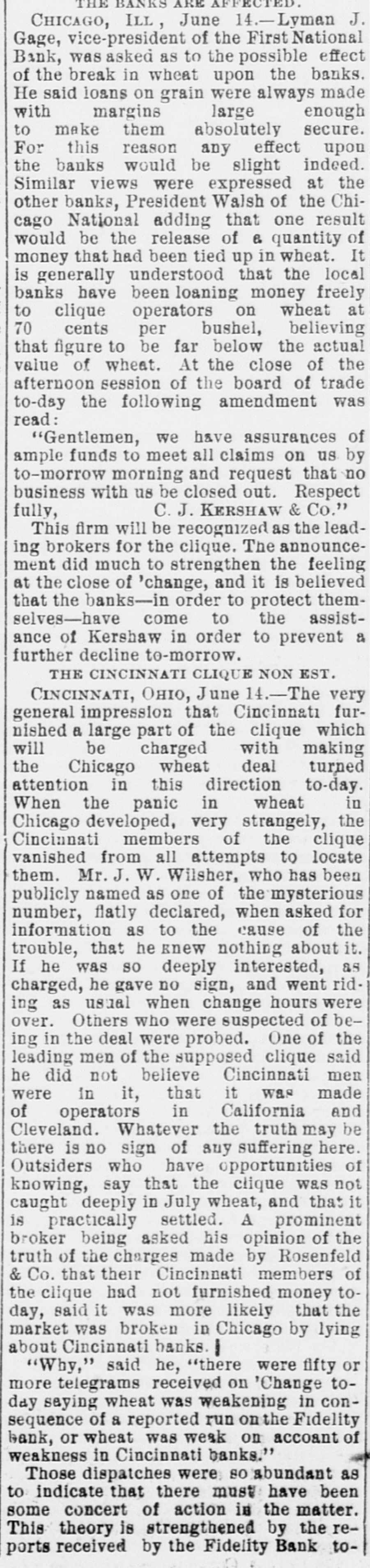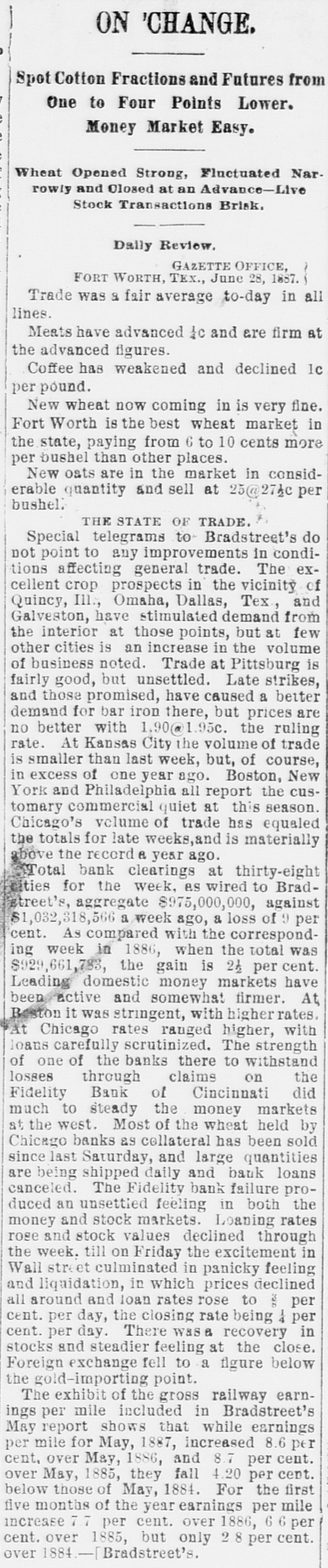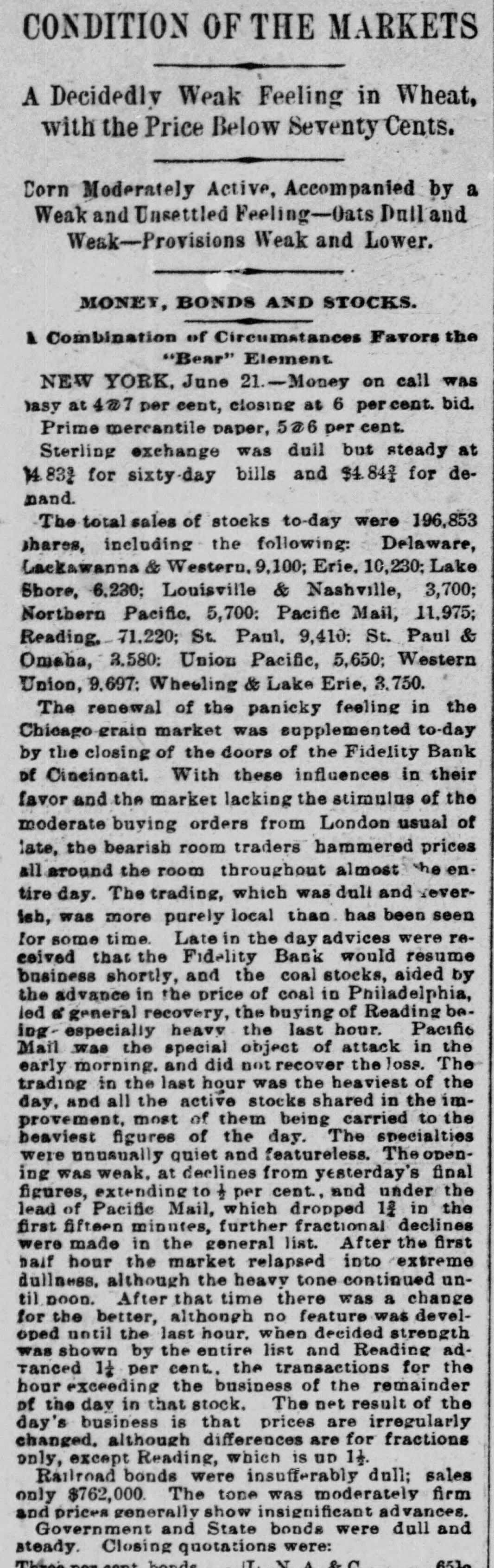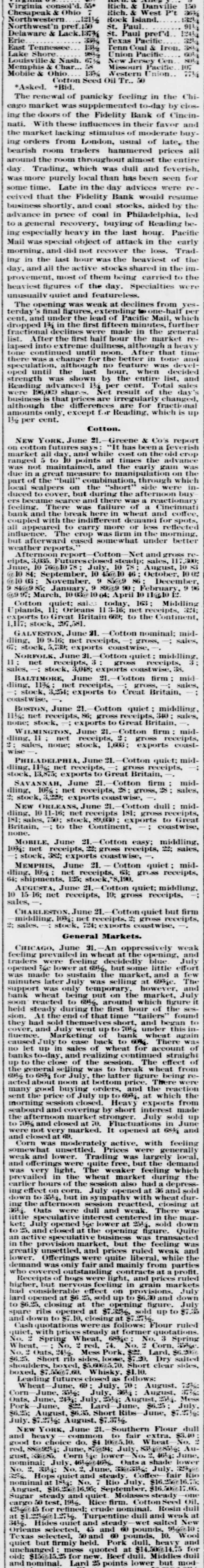 Erie Texas Pacific 396 324 East Tennessee 1314 l'enn Coal & Iron. 3814 Lake Shore Union Pacific 981/2 60% Louisville & Nash. 671/8 New Jersey Cen 804 Memphis & Char... 58 Missouri Pacific. 107 Mobile & Ohio 1396 Western nion. 7734 Cotton Seed Oil Tr.. 50 *Asked. +Bid. The renewal of panicky feeling in the Chicago market was supplemented to-day by closing the doors of the Fidelity Bank of Cincinnati. With these influences in their favor and the market lacking stimulus of moderate buy ing orders from London, usual of late, the bearish room traders hammered prices all around the room throughout almost the entire day Trading, which was dull and feverish. was more purely local than has been seen for some time. Late in the day advices were received that the Fidelity Bank would resume business shortly, and coal stocks, aided by the advance in price of coal in Philadelphia, led to a general recovery, buying of Reading being especially heavy in the last hour. Pacific Mail was special object of attack in the early morning, and did not recover the loss. Trading in the last hour was the heaviest of the day. and all the active stocks shared in the improvement, most of them being carried to the heaviest figures of the day. Specialties were unusually quiet and featureless. The opening was weak at declines from yes. terday final figures, ading to one-half per cent, and under the lead of Pacific Mail, which dropped 14 in the first fifteen minutes, further fractional declines were made in the general list. After the first half hour the market relapsed into extreme dullness, although a heavy tone continued until noon. After that time there was a change for the better in tone and speculation, although no feature was developed until the last hour, when decided strength was shown by the entire list, and Reading vanced 11/4 per cent. Total sales were 196,000 shares. Net result of the day's business is that prices are irregularly changed, although the differences are for fractional amounts only, except for Reading, which is up 11/2 per cent. Cotton. NEW YORK. June Greene & Co's report on cotton futures says "It has beena feverish market all day, and while cost on the old erop ranged to 10 points at times the advance was not maintained, and the early gain was due in great measure to manipulation on the part of the "bull" combination, through which local scalpers on the "short" side were induced to cover, but during the afternoon buy ers became scarce and there was a reactionary feeling. There was failure of a Cincinnati bank and the break here in wheat and coffee, coupled with the indifferent demand for spots, all appeared to earry more or less reflected influence. The erop was firm in the morning. but afterward eased somewhat under better weather reports. Afternoon report Cotton Net and gross reeipts, 3,035. Futuresclosed steadp; sales, 11 Jnue, 10 76@10 78 July 10 78 August, 10 83 @ 10 84; September, 10 45@10 46 October, 10 02 @10 03 November. 9 85@9 86 December, 9 84@9 85; January, 9 89@9 90 February, 9 96 @997; March, 1003@ 10 04; April 10 11@10 Cotton quiet; sales today 163 Middling Uplands, 11; Orleans 11 3-16; net receipts, 324; exports to Great Britain 669; to the Continent, 1,117; stock, 297,581. GALVESTON, June 21. Cotton nominal: middling, 10 9-16; net receipts, gross, -; sales, 67: stock, 5,739; exports coastwise, NORFOLK, June 31. Cotton quiet: middling. 11: net receipts, 3 gross receipts, 3: sales, stock, 3,048; exports coastwise, 38. BALTIMORE, June 21. Cotton firm mid dling, 11% net receipts, gross, sales, stock, 3,254; exports to Creat Britain, coastwise, BOSTON, June 21. Cotton quiet middling, 11½; net receipts, 86; gross receipts, 340 sales, none; stock, exports to Great Britain, WILMINGTON, June 21. Cotton firm middling, 11 net receipts, 2: gross receipts, : sales, none; stock, 1,603; exports coastwise PHILADELPHIA, June 21. Cotton quiet: middling, 11%; net receipts, gross receipts, stock, 13,875; exports to Great Britain, SAVANNAH, June 21. Cotton firm middling, 10% net receipts, 28; gross, 28 sales, : stock, 3,229; exports coastwise, NEW ORLEANS, June 21. Cotton dull middling, 10 11-16; net receipts 181; gross receipts, 181: sales, 750; stock, 89,030; exports to Great Britain, to the Continent, coastwise, none. MOBILE, June 21.- Cotton easy; middling, 1034: net receipts, 2: gross receipts, = sales, i stock, 382: exports coastwise, MEMPHIS, June 21. Cotton quiet middling, 104 net receipts, 63; gross receipts, 64; shipments, 125; stock,"8,190. AUGUSTA, June 21. Cotton quiet; middling, 10 15 16; net receipts, 10; gross receipts, sales, CHARLESTON. June 21. Cotton quiet but firm middling, 10%; net receipts, = gross receipts, 2: sales. stock, 724; exports coastwise, General Markets. CHICAGO, June 31.-An oppressively weak feeling prevailed in wheat at the opening, and traders were feeling decidedly blue July opened 3/4e lower at 69%, but some little effort was made to sustain the market, and a few minutes later July was selling at 69%c. The support was only temporary, however, and bank wheat being put on the market, July soon reacted to 69%, around which figure it held steady during the first hour of the session. At the end of that time "tailers" found they had sold themselves short, and began to cover, and July went up to 70% under this influence. Marketing bank wheat again caused July to ease back to 60% There was no let up in sales of wheat for account of banks to-day, and realizing continued straight up to the close of the session. The effect of the general selling was to break wheat from 6916 to 6834 for July, the latter figure being reacted about noon at bottom price. There were many good buying orders, and the reaction sent the price of July up to 69%, at which the morning session closed. Heavy exports from seaboard and covering by short interest made the afternoon market stronger. July sold up to 70% and closed at 20. Fluctuations in June were not very marked. It opened at 68% and 69. an