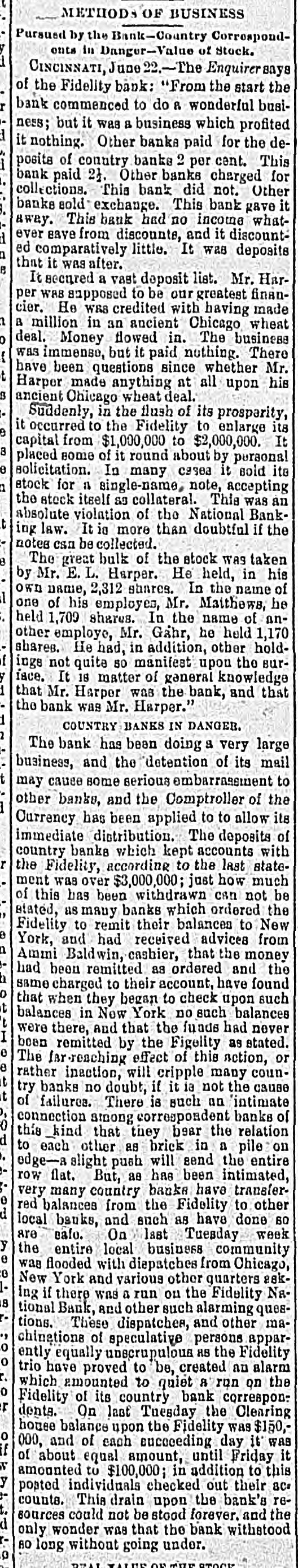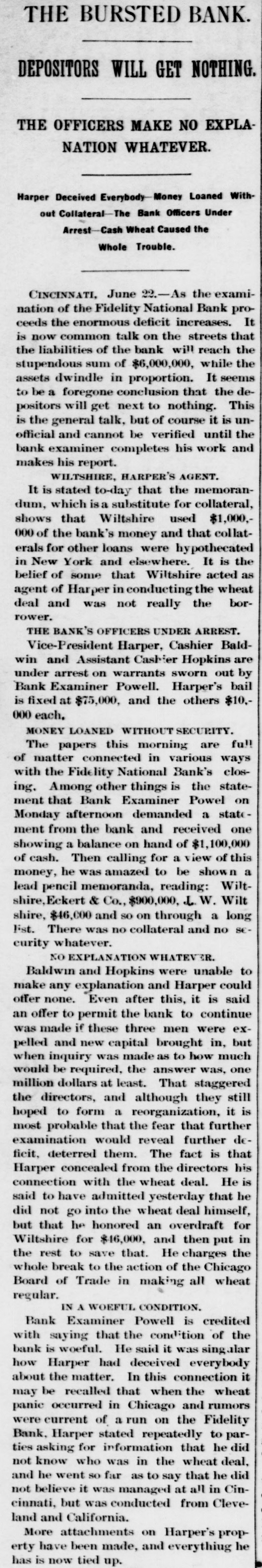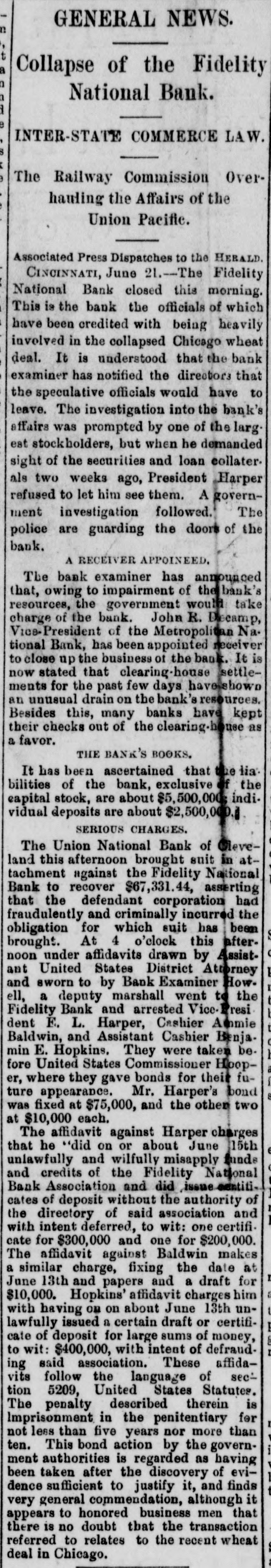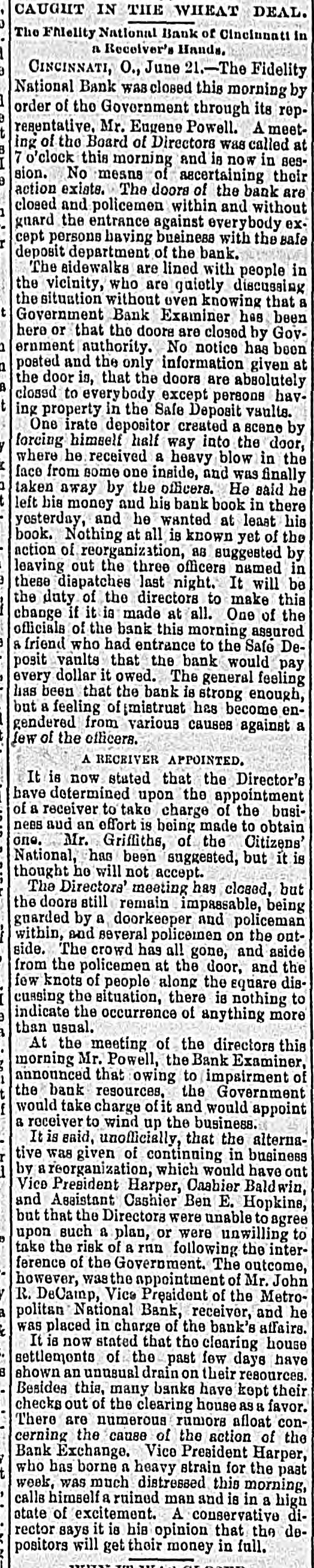 Erie Texas Pacific 396 324 East Tennessee 1314 l'enn Coal & Iron. 3814 Lake Shore Union Pacific 981/2 60% Louisville & Nash. 671/8 New Jersey Cen 804 Memphis & Char... 58 Missouri Pacific. 107 Mobile & Ohio 1396 Western nion. 7734 Cotton Seed Oil Tr.. 50 *Asked. +Bid. The renewal of panicky feeling in the Chicago market was supplemented to-day by closing the doors of the Fidelity Bank of Cincinnati. With these influences in their favor and the market lacking stimulus of moderate buy ing orders from London, usual of late, the bearish room traders hammered prices all around the room throughout almost the entire day Trading, which was dull and feverish. was more purely local than has been seen for some time. Late in the day advices were received that the Fidelity Bank would resume business shortly, and coal stocks, aided by the advance in price of coal in Philadelphia, led to a general recovery, buying of Reading being especially heavy in the last hour. Pacific Mail was special object of attack in the early morning, and did not recover the loss. Trading in the last hour was the heaviest of the day. and all the active stocks shared in the improvement, most of them being carried to the heaviest figures of the day. Specialties were unusually quiet and featureless. The opening was weak at declines from yes. terday final figures, ading to one-half per cent, and under the lead of Pacific Mail, which dropped 14 in the first fifteen minutes, further fractional declines were made in the general list. After the first half hour the market relapsed into extreme dullness, although a heavy tone continued until noon. After that time there was a change for the better in tone and speculation, although no feature was developed until the last hour, when decided strength was shown by the entire list, and Reading vanced 11/4 per cent. Total sales were 196,000 shares. Net result of the day's business is that prices are irregularly changed, although the differences are for fractional amounts only, except for Reading, which is up 11/2 per cent. Cotton. NEW YORK. June Greene & Co's report on cotton futures says "It has beena feverish market all day, and while cost on the old erop ranged to 10 points at times the advance was not maintained, and the early gain was due in great measure to manipulation on the part of the "bull" combination, through which local scalpers on the "short" side were induced to cover, but during the afternoon buy ers became scarce and there was a reactionary feeling. There was failure of a Cincinnati bank and the break here in wheat and coffee, coupled with the indifferent demand for spots, all appeared to earry more or less reflected influence. The erop was firm in the morning. but afterward eased somewhat under better weather reports. Afternoon report Cotton Net and gross reeipts, 3,035. Futuresclosed steadp; sales, 11 Jnue, 10 76@10 78 July 10 78 August, 10 83 @ 10 84; September, 10 45@10 46 October, 10 02 @10 03 November. 9 85@9 86 December, 9 84@9 85; January, 9 89@9 90 February, 9 96 @997; March, 1003@ 10 04; April 10 11@10 Cotton quiet; sales today 163 Middling Uplands, 11; Orleans 11 3-16; net receipts, 324; exports to Great Britain 669; to the Continent, 1,117; stock, 297,581. GALVESTON, June 21. Cotton nominal: middling, 10 9-16; net receipts, gross, -; sales, 67: stock, 5,739; exports coastwise, NORFOLK, June 31. Cotton quiet: middling. 11: net receipts, 3 gross receipts, 3: sales, stock, 3,048; exports coastwise, 38. BALTIMORE, June 21. Cotton firm mid dling, 11% net receipts, gross, sales, stock, 3,254; exports to Creat Britain, coastwise, BOSTON, June 21. Cotton quiet middling, 11½; net receipts, 86; gross receipts, 340 sales, none; stock, exports to Great Britain, WILMINGTON, June 21. Cotton firm middling, 11 net receipts, 2: gross receipts, : sales, none; stock, 1,603; exports coastwise PHILADELPHIA, June 21. Cotton quiet: middling, 11%; net receipts, gross receipts, stock, 13,875; exports to Great Britain, SAVANNAH, June 21. Cotton firm middling, 10% net receipts, 28; gross, 28 sales, : stock, 3,229; exports coastwise, NEW ORLEANS, June 21. Cotton dull middling, 10 11-16; net receipts 181; gross receipts, 181: sales, 750; stock, 89,030; exports to Great Britain, to the Continent, coastwise, none. MOBILE, June 21.- Cotton easy; middling, 1034: net receipts, 2: gross receipts, = sales, i stock, 382: exports coastwise, MEMPHIS, June 21. Cotton quiet middling, 104 net receipts, 63; gross receipts, 64; shipments, 125; stock,"8,190. AUGUSTA, June 21. Cotton quiet; middling, 10 15 16; net receipts, 10; gross receipts, sales, CHARLESTON. June 21. Cotton quiet but firm middling, 10%; net receipts, = gross receipts, 2: sales. stock, 724; exports coastwise, General Markets. CHICAGO, June 31.-An oppressively weak feeling prevailed in wheat at the opening, and traders were feeling decidedly blue July opened 3/4e lower at 69%, but some little effort was made to sustain the market, and a few minutes later July was selling at 69%c. The support was only temporary, however, and bank wheat being put on the market, July soon reacted to 69%, around which figure it held steady during the first hour of the session. At the end of that time "tailers" found they had sold themselves short, and began to cover, and July went up to 70% under this influence. Marketing bank wheat again caused July to ease back to 60% There was no let up in sales of wheat for account of banks to-day, and realizing continued straight up to the close of the session. The effect of the general selling was to break wheat from 6916 to 6834 for July, the latter figure being reacted about noon at bottom price. There were many good buying orders, and the reaction sent the price of July up to 69%, at which the morning session closed. Heavy exports from seaboard and covering by short interest made the afternoon market stronger. July sold up to 70% and closed at 20. Fluctuations in June were not very marked. It opened at 68% and 69. an