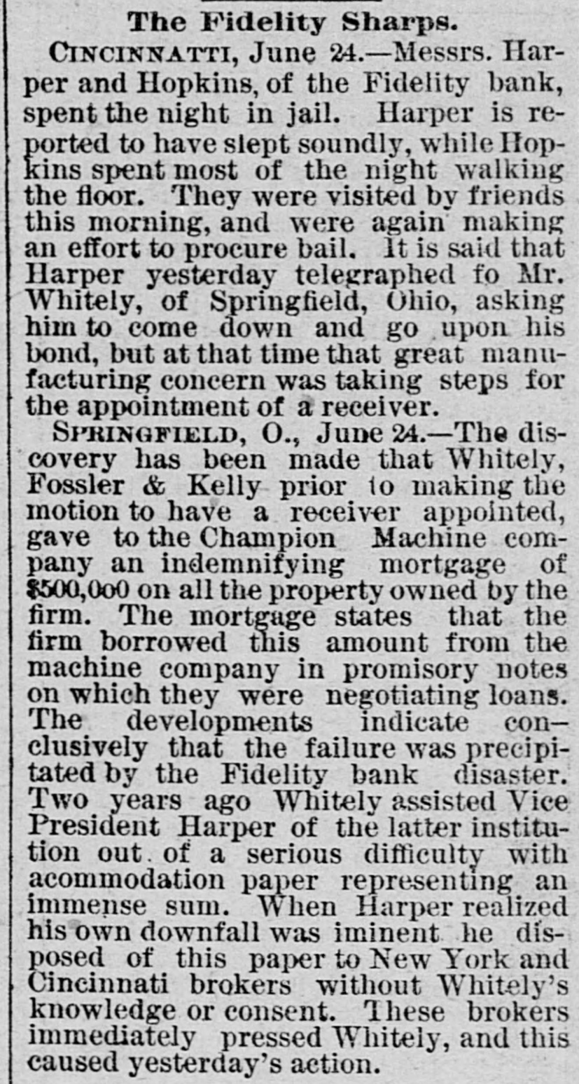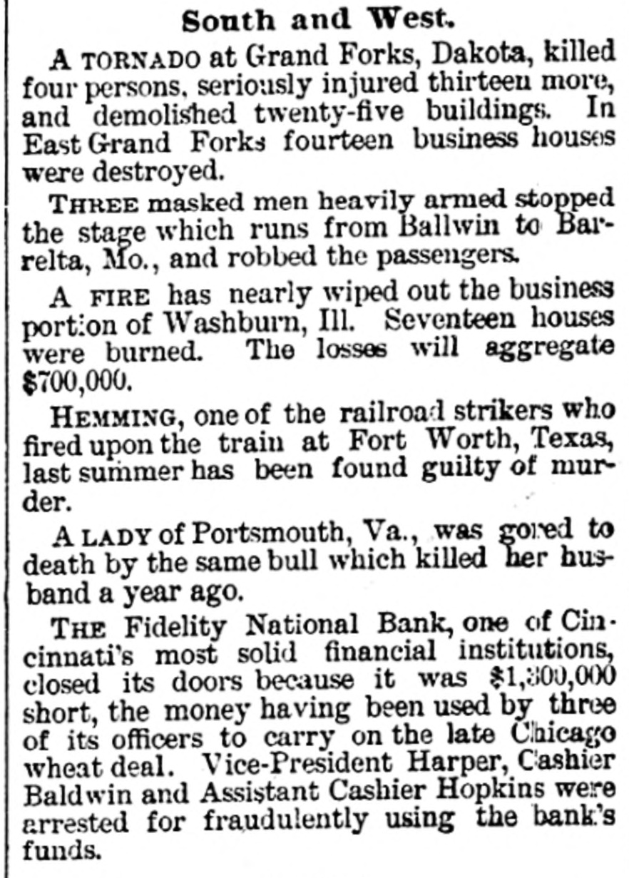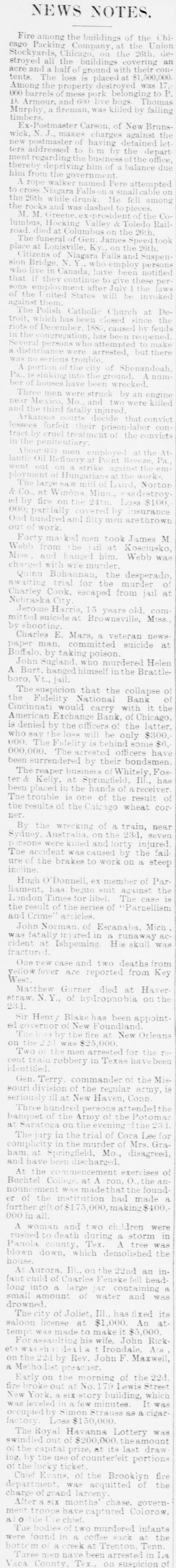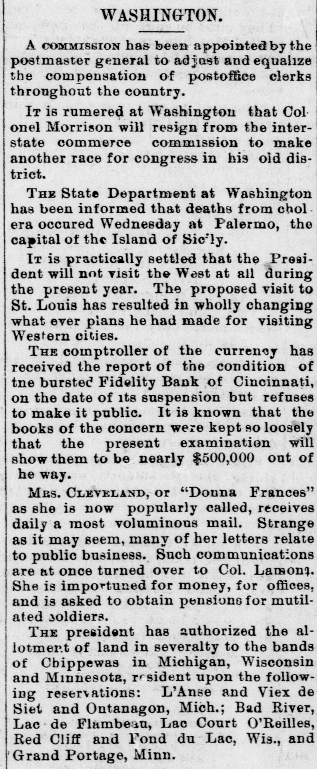 Erie Texas Pacific 396 324 East Tennessee 1314 l'enn Coal & Iron. 3814 Lake Shore Union Pacific 981/2 60% Louisville & Nash. 671/8 New Jersey Cen 804 Memphis & Char... 58 Missouri Pacific. 107 Mobile & Ohio 1396 Western nion. 7734 Cotton Seed Oil Tr.. 50 *Asked. +Bid. The renewal of panicky feeling in the Chicago market was supplemented to-day by closing the doors of the Fidelity Bank of Cincinnati. With these influences in their favor and the market lacking stimulus of moderate buy ing orders from London, usual of late, the bearish room traders hammered prices all around the room throughout almost the entire day Trading, which was dull and feverish. was more purely local than has been seen for some time. Late in the day advices were received that the Fidelity Bank would resume business shortly, and coal stocks, aided by the advance in price of coal in Philadelphia, led to a general recovery, buying of Reading being especially heavy in the last hour. Pacific Mail was special object of attack in the early morning, and did not recover the loss. Trading in the last hour was the heaviest of the day. and all the active stocks shared in the improvement, most of them being carried to the heaviest figures of the day. Specialties were unusually quiet and featureless. The opening was weak at declines from yes. terday final figures, ading to one-half per cent, and under the lead of Pacific Mail, which dropped 14 in the first fifteen minutes, further fractional declines were made in the general list. After the first half hour the market relapsed into extreme dullness, although a heavy tone continued until noon. After that time there was a change for the better in tone and speculation, although no feature was developed until the last hour, when decided strength was shown by the entire list, and Reading vanced 11/4 per cent. Total sales were 196,000 shares. Net result of the day's business is that prices are irregularly changed, although the differences are for fractional amounts only, except for Reading, which is up 11/2 per cent. Cotton. NEW YORK. June Greene & Co's report on cotton futures says "It has beena feverish market all day, and while cost on the old erop ranged to 10 points at times the advance was not maintained, and the early gain was due in great measure to manipulation on the part of the "bull" combination, through which local scalpers on the "short" side were induced to cover, but during the afternoon buy ers became scarce and there was a reactionary feeling. There was failure of a Cincinnati bank and the break here in wheat and coffee, coupled with the indifferent demand for spots, all appeared to earry more or less reflected influence. The erop was firm in the morning. but afterward eased somewhat under better weather reports. Afternoon report Cotton Net and gross reeipts, 3,035. Futuresclosed steadp; sales, 11 Jnue, 10 76@10 78 July 10 78 August, 10 83 @ 10 84; September, 10 45@10 46 October, 10 02 @10 03 November. 9 85@9 86 December, 9 84@9 85; January, 9 89@9 90 February, 9 96 @997; March, 1003@ 10 04; April 10 11@10 Cotton quiet; sales today 163 Middling Uplands, 11; Orleans 11 3-16; net receipts, 324; exports to Great Britain 669; to the Continent, 1,117; stock, 297,581. GALVESTON, June 21. Cotton nominal: middling, 10 9-16; net receipts, gross, -; sales, 67: stock, 5,739; exports coastwise, NORFOLK, June 31. Cotton quiet: middling. 11: net receipts, 3 gross receipts, 3: sales, stock, 3,048; exports coastwise, 38. BALTIMORE, June 21. Cotton firm mid dling, 11% net receipts, gross, sales, stock, 3,254; exports to Creat Britain, coastwise, BOSTON, June 21. Cotton quiet middling, 11½; net receipts, 86; gross receipts, 340 sales, none; stock, exports to Great Britain, WILMINGTON, June 21. Cotton firm middling, 11 net receipts, 2: gross receipts, : sales, none; stock, 1,603; exports coastwise PHILADELPHIA, June 21. Cotton quiet: middling, 11%; net receipts, gross receipts, stock, 13,875; exports to Great Britain, SAVANNAH, June 21. Cotton firm middling, 10% net receipts, 28; gross, 28 sales, : stock, 3,229; exports coastwise, NEW ORLEANS, June 21. Cotton dull middling, 10 11-16; net receipts 181; gross receipts, 181: sales, 750; stock, 89,030; exports to Great Britain, to the Continent, coastwise, none. MOBILE, June 21.- Cotton easy; middling, 1034: net receipts, 2: gross receipts, = sales, i stock, 382: exports coastwise, MEMPHIS, June 21. Cotton quiet middling, 104 net receipts, 63; gross receipts, 64; shipments, 125; stock,"8,190. AUGUSTA, June 21. Cotton quiet; middling, 10 15 16; net receipts, 10; gross receipts, sales, CHARLESTON. June 21. Cotton quiet but firm middling, 10%; net receipts, = gross receipts, 2: sales. stock, 724; exports coastwise, General Markets. CHICAGO, June 31.-An oppressively weak feeling prevailed in wheat at the opening, and traders were feeling decidedly blue July opened 3/4e lower at 69%, but some little effort was made to sustain the market, and a few minutes later July was selling at 69%c. The support was only temporary, however, and bank wheat being put on the market, July soon reacted to 69%, around which figure it held steady during the first hour of the session. At the end of that time "tailers" found they had sold themselves short, and began to cover, and July went up to 70% under this influence. Marketing bank wheat again caused July to ease back to 60% There was no let up in sales of wheat for account of banks to-day, and realizing continued straight up to the close of the session. The effect of the general selling was to break wheat from 6916 to 6834 for July, the latter figure being reacted about noon at bottom price. There were many good buying orders, and the reaction sent the price of July up to 69%, at which the morning session closed. Heavy exports from seaboard and covering by short interest made the afternoon market stronger. July sold up to 70% and closed at 20. Fluctuations in June were not very marked. It opened at 68% and 69. an