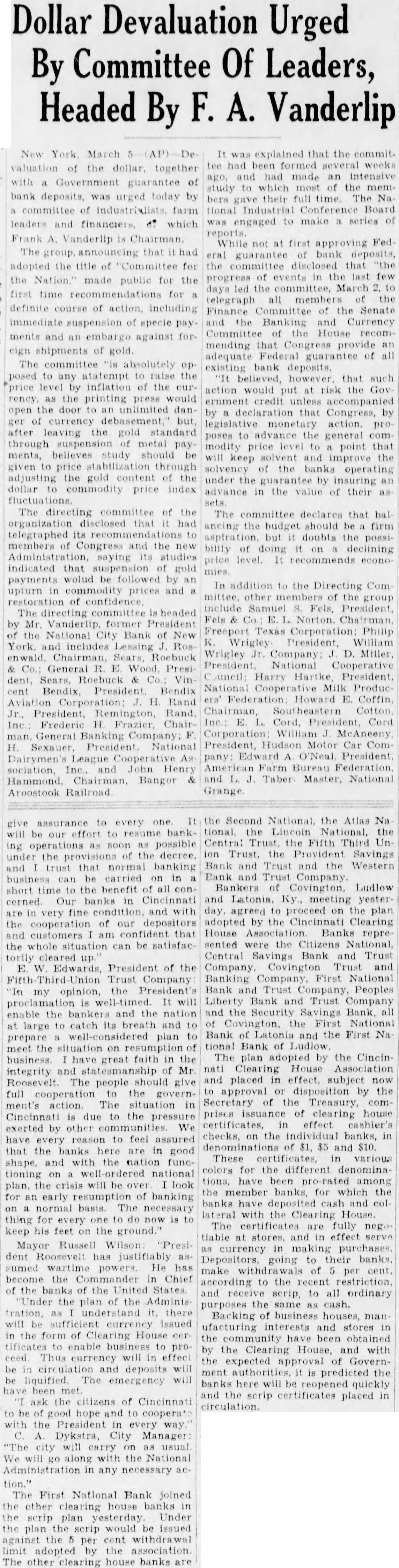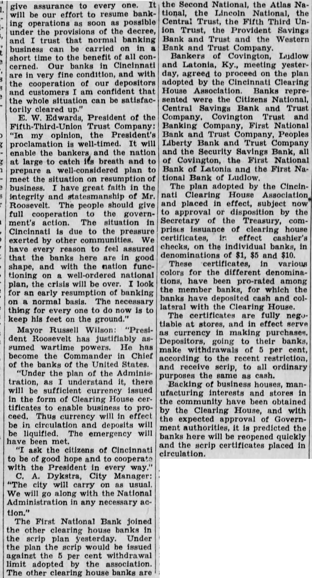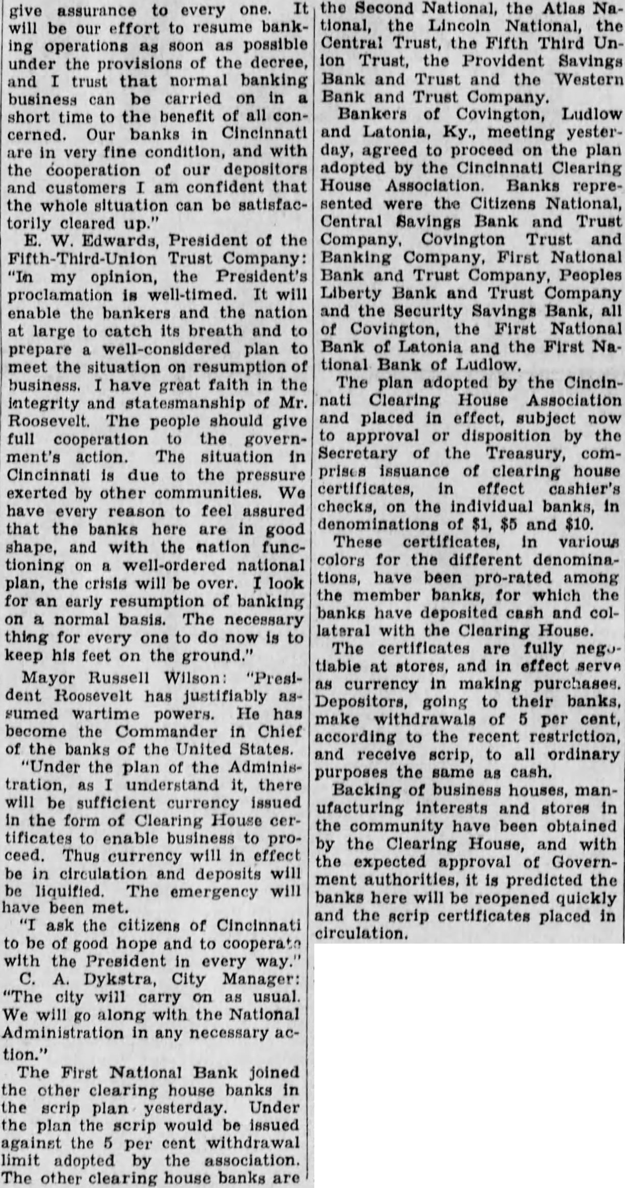 Bankers believe business quickly will adjust itself to the new conditions as make apparent. The first need, the bankers agree, in keeping business running is provide facilities for full payroll payments. E. Edwards, president of the Fifth Third Union Trust Co., said Tuesday he did not anticipate many firms will be unable to pay their employes in full. He explained that new deposits will not be subject to the per cent limitation and that these, with the per cent withdrawals allowed on money now in the bank, will be sufficient to meet payrolls most It was learned that firms large on deposit, but with insufficient amounts to meet will be loans. Special allowances, as far practicable, will be made to give demands for payrolls preference, bankers indicated. Mr. Edwards said he anticipates no decrease in the amount of new deposits, emphasizing the fact that money now safer in the banks before. The the he requires that the banks hold the deposits in cash or in erty Bonds.