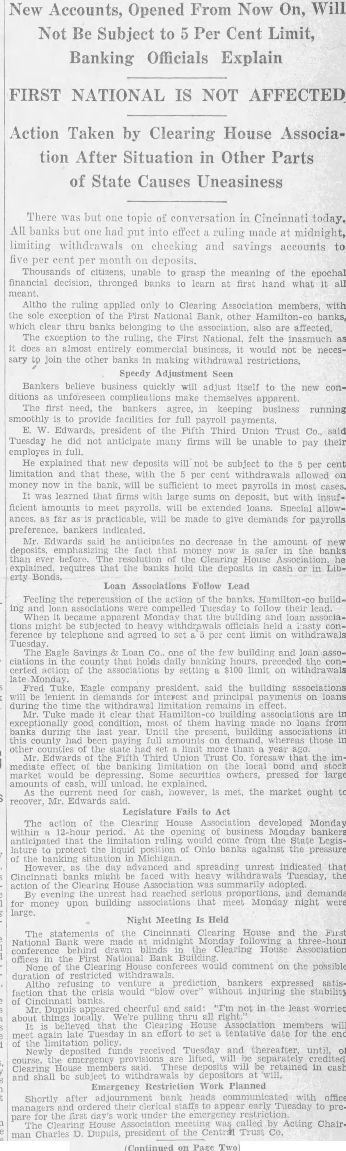 There was but one topic of conversation in Cincinnati today. All banks but one had put into effect a ruling made at midnight, limiting withdrawals on checking and savings accounts to five per cent per month on deposits. Thousands of citizens, unable to grasp the meaning of the epochal financial decision, thronged banks learn first hand what all to at it meant. Altho the ruling applied only to Clearing Association members, with the sole of the First Bank, other Hamilton-co banks, which clear thru belonging to the association, also are affected. The exception to the ruling, the First National, felt the inasmuch as it does an almost entirely commercial business, would not be necessary join the other banks in making withdrawal restrictions. Speedy Adjustment Seen