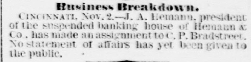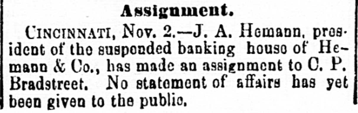 Assignment. CINCINNATI, Nov. 2.-J. A. Hemann. pres. ident of the susponded banking house of Hemann & Co., has made an assignment to C.P. Bradstreet. No statement of affairs has yet been given to the public.