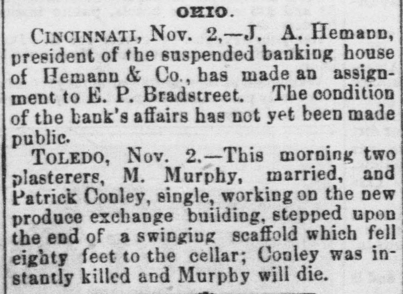 OHIO. CINCINNATI, Nov. 2,-J. A. Hemann, president of the suspended banking house of Hemann & Co., has made an assignment to E. P. Bradstreet. The condition of the bank's affairs has not yet been made public. TOLEDO, Nov. 2.-This morning two plasterers, M. Murphy, married, and Patrick Conley, single, working on the new produce exchange building, stepped upon the end of a swinging scaffold which fell eighty feet to the cellar; Conley was instantly killed and Murphy will die.