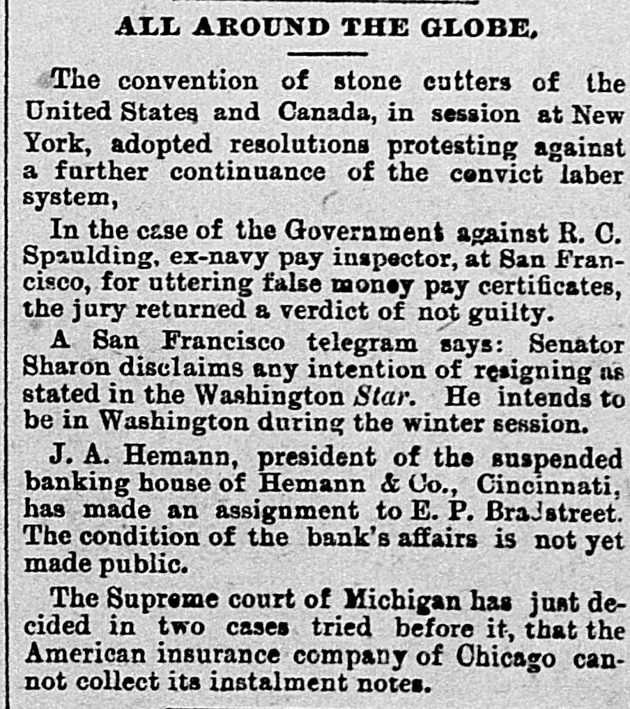 ALL AROUND THE GLOBE, The convention of stone cutters of the United States and Canada, in session at New York, adopted resolutions protesting against a further continuance of the convict laber system, In the case of the Government against R. C. Spaulding, ex-navy pay inspector, at San Francisco, for uttering false money pay certificates, the jury returned a verdict of not guilty. A San Francisco telegram says: Senator Sharon disclaims any intention of resigning as stated in the Washington Star. He intends to be in Washington during the winter session. J. A. Hemann, president of the suspended banking house of Hemann & Co., Cincinnati, has made an assignment to E. P. Bradstreet. The condition of the bank's affairs is not yet made public. The Supreme court of Michigan has just decided in two cases tried before it, that the American insurance company of Chicago cannot collect its instalment notes.