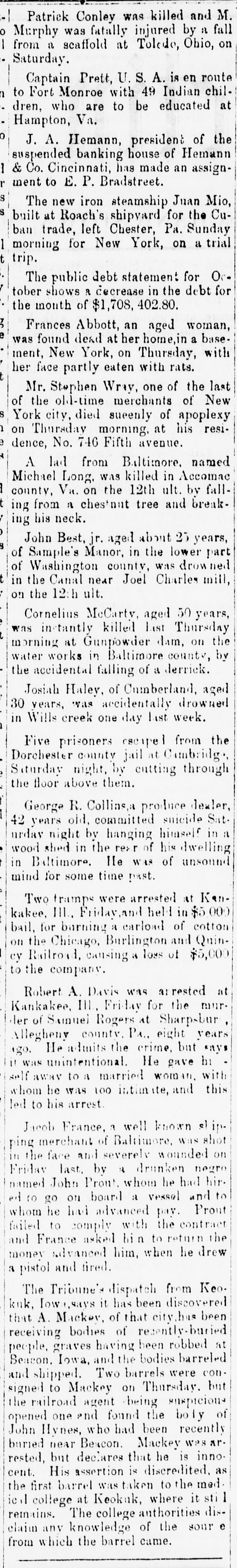 Patrick Conley was killed and M. Murphy was fatally injured by a fall from a scaffold at Toledo, Ohio, on Saturday. Captain Prett, U. S. A. is en route to Fort Monroe with 49 Indian children, who are to be educated at Hampton, Va. J. A. Hemann, president of the suspended banking house of Hemann 1 & Co. Cincinnati, has made an assignment to E. P. Bradstreet. The new iron steamship Juan Mio, built at Roach's shipvard for the Cuban trade, left Chester, Pa. Sunday morning for New York, on a trial trip. The public debt statement for Oc. tober shows R decrease in the debt for the month of $1,708, 402.80. Frances Abbott, an aged woman, was found dead at her home,in a basement, New York, on Thursday, with her face partly eaten with rats. Mr. Stephen Wray, one of the last of the old-time merchants of New York city, died sueenly of apoplexy on Thursday morning, at his residence, No. 746 Fifth avenue. A lad from Baltimore. named Michael Long, was killed in Accomac county, Va. on the 12th ult. by falling from a chestnut tree and breaking his neck. John Best, jr. aged about 25 years, of Sample's Manor, in the lower part of Washington county, was drow ned in the Canal near Joel Charles mill, on the 12th ult. Cornelius McCarty, aged 50 years, was instantly killed List Thursday morning at Gunpowder dam, on the water works in Baltimore county, by the accidental falling of a derrick. Josiah Haley, of Cumberland, aged 30 years, was accidentally drowned in Wills creek one day last week. Five prisoners escipel from the Dorchester county jail at Cambridge, Siturday night, by cutting through the floor above them. George R. Collins,a produce dealer, 42 years old, committed suicide Saturdav night by hanging himself in a wood shed in the rea of his dwelling in Baltimore. He was of unsound mind for some time past. Two tramps were arrested at Kankakee, III., Friday,and held in $5,000 bail, for burning a carload of cotton on the Chicago, Burlington and Quincy Railroad, causing a loss of $5,000 to the company. Robert A. Davis was arrested at Kankakee, III. Friday for the murder of Sunnel Rogers at Sharpsbur Allegheny county. PA., eight years 'go. He admits the crime, but says " was unintentional. He gave hi self away to a married woman. with whom he was 100 intimate, and this led to his arrest. Incob France, a well known s) ipping merchant of Baltimore, was shot in the face and severely wounded on Friday last, by a drunken negro named John Pront, whom he had hired to go on board a vessel and to whom he had advanced pay. Prout failed to comply with the contract and France asked hi n to return the money advanced him, when he drew a pistol and fired. The Tribune's dispatch from Keokuk, Iowa,says it has been discovered that A. Mackey, of that city,has been receiving bodies of recently-buried people, graves having been robbed at Beacon. Iowa, and the bodies barreled and shipped. Two barrels were consigned to Mackey on Thursday. but the railroad agent being suspicious opened one and found the boly of John Hynes, who had been recently buried near Beacon. Mackey was arrested, but declares that he is innocent. His assertion is discredited. as the first barrel was taken to the med. ic college at Keokuk, where it sti 1 remains. The college authorities dis-