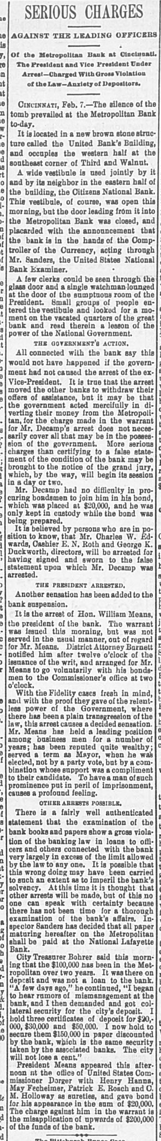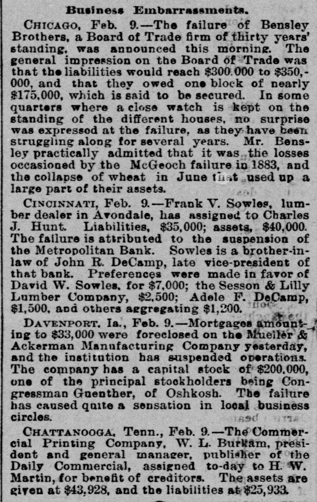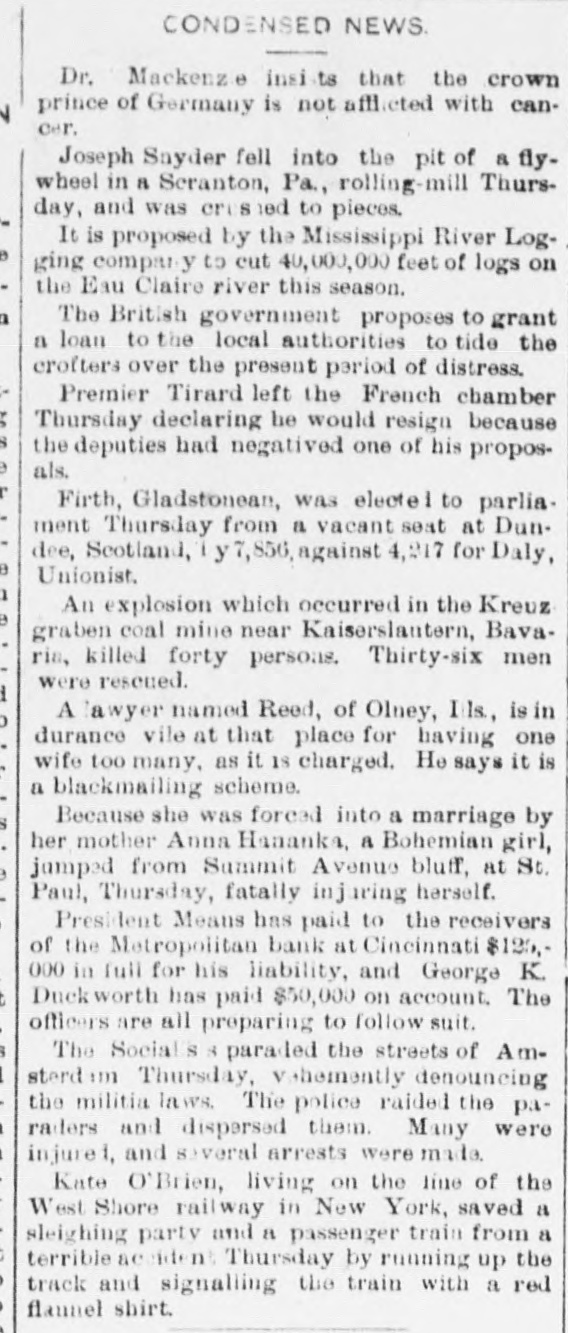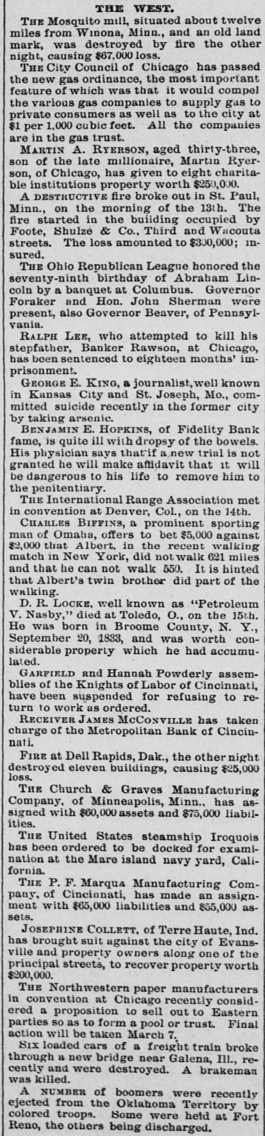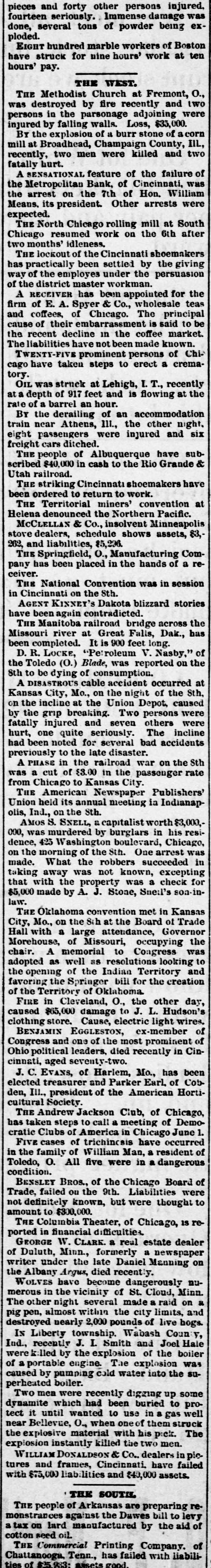 pieces and forty other persons injured, fourteen seriously. Immense damage was done, several tons of powder being exploded. EIGHT hundred marble workers of Boston have struck for nine hours' work at ten hours' pay. THE WEST. THE Methodist Church at Fremont, O., was destroyed by fire recently and two persons in the parsonage adjoining were injured by falling walls. Loss, $35,000. Br the explosion of a burr stone of a corn mill at Broadhead, Champaign County, IIL, recently, two men were killed and two fatally hurt. A SENSATIONAL feature of the failure of the Metropolitan Bank, of Cincinnati, was the arrest on the 7th of Hon. William Means. its president. Other arrests were expected. THE North Chicago rolling mill at South Chicago resumed work on the 6th after two months' idleness. THE lockout of the Cincinnati shoemakers has practically been settled by the giving way of the employes under the persuasion of the district master workman. A RECEIVER has been appointed for the firm of E. A. Spyer & Co., wholesale teas and coffees, of Chicago. The principal cause of their embarrassment is said to be the recent decline in the coffee market. The liabilities have not been made known. TWENTY-FIVE prominent persons of Chicago have taken steps to erect a crematory. OIL was struck at Lehigh, I. T., recently at a depth of 917 feet and is flowing at the rate of a barrel an hour. By the derailing of an accommodation train near Athens, III., the other night, eight passengers were injured and six freight cars ditched. THE people of Albuquerque have subscribed $40,000 in cash to the Rio Grande & Utah railroad. THE striking Cincinnati shoemakers have been ordered to return to work. THE Territorial miners' convention at Helena denounced the Northern Pacific. McCLELLAN & Co., insolvent Minneapolis stove dealers, schedule shows assets, $3,262, and liabilities, $5,296. THE Springfield, O., Manufacturing Company has been placed in the hands of a receiver. THE National Convention was in session in Cincinnati on the Sth. AGENT KINNEY'S Dakota blizzard stories have been again contradicted. THE Manitoba railroad bridge across the Missouri river at Great Falls, Dak., has been completed. It is 900 feet long. D. R. LOCKE, "Petroleum V. Nasby," of the Toledo (0.) Blade, was reported on the 8th to be dying of consumption. A DISASTROUS cable accident occurred at Kansas City, Mo., on the night of the Sth, on the incline at the Union Depot, caused by the grip breaking. Two persons were fatally injured and seven others were hurt, one quite seriously. The incline had been noted for several bad accidents previously to the late disaster. A PHASE in the railroad war on the Sth was a cut of $3.00 in the passenger rate from Chicago to Kansas City. THE American Newspaper Publishers' Union held its annual meeting in Indianapolis, Ind., on the Sth. AMOS S. SNELL, a capitalist worth $3,000,000, was murdered by burglars in his residence, 425 Washington boulevard, Chicago, on the morning of the Sth. One arrest was made. What the robbers succeeded in taking away was not known, excepting that with the property was a check for $5,000 made by A. J. Stone, Sne:l's son-inlaw. THE Oklahoma convention met in Kansas City, Mo., on the Sih at the Board of Trade Hall with a large attendance, Governor Morehouse, of Missouri, occupying the chair. A memorial to Congress was adopted as well as resolutions looking to the opening of the Indian Territory and favoring the Springer bill for the creation of the Territory of Oklahoma. FIRE in Cleveland, 0., the other day, caused $65,000 damage to J. L. Hudson's clothing store. Cause, electric light wires. BENJAMIN EGGLESTON, ex-member of Congress and one of the most prominent of Ohio political leaders, died recently in Cincinnati, aged seventy-two. J. C. EVANS, of Harlem, Mo., has been elected treasurer and Parker Earl, of Cobden, III., president of the American Horticultural Society. THE Andrew Jackson Club, of Chicago, has taken steps to call a meeting of Democratic Clubs of America in Chicago June 1. FIVE cases of trichincsis have occurred in the family of William Man, a resident of Toledo, 0. All five were in a dangerous condition. BENSLEY BROS., of the Chicago Board of Trade, failed ou the 9th. Liabilities were not definitely known, but were thought to amount to $300,000. THE Columbia Theater, of Chicago, IS reported in financial difficulties. GEORGE W. CLARK. a real estate dealer of Duluth, Minn., formerly a newspaper writer under the late Daniel Manning on the Albany Argus, died recently. WOLVES have become dangerously numerous in the vicinity of St. Cloud, Minn. The other night several made a raid on a pig pen, almost within the city limits, and destroyed nearly 2,000 pounds of live hogs. IN Liberty township. Wabash Coun y, Ind., recently J. I. Smith and Joel Hale were killed by the explosion of the boiler of a portable engine. The explosion was caused by pumping cold water into the superheated boiler. Two men were recently digzing up some dynamite which had been buried to protect it until wanted to use in a gas well near Bellevue, O., when one of them struck the explosive material with his pick. The explosion instantly killed the two men. WILLIAM DONALDSON & Co.. dealers in pictures and frames, Cincinnati, have failed with $75,000 liabilities and $40,000 assets. THE SOUTH THE people of Arkansas are preparing remonstrances against the Dawes bill to levy a tax on lard manufactured by the aid of cotton seed oil. THE Commercial Printing Company. of