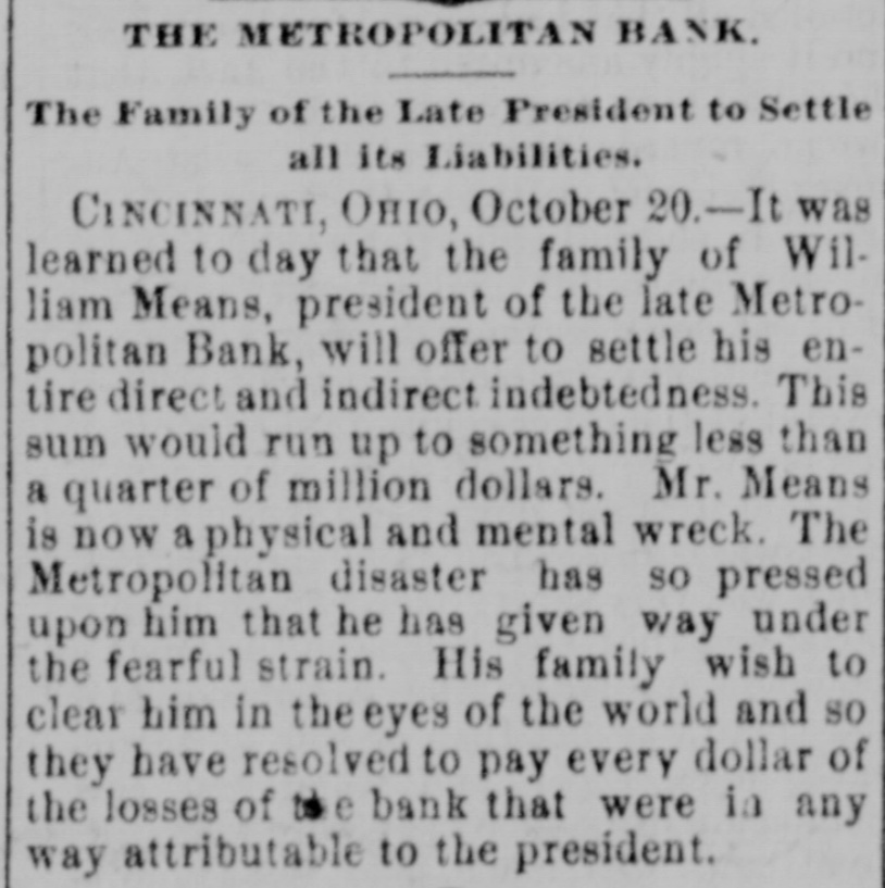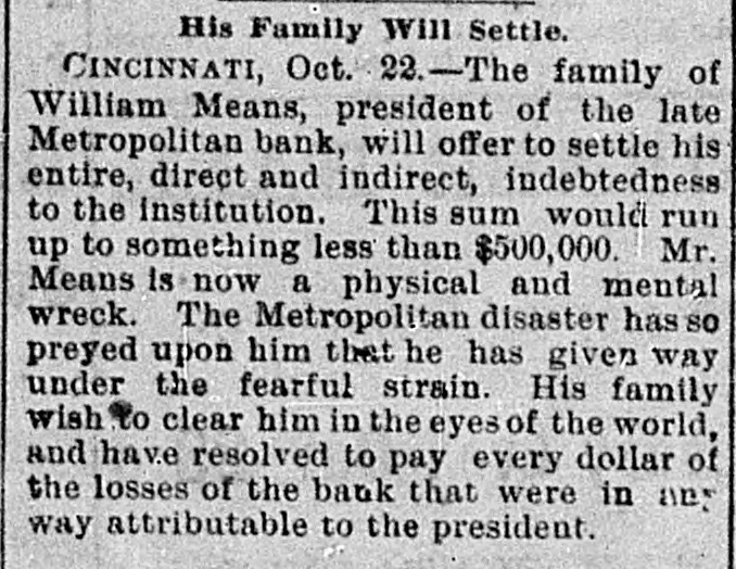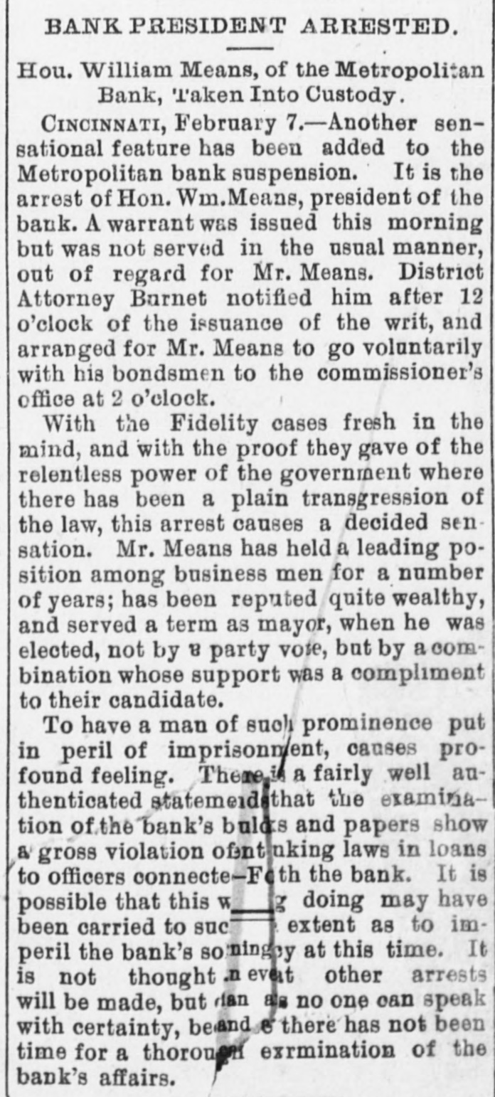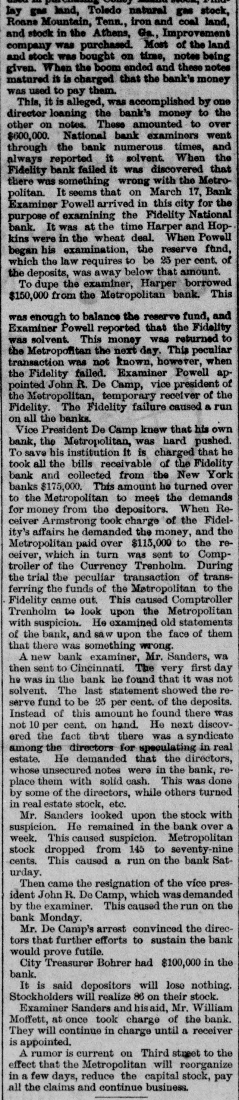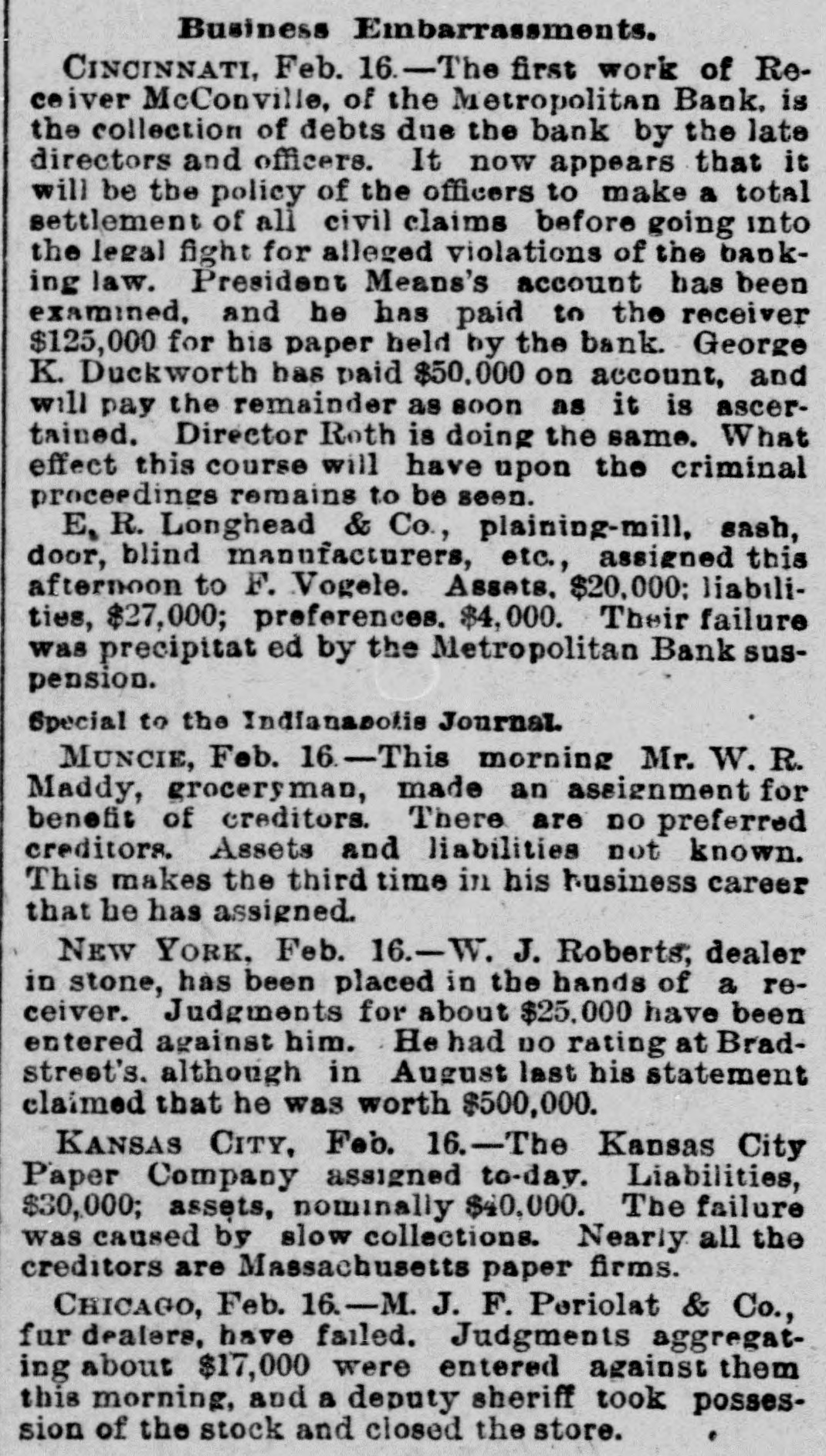 pieces and forty other persons injured, fourteen seriously. Immense damage was done, several tons of powder being exploded. EIGHT hundred marble workers of Boston have struck for nine hours' work at ten hours' pay. THE WEST. THE Methodist Church at Fremont, O., was destroyed by fire recently and two persons in the parsonage adjoining were injured by falling walls. Loss, $35,000. Br the explosion of a burr stone of a corn mill at Broadhead, Champaign County, IIL, recently, two men were killed and two fatally hurt. A SENSATIONAL feature of the failure of the Metropolitan Bank, of Cincinnati, was the arrest on the 7th of Hon. William Means. its president. Other arrests were expected. THE North Chicago rolling mill at South Chicago resumed work on the 6th after two months' idleness. THE lockout of the Cincinnati shoemakers has practically been settled by the giving way of the employes under the persuasion of the district master workman. A RECEIVER has been appointed for the firm of E. A. Spyer & Co., wholesale teas and coffees, of Chicago. The principal cause of their embarrassment is said to be the recent decline in the coffee market. The liabilities have not been made known. TWENTY-FIVE prominent persons of Chicago have taken steps to erect a crematory. OIL was struck at Lehigh, I. T., recently at a depth of 917 feet and is flowing at the rate of a barrel an hour. By the derailing of an accommodation train near Athens, III., the other night, eight passengers were injured and six freight cars ditched. THE people of Albuquerque have subscribed $40,000 in cash to the Rio Grande & Utah railroad. THE striking Cincinnati shoemakers have been ordered to return to work. THE Territorial miners' convention at Helena denounced the Northern Pacific. McCLELLAN & Co., insolvent Minneapolis stove dealers, schedule shows assets, $3,262, and liabilities, $5,296. THE Springfield, O., Manufacturing Company has been placed in the hands of a receiver. THE National Convention was in session in Cincinnati on the Sth. AGENT KINNEY'S Dakota blizzard stories have been again contradicted. THE Manitoba railroad bridge across the Missouri river at Great Falls, Dak., has been completed. It is 900 feet long. D. R. LOCKE, "Petroleum V. Nasby," of the Toledo (0.) Blade, was reported on the 8th to be dying of consumption. A DISASTROUS cable accident occurred at Kansas City, Mo., on the night of the Sth, on the incline at the Union Depot, caused by the grip breaking. Two persons were fatally injured and seven others were hurt, one quite seriously. The incline had been noted for several bad accidents previously to the late disaster. A PHASE in the railroad war on the Sth was a cut of $3.00 in the passenger rate from Chicago to Kansas City. THE American Newspaper Publishers' Union held its annual meeting in Indianapolis, Ind., on the Sth. AMOS S. SNELL, a capitalist worth $3,000,000, was murdered by burglars in his residence, 425 Washington boulevard, Chicago, on the morning of the Sth. One arrest was made. What the robbers succeeded in taking away was not known, excepting that with the property was a check for $5,000 made by A. J. Stone, Sne:l's son-inlaw. THE Oklahoma convention met in Kansas City, Mo., on the Sih at the Board of Trade Hall with a large attendance, Governor Morehouse, of Missouri, occupying the chair. A memorial to Congress was adopted as well as resolutions looking to the opening of the Indian Territory and favoring the Springer bill for the creation of the Territory of Oklahoma. FIRE in Cleveland, 0., the other day, caused $65,000 damage to J. L. Hudson's clothing store. Cause, electric light wires. BENJAMIN EGGLESTON, ex-member of Congress and one of the most prominent of Ohio political leaders, died recently in Cincinnati, aged seventy-two. J. C. EVANS, of Harlem, Mo., has been elected treasurer and Parker Earl, of Cobden, III., president of the American Horticultural Society. THE Andrew Jackson Club, of Chicago, has taken steps to call a meeting of Democratic Clubs of America in Chicago June 1. FIVE cases of trichincsis have occurred in the family of William Man, a resident of Toledo, 0. All five were in a dangerous condition. BENSLEY BROS., of the Chicago Board of Trade, failed ou the 9th. Liabilities were not definitely known, but were thought to amount to $300,000. THE Columbia Theater, of Chicago, IS reported in financial difficulties. GEORGE W. CLARK. a real estate dealer of Duluth, Minn., formerly a newspaper writer under the late Daniel Manning on the Albany Argus, died recently. WOLVES have become dangerously numerous in the vicinity of St. Cloud, Minn. The other night several made a raid on a pig pen, almost within the city limits, and destroyed nearly 2,000 pounds of live hogs. IN Liberty township. Wabash Coun y, Ind., recently J. I. Smith and Joel Hale were killed by the explosion of the boiler of a portable engine. The explosion was caused by pumping cold water into the superheated boiler. Two men were recently digzing up some dynamite which had been buried to protect it until wanted to use in a gas well near Bellevue, O., when one of them struck the explosive material with his pick. The explosion instantly killed the two men. WILLIAM DONALDSON & Co.. dealers in pictures and frames, Cincinnati, have failed with $75,000 liabilities and $40,000 assets. THE SOUTH THE people of Arkansas are preparing remonstrances against the Dawes bill to levy a tax on lard manufactured by the aid of cotton seed oil. THE Commercial Printing Company. of