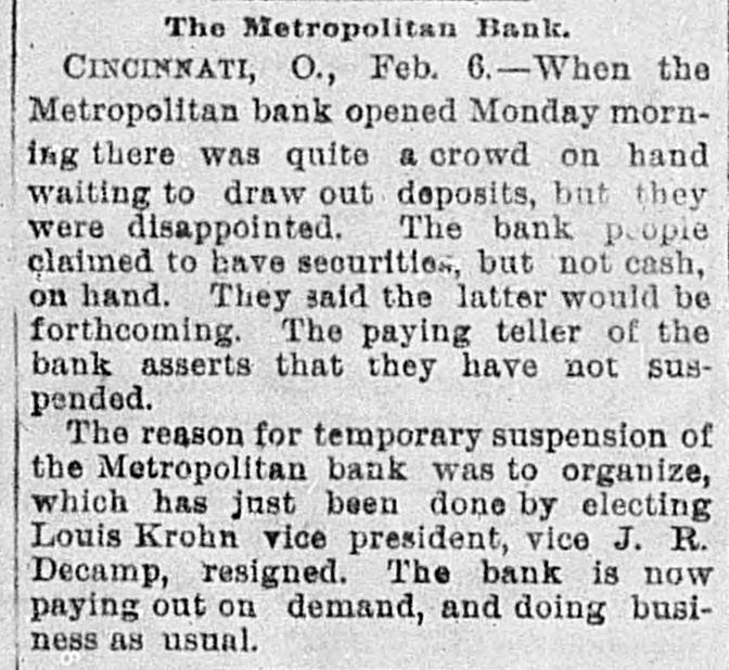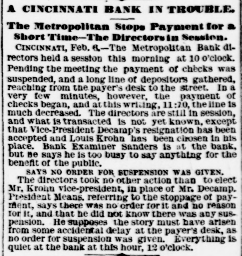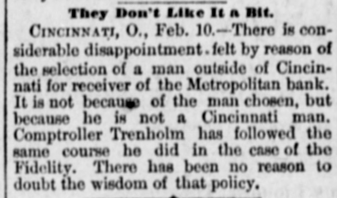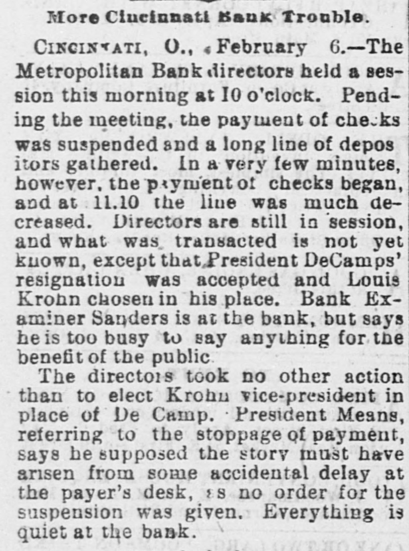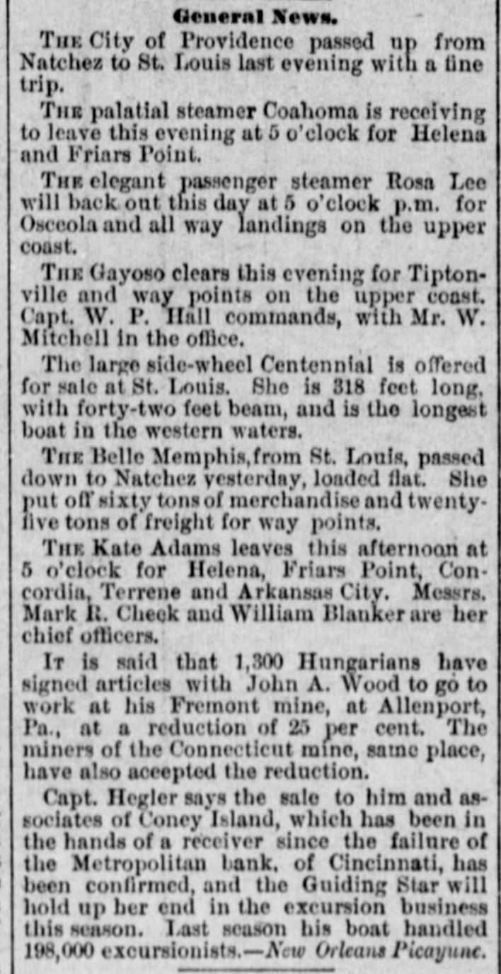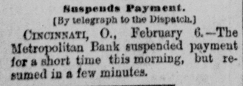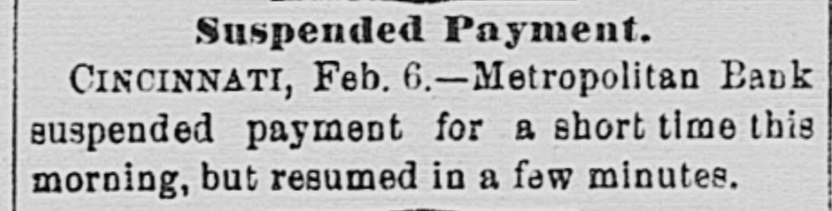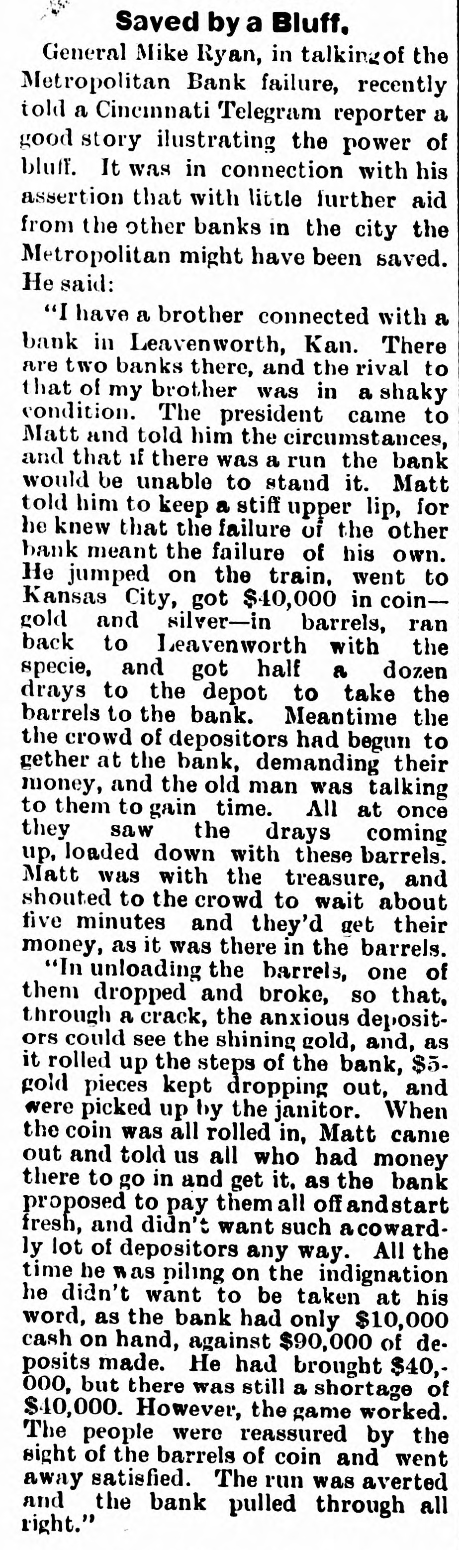 pieces and forty other persons injured, fourteen seriously. Immense damage was done, several tons of powder being exploded. EIGHT hundred marble workers of Boston have struck for nine hours' work at ten hours' pay. THE WEST. THE Methodist Church at Fremont, O., was destroyed by fire recently and two persons in the parsonage adjoining were injured by falling walls. Loss, $35,000. Br the explosion of a burr stone of a corn mill at Broadhead, Champaign County, IIL, recently, two men were killed and two fatally hurt. A SENSATIONAL feature of the failure of the Metropolitan Bank, of Cincinnati, was the arrest on the 7th of Hon. William Means. its president. Other arrests were expected. THE North Chicago rolling mill at South Chicago resumed work on the 6th after two months' idleness. THE lockout of the Cincinnati shoemakers has practically been settled by the giving way of the employes under the persuasion of the district master workman. A RECEIVER has been appointed for the firm of E. A. Spyer & Co., wholesale teas and coffees, of Chicago. The principal cause of their embarrassment is said to be the recent decline in the coffee market. The liabilities have not been made known. TWENTY-FIVE prominent persons of Chicago have taken steps to erect a crematory. OIL was struck at Lehigh, I. T., recently at a depth of 917 feet and is flowing at the rate of a barrel an hour. By the derailing of an accommodation train near Athens, III., the other night, eight passengers were injured and six freight cars ditched. THE people of Albuquerque have subscribed $40,000 in cash to the Rio Grande & Utah railroad. THE striking Cincinnati shoemakers have been ordered to return to work. THE Territorial miners' convention at Helena denounced the Northern Pacific. McCLELLAN & Co., insolvent Minneapolis stove dealers, schedule shows assets, $3,262, and liabilities, $5,296. THE Springfield, O., Manufacturing Company has been placed in the hands of a receiver. THE National Convention was in session in Cincinnati on the Sth. AGENT KINNEY'S Dakota blizzard stories have been again contradicted. THE Manitoba railroad bridge across the Missouri river at Great Falls, Dak., has been completed. It is 900 feet long. D. R. LOCKE, "Petroleum V. Nasby," of the Toledo (0.) Blade, was reported on the 8th to be dying of consumption. A DISASTROUS cable accident occurred at Kansas City, Mo., on the night of the Sth, on the incline at the Union Depot, caused by the grip breaking. Two persons were fatally injured and seven others were hurt, one quite seriously. The incline had been noted for several bad accidents previously to the late disaster. A PHASE in the railroad war on the Sth was a cut of $3.00 in the passenger rate from Chicago to Kansas City. THE American Newspaper Publishers' Union held its annual meeting in Indianapolis, Ind., on the Sth. AMOS S. SNELL, a capitalist worth $3,000,000, was murdered by burglars in his residence, 425 Washington boulevard, Chicago, on the morning of the Sth. One arrest was made. What the robbers succeeded in taking away was not known, excepting that with the property was a check for $5,000 made by A. J. Stone, Sne:l's son-inlaw. THE Oklahoma convention met in Kansas City, Mo., on the Sih at the Board of Trade Hall with a large attendance, Governor Morehouse, of Missouri, occupying the chair. A memorial to Congress was adopted as well as resolutions looking to the opening of the Indian Territory and favoring the Springer bill for the creation of the Territory of Oklahoma. FIRE in Cleveland, 0., the other day, caused $65,000 damage to J. L. Hudson's clothing store. Cause, electric light wires. BENJAMIN EGGLESTON, ex-member of Congress and one of the most prominent of Ohio political leaders, died recently in Cincinnati, aged seventy-two. J. C. EVANS, of Harlem, Mo., has been elected treasurer and Parker Earl, of Cobden, III., president of the American Horticultural Society. THE Andrew Jackson Club, of Chicago, has taken steps to call a meeting of Democratic Clubs of America in Chicago June 1. FIVE cases of trichincsis have occurred in the family of William Man, a resident of Toledo, 0. All five were in a dangerous condition. BENSLEY BROS., of the Chicago Board of Trade, failed ou the 9th. Liabilities were not definitely known, but were thought to amount to $300,000. THE Columbia Theater, of Chicago, IS reported in financial difficulties. GEORGE W. CLARK. a real estate dealer of Duluth, Minn., formerly a newspaper writer under the late Daniel Manning on the Albany Argus, died recently. WOLVES have become dangerously numerous in the vicinity of St. Cloud, Minn. The other night several made a raid on a pig pen, almost within the city limits, and destroyed nearly 2,000 pounds of live hogs. IN Liberty township. Wabash Coun y, Ind., recently J. I. Smith and Joel Hale were killed by the explosion of the boiler of a portable engine. The explosion was caused by pumping cold water into the superheated boiler. Two men were recently digzing up some dynamite which had been buried to protect it until wanted to use in a gas well near Bellevue, O., when one of them struck the explosive material with his pick. The explosion instantly killed the two men. WILLIAM DONALDSON & Co.. dealers in pictures and frames, Cincinnati, have failed with $75,000 liabilities and $40,000 assets. THE SOUTH THE people of Arkansas are preparing remonstrances against the Dawes bill to levy a tax on lard manufactured by the aid of cotton seed oil. THE Commercial Printing Company. of
