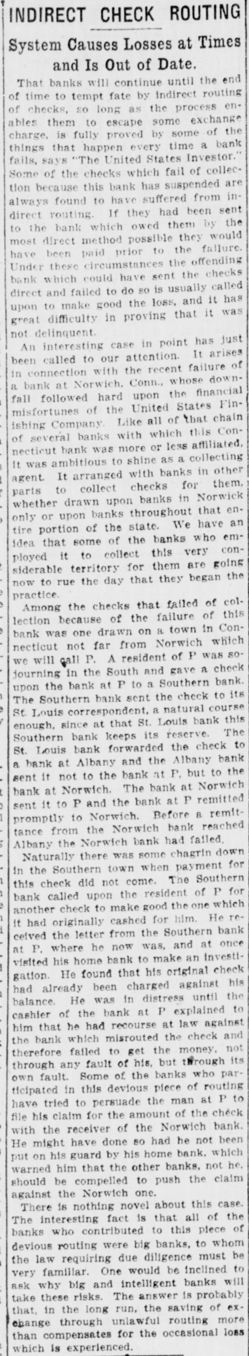 INDIRECT CHECK ROUTING System Causes Losses at Times and Is Out of Date. That banks will continue until the end of time to tempt fate by indirect routing enof checks, so long as the process exchange them to escape some the is proved by some that happen every "The United States the checks which fail ables charge, things fails, Some says of fully time Investor." of a collec- of bank are tion because this bank has suspended infound to have suffered from sent always direct routing. If they had been by the the bank which owed them would to direct method possible they failure most been paid prior to the offending have these circumstances the checks Under which could have sent the called bank and failed to do so is usually and it has direct to make good the loss, it was upon great difficulty in proving that not delinquent. just interesting case in point It has arises An called to our attention. failure of been connection with the recent downin bank at Norwich, Conn., whose financial a followed hard upon the Finfall of the United chain Like all of Conbanks with ishing misfortunes of several Company which less States that this affiliated. bank was more or collecting necticut ambitious to shine as a other it was It arranged with banks in them. agent to collect checks for Norwick parts drawn upon banks in that enwhether or upon banks throughout have an only portion of the state. We who emtire that some of the banks conidea it to collect this very going ployed territory for them are the now siderable to rue the day that they began practice. the checks that failed of of this colAmong Because of the failure Conlection one drawn on a town in which bank was not far from Norwich sonecticut will call P. A resident of P was check journing we in the South and gave a bank. the bank at P to a Southern its upon The Southern bank sent the check course to Louis correspondent. a natural this St. since at that St. Louis bank The bank keeps its bank forwarded the at Albany and the Albany the enough, Southern St. bank Louis reserve. but check to bank to a not to the bank at P. Norwich. The bank at P and the bank at P to Norwich. Before 8 sent bank sent promptly it it at to remitted Norwich reached remit from the Norwich bank Albany tance the Norwich bank had failed. Naturally there was some chagrin down for the Southern town when payment Southern in check did not come. The for this called upon the resident of which P bank check to make good the one reanother had originally cashed for him. He bank it ceived the letter from the Southern once where he now was, and at investiat P. his home bank to make an check visited He found that his original his gation. already been charged against the had He was in distress until to cashier balance. of the bank at P explained against that he had recourse at law and the him bank which misrouted the check not failed to get the money. its fault of his, but Some of the in this devious piece to to persuade the man have ticipated own therefore through fault. tried any banks through of who at routing check P parfile his claim for the amount of the with the receiver of the Norwich bank. been He might have done so had he not which on his guard by his home bank. he. put warned him that the other banks, not should be compelled to push the claim against the Norwich one. There is nothing novel about this case. the The interesting fact is that all of of contributed to this piece were big banks devious who routing banks, to must whom be the law requiring due diligence familiar. One would be inclined will to ask very why big and intelligent banks take these risks. The answer is probably that, in the long run, the saving of exchange through unlawful routing more loss than compensates for the occasional which is experienced.