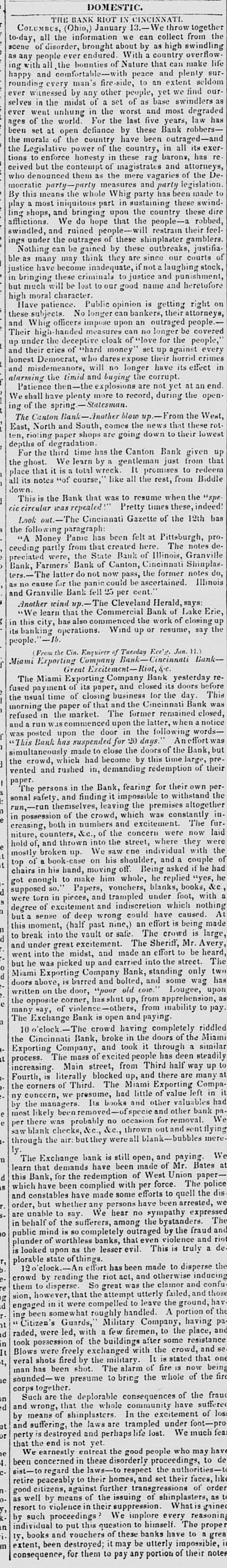 DOMESTIC. THE BANK RIOT IN 13.-We throw 1 CINCINNATI. together COLUMBUS, (Ohio,) January we can collect swindling from the ever endured. scene to-day, of all disorder, the informati brought about With by a country as high overflow life can make ing any with people all the bounties of Nature peace that and plenty seldom sur extent rounding every happy and com man fire side, people, to an yet we find our of in the midst selves ever witnessed by any other set of as base swindlers a and most worst degraded ever went unhung world. in For the the last five Bank years, robbers- law has ages been of set the at open defiance have by these been exer the the morals Legislative of the power country of the these country, rag barons, in all its has re tions to but enforce the contempt honesty of in magistrates vagaries and of attorneys, the De ceived who denounced them as measures the mere and party legislation. made By in part mocratic this means party-party the whole Whig sustaining party has been these swinddire play most and iniquitous bringing upon the the country people-a these robbed, ling shops, We do hope that restrain their feel swindled, afflictions. and the ruined outrages people- of these will shinplaster outbreaks, gamblers justifiaings under be gained by these our courts of Nothing can think they are since stock, ble as many become may inadequate, if not and laughing punishment, be will much in justice bringing have these criminals lost to our to good justice name and heretofore Have but high moral character Public opinion is getting their attorneys, right on patience. No longer can bankers, outraged people.these subjects. Whig officers impose upon can an no longer be covered Their and high- handed measures cloak of "love for the people, every up under the deceptive of "hard money set their up against horrid crimes will no and honest their Democrat, cries who dares longer expose have its effect in end and alarming misdemeanors, the limid and buying the are corrupt. not yet at an We shall Patience have the n-the plenty more explosions to record, during the open ing of the spring.-Statesman. Bank Another blow up.- From that the these West rot shops paper rioting East, The Canton North and South, are comes going the down news to their lowest ten, degradation Bank up given We learn promises depths For the of third time has by the gentleman Canton just to from redeem that place the ghost. that notes it "of is a course, total wreck like all It the rest, from Biddle This Pretty down. all its is the Bank that was to resume times when these, the indeed! "spe. cic circular out. was The repealed Cincianati Gazette of the 12th has the Look following paragraph: has been felt at Pittsburgh, notes pro- deMoney Panic created here. The ceeding "A partly from the that State Bank of Illinois, Granville Shinplas preciated Farmers were, Bank of Canton, Cincinnati the former notes do, ters.- Bank, The latter do panic c not now could pass, be ascertained. Illinois says: and no na cause for Granville Bank the fell Cleveland per cent. Herald, the that the work Another wind up.- The Commercial Bank of of Lake closing Erie, up the people. -11. its in "We this banking city, learn operations. has also commenced Wind up or resume, say Jun.11.) (From the Cin. Company Enguirer of Bank- Tuesday Ect's Cincinnati Bank Miami Exporting Excitement Riot, &.C. vesterday reMiami Great Exporting Company and closed Bank its doors before This the paper fused payment The of its paper, business for the day. Bank was former usual time of of closing that and the Cincinnati remained closed, notice was in refused morning in the market. The upon the the latter, following when wordswas and a run posted upon suspended the door for 20 days of the An effort Bank, but "This Bank has made to close the doors time large, pre simultaneously had become by this of their the crowd, and which rushed in, demanding redemption pervented paper. persons in the Bank impossible fearing for to their withstand own the themselves, was gonal safety, The and finding leaving it the premises constantly altoget in in run,-run possession of the numbers crowd, and which excitement. were now The fur laid creasing, both in &c., of the street, concern where they were up. broken and shoulder, niture, hold of, counters, and thrown We into saw the one individual couple with the of be had mostly top of a book-cas moving on his off. Being replied asked if "yes, he his hand, whole, he &c. chairs got enough in to make him vouchers, under blanks, foot, books, with supposed torn so. in pieces, Papers, and and trampled indiscretion which caused. nothing Al were degree of excitement of deep wrong could effort have is being mad this but a sense moment, (half vault past or nine,) safe. an The crowd Mr. is Avery large to break under into great the excitement. made The an Sheriff, effort to be heard The and the midst, and carried into the street. is went into was picked up and Bank, standing only tw has coro old Miami but he Exporting barred Company and bolted, and some Lougee, wag upon as doors above, written the many say opposite on the of corner, violence door, has "poor is open others, shut and up, from from paying. apprehension, inability riddled to pay The Exchange The Bank crowd having completely doors of the Miami t 10 Cincinnati clock Bank, broke and took in the it through a steadily similar the Exporting Company of excited people Third has half deen way up to process. The Main mass street, from and there are many increasing is literally blocked The Miami up, Exporting left Compa in Fourth, the corners of Third. presume, had little other of value valuables had ny concern, managers. we Its books specie and and removal. other bank We pa by the been remove occasion for and sent flying open, n most likely through per saw there blank the was checks, air: probably but &c., they &c., no were all thrown .nk-bubbles out and paying mere We Bates d ly The Exchange demands bank have is 
