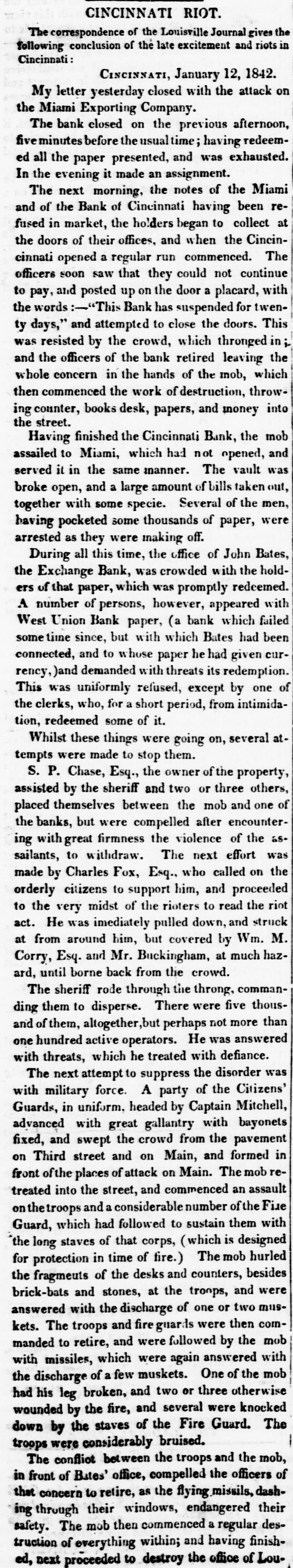 CINCINNATI RIOT. The correspondence of the Louisville Journal gives the following conclusion of the late excitement and riots in Cincinnati: CINCINNATI, January 12, 1842. My letter yesterday closed with the attack on the Miami Exporting Company. The bank closed on the previous afternoon, iveminutes before the usual time; having redeemed all the paper presented, and was exhausted. In the evening it made an assignment. The next morning, the notes of the Miami and of the Bank of Cincinnati having been refused in market, the holders began to collect at the doors of their offices, and when the Cincincinnati opened a regular run commenced. The officers soon saw that they could not continue to pay, and posted up on the door a placard, with the words :-"This Bank has suspended for twenty days," and attempted to close the doors. This was resisted by the crowd, which thronged in and the officers of the bank retired leaving the whole concern in the hands of the mob, which then commenced the work of destruction, throwing counter, books desk, papers, and money into the street. Having finished the Cincinnati Bank, the mob assailed to Miami, which had not opened, and served it in the same manner. The vault was broke open, and a large amount of bills taken out, together with some specie. Several of the men, having pocketed some thousands of paper, were arrested as they were making off. During all this time, the office of John Bates, the Exchange Bank, was crowded with the holders of that paper, which was promptly redeemed. A number of persons, however, appeared with West Union Bank paper, (a bank which failed some time since, but with which Bates had been connected, and to whose paper he had given currency, )and demanded with threats its redemption. This was uniformly refused, except by one of the clerks, who, for a short period, from intimidation, redeemed some of it. Whilst these things were going on, several at tempts were made to stop them. S.P. Chase, Esq., the owner of the property, assisted by the sheriff and two or three others, placed themselves between the mob and one of the banks, but were compelled after encountering with great firmness the violence of the assailants, to withdraw. The next effort was made by Charles Fox, Esq., who called on the orderly citizens to support him, and proceeded to the very midst of the rioters to read the riot act. He was imediately pulled down, and struck at from around him, but covered by Wm. M. Corry, Esq. and Mr. Buckingham, at much hazard, until borne back from the crowd. The sheriff rode through the throng, commanding them to disperse. There were five thousof them, altogether,but perhaps not more than one hundred active operators. He was answered with threats, which he treated with defiance. The next attempt to suppress the disorder was with military force. A party of the Citizens' Guards, in uniform. headed by Captain Mitchell, advanced with great gallantry with bayonets fixed, and swept the crowd from the pavement on Third street and on Main, and formed in front the places of attack on Main. The mob retreated into the street, and commenced an assault on the troops and a considerable number of the Fiue Guard, which had followed to sustain them with the long staves of that corps, (which is designed for protection in time of fire.) The mob hurled the fragments of the desks and counters, besides brick-bats and stones, at the troops, and were answered with the discharge of one or two muskets. The troops and fire guards were then commanded to retire, and were followed by the mob with missiles, which were again answered with the discharge of a few muskets. One of the mob had his leg broken, and two or three otherwise wounded by the fire, and several were knocked down by the staves of the Fire Guard. The troops were considerably bruised. The confliot between the troops and the mob, in front of Bates' office, compelled the officers of to as a that safety. ing through concern The mob their retire, then windows, commenced the flying endangered missils, regular dash- their destruction of everything within; and having finished, next proceeded to destroy the office of Lou-
