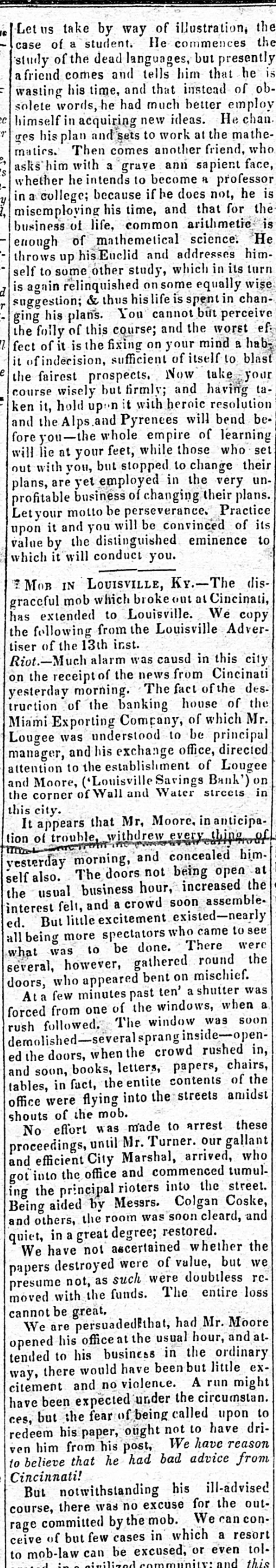 us take by way of illustration, the the case of a student. He commences study of the dead languages, but presently a friend comes and tells him that he wasting his time, and that instead of obhe had much better employ himself in new ideas. solete words, acquiring the He mathe- chan. ges his plan and sets to work at Then comes another him with a grave ann asks matics. sapient friend, face, who whether he intends to become a professor in a college; because if he does not, he the is his time, and that for of life, common business misemploying arithmetic science. He enough of mathemetical throws up his Enclid and addresses himself to some other study, which in its turn is again relinquished onsome equally wise & thus hislife is spent his You cannot ging suggestion; plans. but perceive in chan- ef the folly of this course; and the worst fect of it is the fixing on your mind a habsufficient of itself to blast your the it ofindecision, fairest prospects. Now having take tacourse wisely but firmly; and ken it, hold upon it with heroic resolution and Pyrenees will bend bewhole empire at feet, while and fore lie the you-the Alps your those of who learning set but stopped to will out with you, the change their unplans, are yet employed in very business of changing their plans. motto be perseverance. profitable Letyour Practice of its it and you will be convinced upon value by the distinguished eminence to which it will conduct you. ? MOB IN LOUISVILLE, Ky.-The disgraceful mob which broke out at Cincinati, has extended to Louisville. We copy the following from the Louisville Advertiser of the 13th inst. Riot.-Much alarm was causd in this city the receipt of the news from Cincinati on yesterday morning. The fact of the destruction of the banking house of the Miami Exporting Company, of which Mr. Lougee was understood to be principal manager, and his exchange office, directed attention to the establishment of Lougee and Moore, ('Louisville Savings Bank') on the corner of Wall and Water streets in this city. It appears that Mr. Moore, in anticipa- of tion of trouble, withdrew every thing yesterday morning, and concealed him. at also. The doors not being open self usual business hour, increased assemble- the interest the felt, and a crowd soon But little excitement existed-nearly see ed. all being more spectators who came to were was to be done. There the several, what however, gathered round doors, who appeared bent on mischief. few minutes past ten' a shutter was a forced At a from one of the windows, when soon followed. The window was the doors, when the crowd ed books, letters, papers, chairs, the tables, and soon, in fact, the entite contents of office were flying into the streets amidst shouts of the mob. No effort was made to arrest these proceedings, until Mr. Turner. our gallant efficient City Marshal, arrived, who got into and the office and commenced tumulthe principal rioters into the street. ing Being aided by Messrs. Colgan Coske, and and others, the room was soon cleard, quiet, in a great degree; restored. We have not ascertained whether the destroyed were of value, but we papers not, as such were doubtless rcpresume moved with the funds. The entire loss cannot be great. We are persuadedEthat, had Mr. Moore opened his office at the usual hour, and attended to his business in the ordinary there would have been but little excitement way, and no violence. A run might have been expected under the circumstan. but the fear of being called upon to ces, redeem his paper, ought not to have drihim from his post, We have reason ven to believe that he had bad advice from Cincinnati! But notwithstanding his ill-advised course, there was no excuse for the outrage committed by the mob. We can conceive of but few cases in which a resort to mob-law can be excused, or even tolcommunity: and this