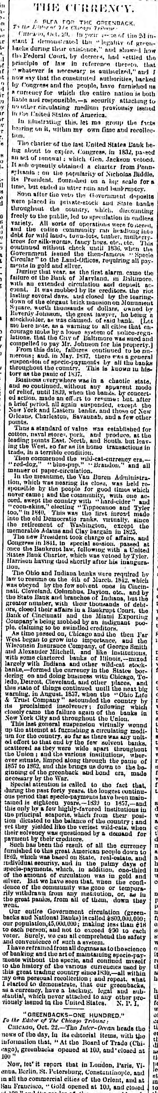 # THE CURRENCY. A PLEA FOR THE GREENBACK. To the Editor of The Chicago Tribune: CHICAGO, Oct. 20. In your page of the 2d instant I demonstrated the "legality of greenbacks during their existence," and showed how the Federal Court, by decrees, had settled the principle of law in reference thereto, that "whatever is necessary is authorized," and I now say that the constituted authorities, backed by Congress and the people, have furnished us a currency for which the entire nation is both liable and responsible, -a security attaching to no other circulating medium previously issued in the United States of America. In illustrating this, let me group the facts bearing on it, within my own time and recollection. The charter of the last United States Bank being about to expire, Congress, in 1832, passed an act of renewal which Gen. Jackson vetoed. It subsequently obtained a charter from Pennsylvania: on the popularity of Nicholas Biddle, its President, flourished on a big scale for a time, but ended in utter ruin and bankruptcy. Soon after the veto the Government deposits were placed in private-stock and State banks throughout the country, which, discounting freely to the public, led to speculation in endless variety. All sorts of operations were fostered, and the entire community ran headlong into debt for wild land, town-lots, timber, mulberry-trees for silk-worms, fancy hogs, etc., etc. This continued without check until 1836, when the Government issued the then-famous "Specie Circular" to the Land-Offices, requiring all payments in gold and silver. During that year, as the first alarm came the failure of the Bank of Maryland, in Baltimore, with an extended circulation and deposit account. It was mobbed by its creditors, the riot lasting several days, and closed by the tearing-down of the elegant brick mansion on Monument Square, worth thousands of dollars, owned by Reverdy Johnson, the great lawyer, he being a stockholder, as was claimed, of said bank. [Let me here note, as a warning to all cities that encourage mobs by a loose system of police-regulations, that the City of Baltimore was sued and compelled to pay Mr. Johnson for his property.] From this date, failures continued to be numerous; and, in May, 1837, there was a general suspension of specie-payments by all the banks throughout the country. This is known in history as the panic of 1837. Business everywhere was in a chaotic state, and so continued, without any apparent mode of relief, until 1839, when the banks, by concerted action, made an effort to resume; but, after a brief period, all again suspended, except the New York and Eastern banks, and those of New Orleans, Charleston, Savannah, and a few other points. Thus a standard of value was established for cotton, naval stores, pork, and produce, at the leading points East, North, and South, but leaving the West, so far as its home transactions in trade, in a terrible condition. Then commenced the wild-cat-currency era,-"red-dog," "blue-pup," "Brandon," and all manner of paper-circulation. In the meantime, the Van Buren Administration, which was nearing its close, was held responsible by the people for good times which never came; and the community, with one accord, swept the country with "hard-cider" and "coon-skins," electing "Tippecanoe and Tyler too," in 1840. This was the first inroad made into the old Democratic ranks, virtually, since the retirement of Washington, except the memorable Adams and Clay bargain in 1825. The new President took charge of affairs, and Congress in 1841, in special session, passed at once the Bankrupt law, following with a United States Bank Charter, which was vetoed by Tyler, Harrison having died shortly after his inauguration. The Ohio and Indiana banks were required by law to resume on the 4th of March, 1842, which was obeyed by the few solvent ones in Cincinnati, Cleveland, Columbus, Dayton, etc., and by the State Bank and branches of Indiana, but the greater number, with their thousands of debtors, closed their affairs in a Bankrupt Court, the Bank of Cincinnati and the Miami Exporting Company's being mobbed by an indignant people, claiming to be swindled creditors. As time passed on, Chicago and the then Far West began to grow into importance, and the Wisconsin Insurance Company, of George Smith and Alexander Mitchell, and like institutions, with some chartered banks of Illinois, -mixed largely with Indiana and other wild-cat stock-banks, -formed the currency in the States bordering on and doing business with Chicago, Toledo, Detroit, Cleveland, and other places, and this state of things continued until the next big warning, in August, 1857, when the "Ohio Life & Trust Company" astounded the country by its proclaimed insolvency; following which closely came the failure again of the banks in New York City and throughout the Union. This last general suspension virtually wound up the attempt at furnishing a circulating medium for the country, so far as there was any united effort to that end by the few solvent banks, scattered as they were wide apart throughout the Union; and the various institutions, wherever situate, limped along through the panic of 1857 to 1862, and this brings us down to the beginning of the greenback and bond era, made necessary by the War. Special attention is called to the fact that, during the past forty years, the longest continuous period that specie-payments have been maintained is eighteen years, -1839 to 1857, -and this only by a few highly-favored institutions in the principal seaports, which from their position dictated to the balance of the country; and yet they yielded like the veriest wild-cats, when their solvency was questioned by a demand for payment by their creditors. Such has been the result of all the currency furnished to this great American people down to 1862, which was based on State, real-estate, and individual security, and in the palmy days of specie-payments, which, in addition, one-third of the