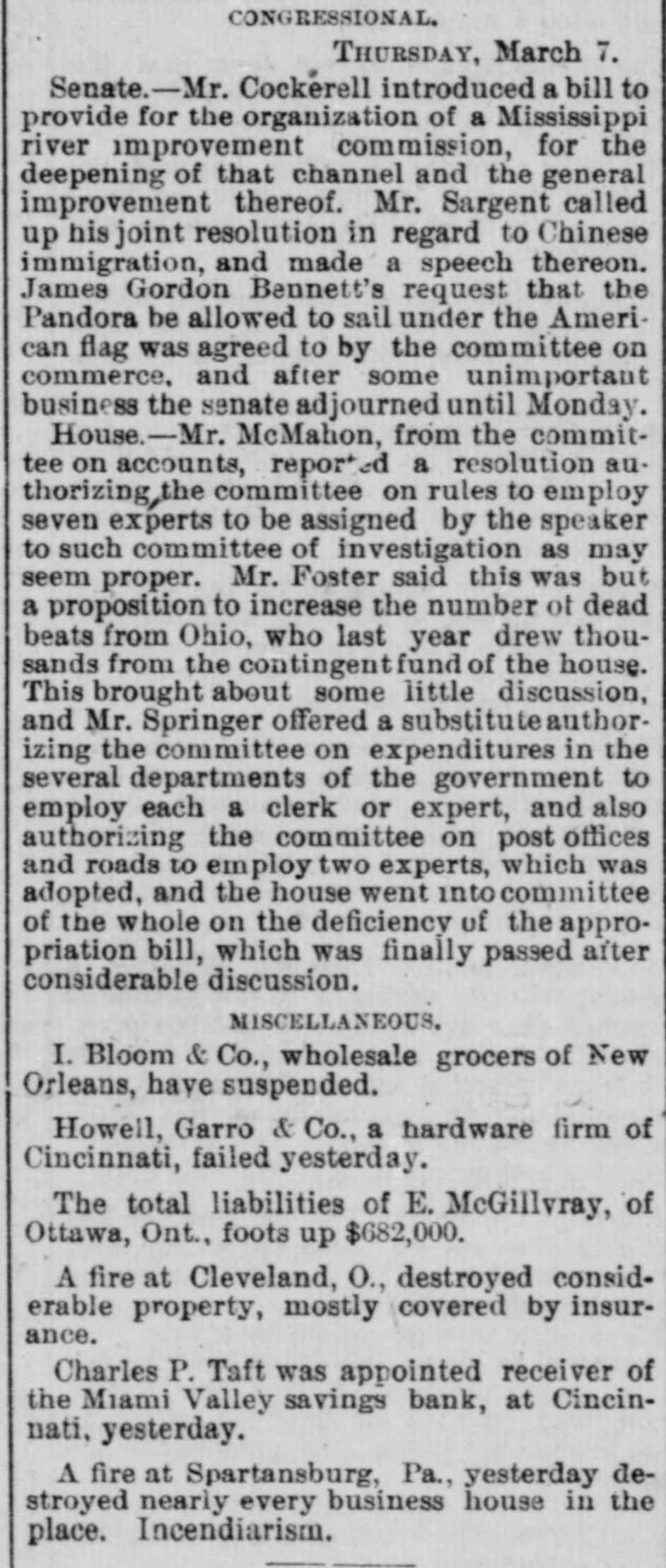 CONGRESSIONAL THURSDAY, March 7. Senate.-Mr. Cockerell introduced a bill to provide for the organization of a Mississippi river improvement commission, for the deepening of that channel and the general improvement thereof. Mr. Sargent called up his joint resolution in regard to Chinese immigration, and made a speech thereon. James Gordon Bennett's request that the Pandora be allowed to sail under the American flag was agreed to by the committee on commerce, and after some unimportant business the senate adjourned until Monday. House.-Mr. McMahon, from the committee on accounts, repor* a resolution authorizing the committee on rules to employ seven experts to be assigned by the speaker to such committee of investigation as may seem proper. Mr. Foster said this was but a proposition to increase the number ot dead beats from Ohio, who last year drew thousands from the contingent fund of the house. This brought about some little discussion, and Mr. Springer offered a substitute authorizing the committee on expenditures in the several departments of the government to employ each a clerk or expert, and also authorizing the committee on post offices and roads to employ two experts, which was adopted, and the house went into committee of the whole on the deficiency of the appropriation bill, which was finally passed after considerable discussion. MISCELLANEOUS. I. Bloom & Co., wholesale grocers of New Orleans, have suspended. Howell, Garro & Co., a hardware firm of Cincinnati, failed yesterday. The total liabilities of E. McGillvray, of Ottawa, Ont., foots up $682,000. A fire at Cleveland, O., destroyed considerable property, mostly covered by insurance. Charles P. Taft was appointed receiver of the Miami Valley savings bank, at Cincinnati, yesterday. A fire at Spartansburg, Pa., yesterday destroyed nearly every business house in the place. Incendiarism.