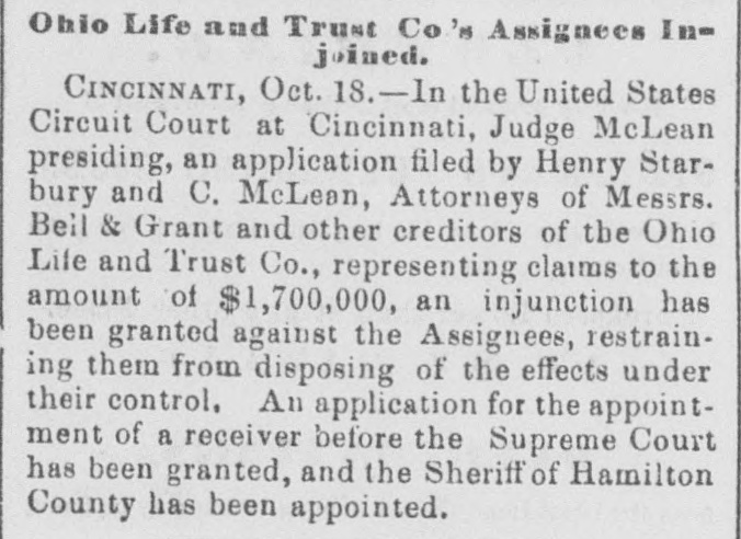 Ohio Life and Trust Co's Assignees Injoined. CINCINNATI, Oct. 18.-In the United States Circuit Court at Cincinnati, Judge McLean presiding, an application filed by Henry Starbury and C. McLean, Attorneys of Messrs. Beil & Grant and other creditors of the Ohio Life and Trust Co., representing claims to the amount of $1,700,000, an injunction has been granted against the Assignees, restraining them from disposing of the effects under their control. An application for the appointment of a receiver before the Supreme Court has been granted, and the Sheriff of Hamilton County has been appointed.