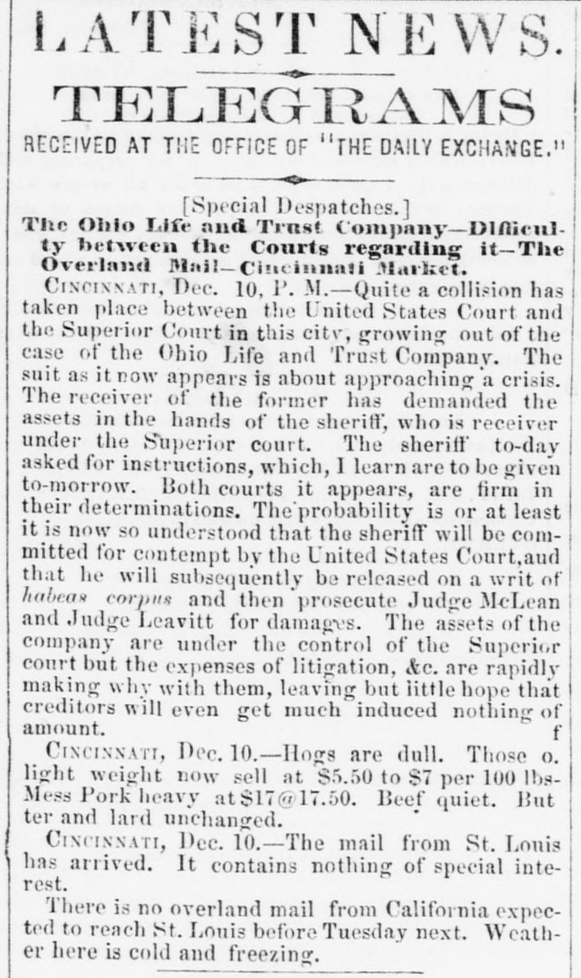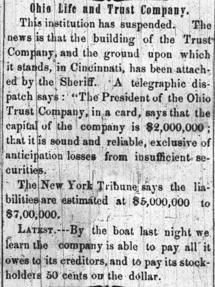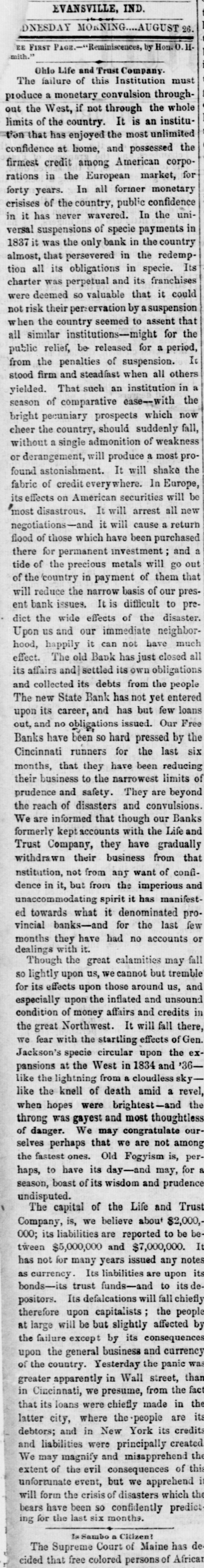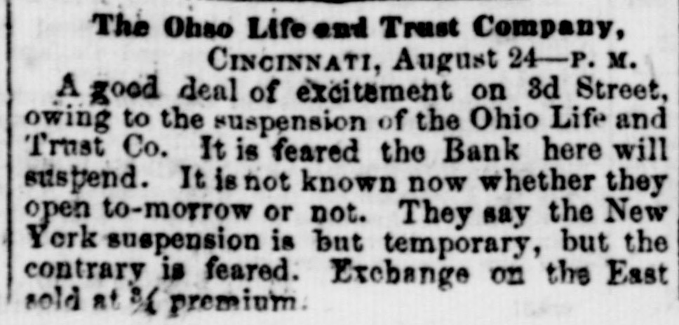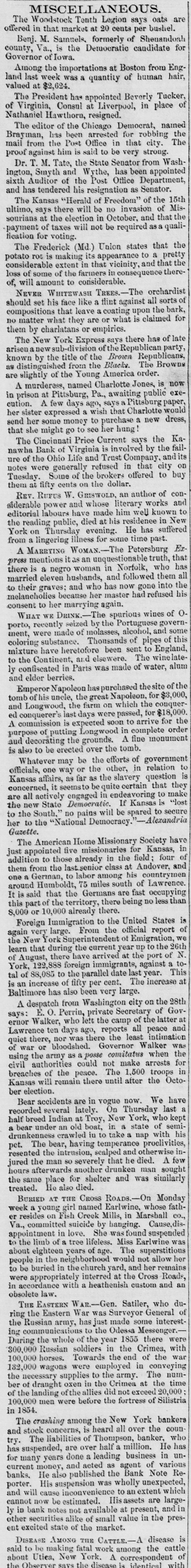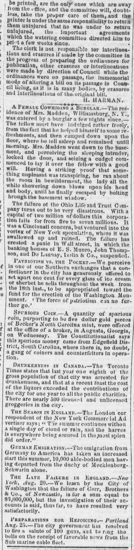 h FURTHER BY THE ANGLO-SAXON. Z i Our advices by the Anglo-Saxon state that the o laying of the Ocean Telegraph is progressing favorP ably. a The rumored suspension of negotiations on the Spanish Mexican question is not confirmed. France, Russia, Prussia and Sardinia have suspended relations with Turkey. ADDITIONAL BY ANGLO-SAXON. NEW YORK, August 24.-The Telegraph fleet was detained at Velantia, Bay until the 7th. The Agent of the Associated Press at Liverpool received a dispatch dated August 10th, from on board the Niagara, stating that 300 miles had been laid, and that all were more and more satisfied of their final and complete success. All on board were well. They had moderate westerly winds. Arrivals Out. The Atlantic and Vanderbilt arrived out at Liverpool on the 11th. The latter made the passage in nine days and thirteen honrs. England. Palmerston stated that 30,000 troops have been sent to India. D'Israeli declared that this year's campaign was lost. There is no later news from India. France. The Emperor and Empress had returned to Paris. Spain. The Madrid papers state that the Spanish Government has information of another filibuster expedition intended for Cuba. Liverpool Markets. LIVERPOOL, August 12.-Western Canal Flour 30s. to 30s. 6d. Red Wheat Ss. to 8s. 4d. White Wheat 9s. 3d. to 9s. 9d. Yellow and Mixed Corn 36s. Pro1 visions closed firm. Lard 70s. to 71s. Coffee is firm. Rice dull. Arrival of the City of Washington. NEW YORK, August 24.-The steamship City of Washington brings Liverpool dates of the 12th. Her advices are unimportant. James Murdoch, the American tragedian, is a passenger by the City of Washington. The Telegraph Cable. We have nothing further from the telegraph fleet by this arrival. Victoria to Visit France. It is expected that Victoria will soon visit the French camp at Chalons. Spain. Advices from Spain state that the wine crop is insignificant. Powder Mill Explosion. WILMINGTON, DEL., August 24. - On Saturday S. afternoon the powder mill of Messrs. Dupont, near this place, exploded. Mr. Dupont and three other men were killed and two others were injured. Failure of the Ohio Life and Trust Company. NEW YORK, August 24.-The Ohio Life and Trust y eCompany has suspended. There is great excitement in consequence. CINCINNATI, August 24.-There is considerable exncitement here in consequence of the failure of the n Ohio Life Insurance and Trust Company. It is feared that the house here will not open to-morrow. t Domestic Markets. to NEW YORK, August 24.-Sales of cotton-400 bales ul of closing steady. Ohio Flour, $6 50 to $6 90; White a Wheat, $1 60 to $1 70; Corn, 85 to 90c. Provisions firm. Lard, 163c. Sugar and Coffee quiet. KCINCINNATI, August 24. - Flour, $5 to $5 25. a Wheat unchanged. Corn dull. Bacon Shoulders, er 12c.; Sides, 14c. n Steamboats Passing. f. VICKSBURG, August 24. - The Pete Whetstone passed down at 9 A.M., and the Henry Choteau at 4 yesterday. in