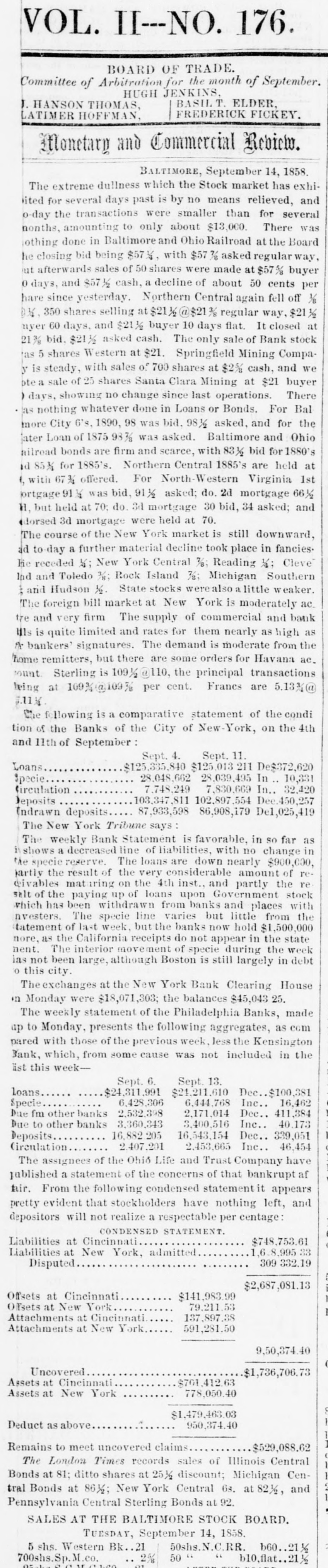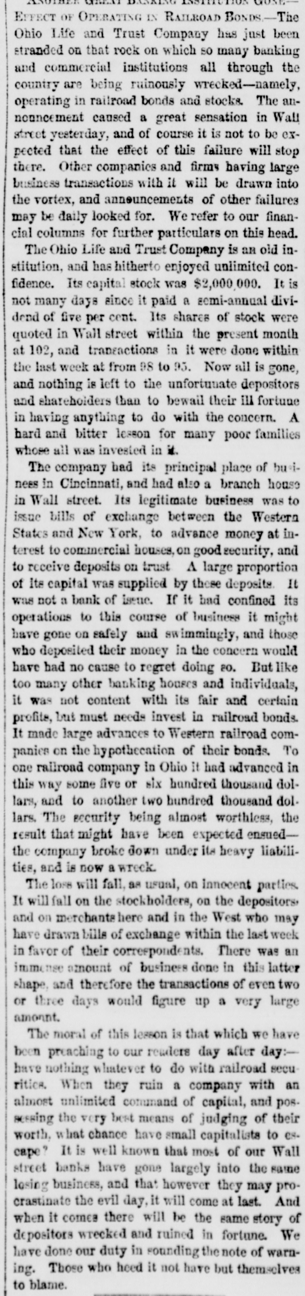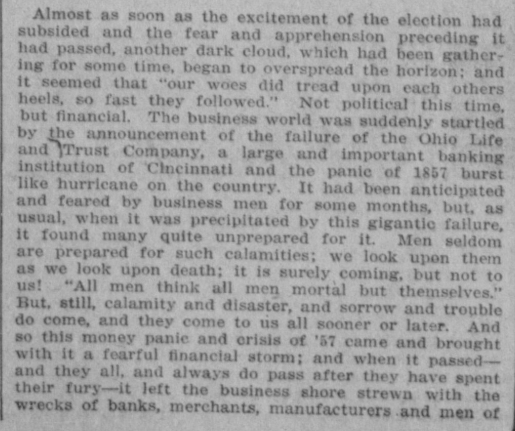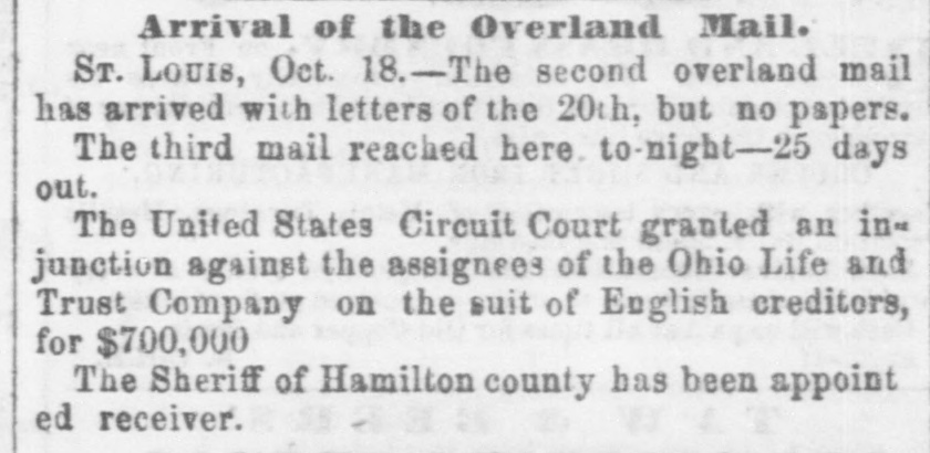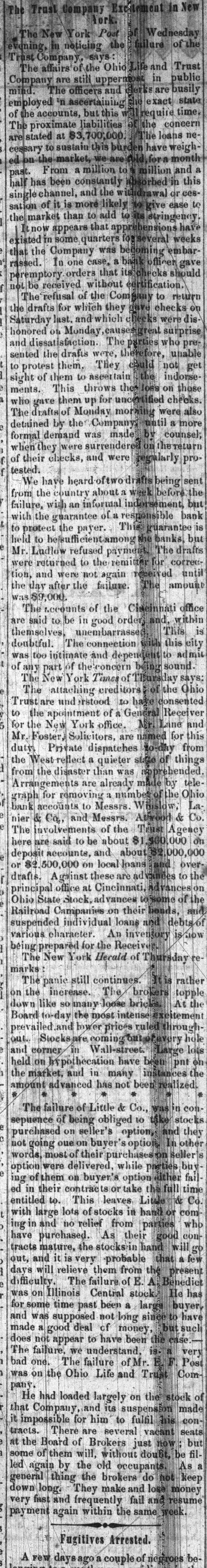 h FURTHER BY THE ANGLO-SAXON. Z i Our advices by the Anglo-Saxon state that the o laying of the Ocean Telegraph is progressing favorP ably. a The rumored suspension of negotiations on the Spanish Mexican question is not confirmed. France, Russia, Prussia and Sardinia have suspended relations with Turkey. ADDITIONAL BY ANGLO-SAXON. NEW YORK, August 24.-The Telegraph fleet was detained at Velantia, Bay until the 7th. The Agent of the Associated Press at Liverpool received a dispatch dated August 10th, from on board the Niagara, stating that 300 miles had been laid, and that all were more and more satisfied of their final and complete success. All on board were well. They had moderate westerly winds. Arrivals Out. The Atlantic and Vanderbilt arrived out at Liverpool on the 11th. The latter made the passage in nine days and thirteen honrs. England. Palmerston stated that 30,000 troops have been sent to India. D'Israeli declared that this year's campaign was lost. There is no later news from India. France. The Emperor and Empress had returned to Paris. Spain. The Madrid papers state that the Spanish Government has information of another filibuster expedition intended for Cuba. Liverpool Markets. LIVERPOOL, August 12.-Western Canal Flour 30s. to 30s. 6d. Red Wheat Ss. to 8s. 4d. White Wheat 9s. 3d. to 9s. 9d. Yellow and Mixed Corn 36s. Pro1 visions closed firm. Lard 70s. to 71s. Coffee is firm. Rice dull. Arrival of the City of Washington. NEW YORK, August 24.-The steamship City of Washington brings Liverpool dates of the 12th. Her advices are unimportant. James Murdoch, the American tragedian, is a passenger by the City of Washington. The Telegraph Cable. We have nothing further from the telegraph fleet by this arrival. Victoria to Visit France. It is expected that Victoria will soon visit the French camp at Chalons. Spain. Advices from Spain state that the wine crop is insignificant. Powder Mill Explosion. WILMINGTON, DEL., August 24. - On Saturday S. afternoon the powder mill of Messrs. Dupont, near this place, exploded. Mr. Dupont and three other men were killed and two others were injured. Failure of the Ohio Life and Trust Company. NEW YORK, August 24.-The Ohio Life and Trust y eCompany has suspended. There is great excitement in consequence. CINCINNATI, August 24.-There is considerable exncitement here in consequence of the failure of the n Ohio Life Insurance and Trust Company. It is feared that the house here will not open to-morrow. t Domestic Markets. to NEW YORK, August 24.-Sales of cotton-400 bales ul of closing steady. Ohio Flour, $6 50 to $6 90; White a Wheat, $1 60 to $1 70; Corn, 85 to 90c. Provisions firm. Lard, 163c. Sugar and Coffee quiet. KCINCINNATI, August 24. - Flour, $5 to $5 25. a Wheat unchanged. Corn dull. Bacon Shoulders, er 12c.; Sides, 14c. n Steamboats Passing. f. VICKSBURG, August 24. - The Pete Whetstone passed down at 9 A.M., and the Henry Choteau at 4 yesterday. in