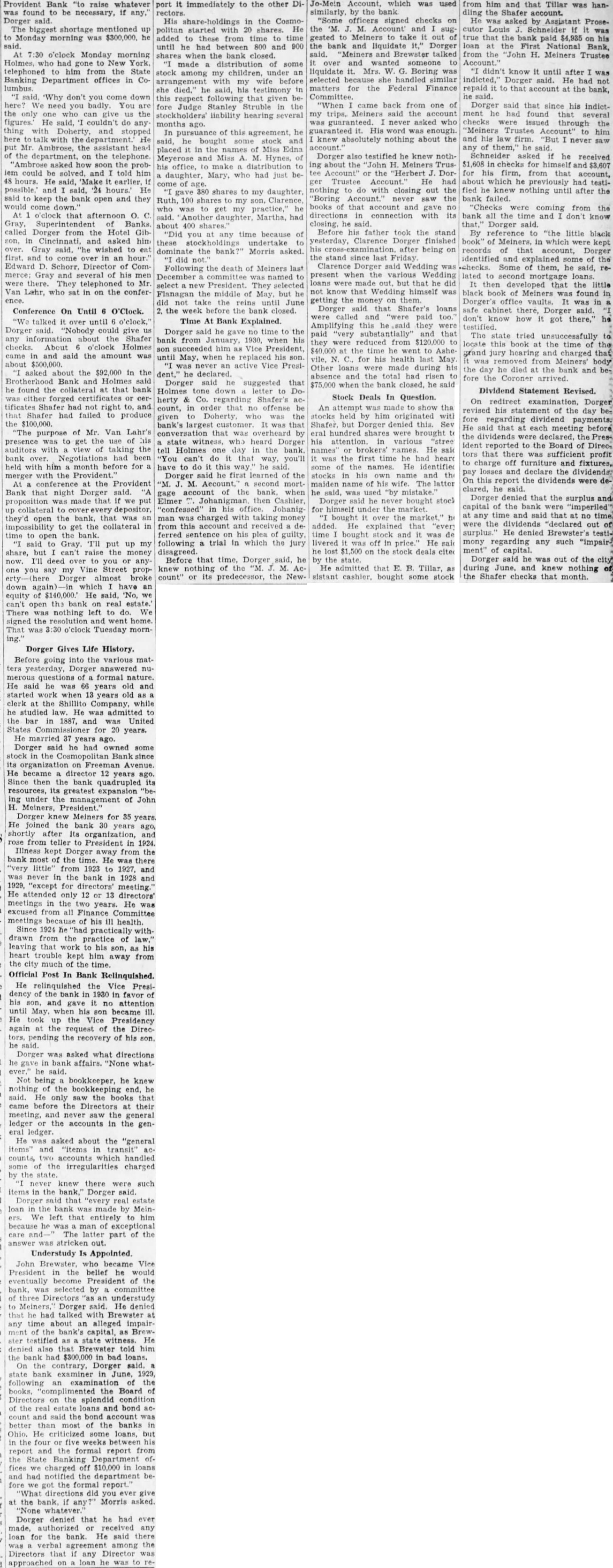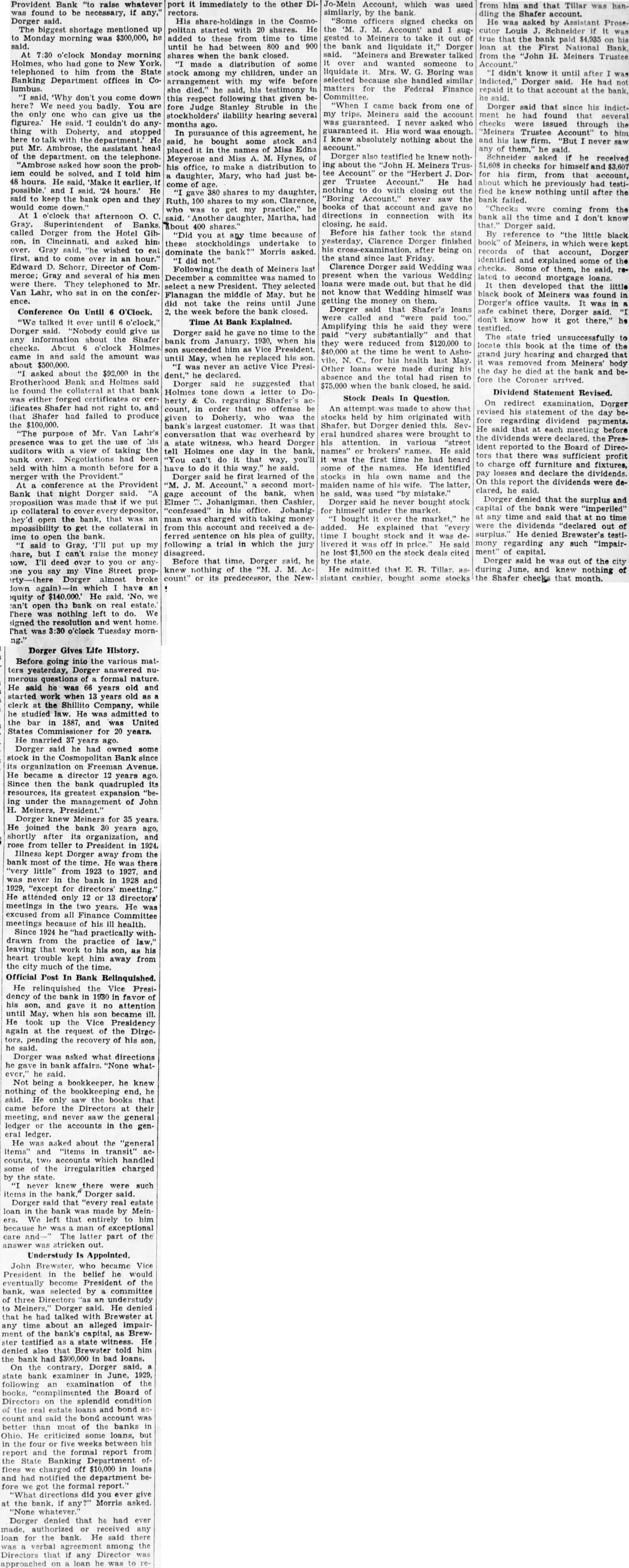 Dorger Gives Life History. Before going into the various yesterday, Dorger answered merous questions formal nature He years old and work when 13 years old clerk the Shillito Company, while studied He was admitted the 1887, United States Commissioner for years. married Dorger he had owned some stock the Bank Freeman Avenue. He became director years Since then the bank resources, its greatest ing under the management of John Dorger knew Meiners for 35 years He joined the bank shortly after organization, from teller President 1924. Illness kept Dorger from the most the time. He there little" from 1923 1927, and never the bank 1928 "except directors meeting.' He attended only or directors' meetings the excused from Finance Committee because his ill health. Since 1924 practically drawn from the practice leaving that work his son, heart trouble him away from the much the time. Official Post In Bank Relinquished. He relinquished Vice Presidency the and attention May. became He up Presidency again the request of the Directors, pending the recovery of his son, Dorger asked what directions he gave bank affairs. "None whatNot being bookkeeper, he knew nothing the bookkeeping end, said. only the books that came before the their meeting, and the general ledger the accounts in the genledger. He asked about the "general items" and transit" counts, accounts which handled the irregularities charged state. there were such items the Dorger said. Dorger said that real estate loan bank made by Meinthat entirely because exceptional latter part of the answer stricken Understudy Appointed. John Brewster, who became Vice President belief become President selected committee three Directors Meiners," Dorger He denied that he talked with Brewster any time about alleged the bank's capital, Brewster testified state witness. He denied Brewster bank $300,000 loans. contrary, Dorger bank examiner June, 1929, following examination "complimented the Board Directors the splendid condition the and bond count the bond most the banks Ohio. He loans, the four the formal report charged off $10,000 in loans had notified the department begot the give Morris asked. "None Dorger denied that he had loan bank. He said there among Directors any Director port immediately to the other rectors. His share-holdings in the Cosmopolitan started with shares. He added these from time time until he 800 and shares when the bank closed. made distribution of some stock among children, under arrangement with my wife before died." said, this respect that given Judge Stanley Struble the liability hearing several ago. In this agreement, bought some stock placed Miss Meyerose and Miss Hynes, his office, make distribution daughter, Mary, who had just shares my daughter, Ruth, 100 my my practice," Martha, had about 400 shares. "Did you time because these dominate Morris asked. Following death of Meiners named select They selected Flanagan the middle May. but did reins until the before the bank closed. Time Bank Explained. Dorger time to the 1930, when May, his son never active Vice Presideclared. Dorger he suggested that Holmes down letter herty regarding Shafer's count, in order that offense given customer. overheard witness, heard Dorger Holmes day can't that way, have to do this he Dorger said he first learned of the Account, second mortgage account the when Elmer Johanigman. then Cashier, "confessed" in office. Johanigman charged taking from and ferred following trial which the jury disagreed. Before that time, Dorger said, knew the "M. predecessor, the