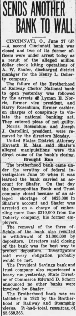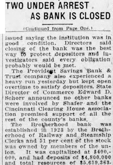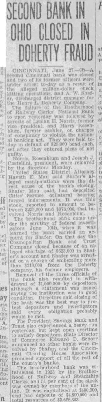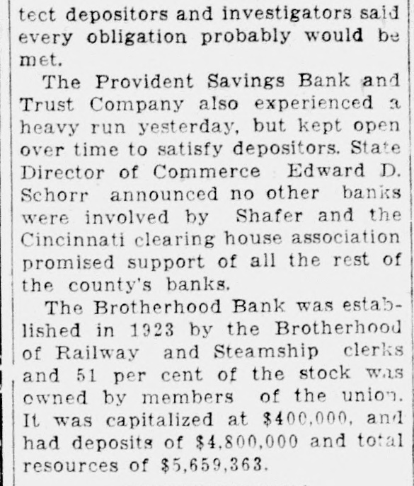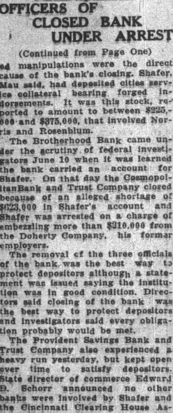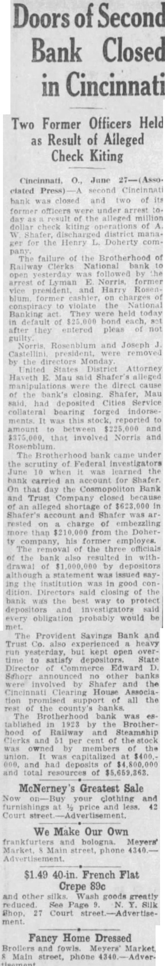 Provident Bank raise whatever found necessary, Dorger said. biggest shortage mentioned Monday morning was $300,000, said. o'clock Monday morning Holmes, gone York, from the State Banking Department offices in lumbus. don't you come down you badly. the give the figures. He do anything Doherty, and stopped here put Ambrose. the head the department. the telephone. the could be told him hours. possible. and hours. He said keep the bank open they would come down. At o'clock afternoon Superintendent called Dorger Hotel and asked him Gray said, wished first. and come in Edward Schorr, Director of Commerce; Gray several his there. They telephoned Van Lahr, who sat in on the conference. Conference On Until talked it until Dorger could information about the Shafer checks. o'clock Holmes came and said the amount $500,000. asked about the $92,000 in the Brotherhood Bank and Holmes found that bank either forged certificates tificates Shafer not Shafer had failed produce the $100,000. "The purpose of Mr. Van Lahr's presence auditors of taking the bank over. Negotiations had held with him month for merger the Provident.' conference the Provident Bank night Dorger said. proposition made that collateral open the bank, that impossibility get the collateral open the bank. Gray. put up share, but the money now. I'll deed to say my Vine Street you Dorger down equity He No. the real There nothing We signed and went That was o'clock Tuesday morn-