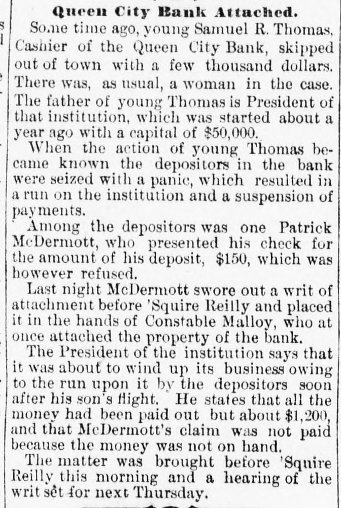Queen City Bank Attached. Some time ago, young Samuel R. Thomas, Cashier of the Queen City Bank, skipped out of town with a few thousand dollars. There was, as usual, a woman in the case. The father of young Thomas is President of that institution, which was started about a year ago with a capital of $50,000. When the action of young Thomas became known the depositors in the bank were seized with a panic, which resulted in a run on the institution and a suspension of payments. Among the depositors was one Patrick McDermott, who presented his check for the amount of his deposit, $150, which was however refused. Last night McDermott swore out a writ of attachment before 'Squire Reilly and placed it in the hands of Constable Malloy, who at once attached the property of the bank. The President of the institution says that it was about to wind up its business owing to the run upon it by the depositors soon after his son's flight. He states that all the money had been paid out but about $1,200, and that McDermott's claim was not paid because the money was not on hand. The matter was brought before 'Squire Reilly this morning and a hearing of the writ set for next Thursday.