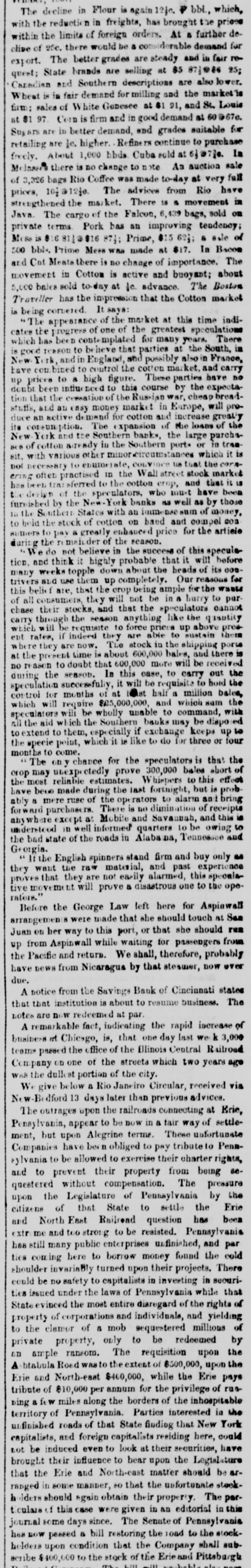 The decline in Flour is again 12jc. P bbl, which, with the reduction in freights, has brought the prices within the limits of foreign orders. At & further decline of 25c. there would be a considerable demand for export. The better grades are steady and in fair re:se S$ TH Jugges are spound treat Canadian and Southern descriptions are also lower. Wheat is in fair demand for milling and the market's firm; sales of hite Genesee at $1 91, and St. Louis 10 pusment poor as pus ming 18 used 26 IS 18 Sugars are in better demand, and grades suitable for retailing are le. higher. Refine rs continue to purchase freely. About 1,000 hbds Cuba sold at j@7&. In Molasses there is no change to n note An auction sale of 3,326 bags Rio Coffee was made to-day at very full prices, 101 @12fe. The advices from Rio have strengthened the market. There 18 & movement in Java. The cargo of the Falcon, 6,439 bags, sold on private terms Pork has an improving tendency; 10 et's 8 189 918 Print 1148 9110118 918 ST *** 500 bbls. Prime Mess was made at $17. In Bacon and Cot Meats there is no change of importance. The shoots pus eages si Conor m more 5,000 bales sold to-day at 1c. advance. The Boston Traveller has the impression that the Cotton market is being cornered. It says: "The appearance of the market at this time indicates the progress of one of the greatest speculations which has been contemplated for many years. There m the 10 parties this here 9 01 nosses pood 81 New York, and in England, and possibly also in France, have COD bined to control the cotton market. and carry up prices to & high figure. These parties have no doubt been influe need to this course by the expectation that the cersation of the Russian war, cheap breadstuffs, and an easy money market in Europe, will produce an active demand for cotton and increase greatly eys Jo loves one Jo uoisaudx ell #11 New York and the Southern banks, the large purchaSe8 of cotton already in the Southern ports or in tram81 " your JOHNUI request SOOUBA qua '118 not necessary to enumerate, convince us that the cornering often practised in the Wall street stock market has been tral sferred to the cotton erop, and that it is the design of the speculators, who must have been 4q se IIPM SR shows the sq paqsroms Jo was required ne que STATES Security 971 01 UOD jedmoo pus pasq no conor 30 store am prog 01 article on 10J could enhauced 8 And 01 8490108 during the re mainder of the season. We do not believe in the success of this speculetion, and think it highly probable that it will before many weeks topple down about the heads of its 002trivers and use them up completely. Our reasons for FIREA eq: JOJ apdure Dateg doso 'are The sign of all consumers, they will not be in a hurry to purchase their stocks, and that the speculators cannot Amounb en "WII Supplier eq: 48001q; Cust which will be requisite to force prices up above premony subjections 03 are They peoput I! Terrer que used Buiddiqe the up stock 91L *MOU 0.18 Lang M 51 puu 'sareq 000'009 10008 " auris quesent am 18 no ason to doubt that 600,000 more will be received during the season. In this case, to carry out the on prog 03 eq IIIM " speciality control for months of at last half a million bales, which will require $25,000,000, and which sum the speculators will be wholly unable to command, with all the aid ich the Southern banks may be dispo ed 01 dn beeps II especially them 01 moj 10 the JOJ op 07 "Ill at 1! quick 'sagod staads en months to come. The on chance for the speculators is that the 30 who below 000'00£ You doio seege sign 01 reliable 1800 am have been made during the last fortnight, but is prob. Suinq pus UNITED 01 the JO area R Sign individual Jo contraing on 81 pressare . RTU7 pue Statement pus 900W 18 on Suimo eq 01 Quarters IIAM 00 program the bad state of the roads in Alaba Tennessee and Georgia. 11 the English spinners stand firm and buy only as they want the raw material, and past experience proves that they are not easily alarmed, this specula-odo ent 04 auo R Drove IIIM 10 ean rators." Before the George Law left here for Aspinwall arrangements were made that she should touch at See Juan on her way to this port, or that she should run up from Aspinwall while waiting for passengers from the Pacific and return. We shall, therefore, probably 33A0 MOU that &q underwoin шод smed bave due. A notice from the Savings Baok of Cincinnati states that that institution is about to resume business. The notes are now redeemed at par. jo incomes the 'gony required V business it Chiesgo, is, that one day last we k 3,000 teams passed the office of the Illinois Central Railroad Company on one of the streets which two years age WAS the dulle st portion of the city. We give below a Rio Janeiro Circular, received via New-Bedford 13 days later than previous advices. 'oug 18 the uodn saferino "IL Pensylvania, appear to be now in a fair way of settlement, but upon Alegrine terms. These unfortunate Companies have bee n obliged to pay tribute to Pennlvania to be allowed to exercise their charter rights, and to prevent their property from being sequestered without compensation. The pressure upon the Legislature of Pennsylvania by the citizens of that State to settle the Erie and North East Railread question has been extr me and too strong to be resisted. Pennsylvania has still many public enterprises unfinished, and par ties coming here to borrow money found the cold shoulder invariably turned upon their projects. There could be no safety to capitalists in investing in securities issued under the laws of Pennsylvania while that State evinced the most entire disregard of the rights of Supplets puu pus JO Product 30 millions qour U jo the 01 private property, only to be redeemed by an ample ransom. The requisition upon the A btabula Road was to the extent of $500,000, upon the Erie and North-east $400,000, while the Erie pays tribute of $10,000 per annum for the privilege of run-
