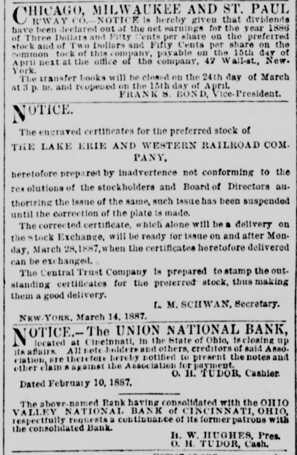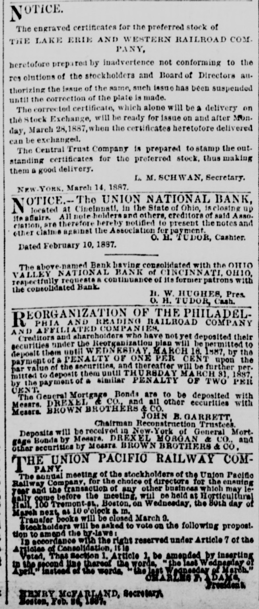 The engraved certificates for the preferred stock of THE LAKE ERIE AND WESTERN RAILROAD COM. PANY, heretofore prepared by inadvertence not conforming to the res olutions of the stockholders and Board of Directors all. thorizing the issue of the same, such issue has been suspended until the correction of the plate is made. The corrected certificate, which alone will be a delivery on the Stock Exchange, will be ready for issue on and after Mon. day, March 28,1887, when the certificates heretofore delivered can be exchanged. The Central Trust Company is prepared to stamp the out. standing certificates for the preferred stock, thus making them a good delivery. L. M. SCHWAN, Secretary. NEW YORK. March 14, 1887. NOTICE.- The UNION NATIONAL BANK, located at Cinelnuati, in the State of Ohio, is closing up ite affairs. All note holders and others, creditors of said Asso. clation, are therefore hereby notified to present the notes and other claime against the Association for payment. O. H. TUDOR, Cashier. Dated February 10. 1887. The above-named Bank having consolidated with the OHIO VALLEY NATIONAL BANK of CINCINNATI, OH10, respectfully requests a continuance of Its former patrons with the consolidated Bank. H. W. HUGHES, Pres. O. H. TUDOR, Cash. EORGANIZATION OF THE PHILADELR PHIA AND READING RAILROAD COMPANY AND AFFILIATED COMPANIES Creditors and shareholders who have not yet deposited their securities under the Reorganization plan will be permitted to deposit them until WEDNESDAY, MARCH 10. 1887, by the payment of a PENALTY OF ONE PER CENT upon the par value of the securities, and thereafter will be further permitted to deposit them until THURSDAY MARCH 81, 1887. by the payment of a similar PENALTY OF TWO PER CENT. The General Mortgage Bonds are to be deposited with Measre. DREXEL & CO., and all other eccurities with Measra. BROWN BROTHERS & CO. JOHN B. GARRETT, Chairman Reconstruction Trustees. Deposits will be received in New. York of General Mort. gage Bonds by Mesare. DREXEL MORGAN & CO., and other accurities by Mosara BROWN BROTHERS & 00, THEUNION PACIFIC RAILWAY COMThe annual meeting of the stockholders of the Union Pacific Rallway Company, for the choice of directors for the ensuing year and the transaction of any other business which may lehally come before the meeting, will 00 held at Horticultural Hall, 100 Tremont-sh, Boston. on Wednesday, the Both day of March next as 10 o'clock a m. Transfer books will be closed March 9. Blookholders will be asked to vote on the following proposttion to amend the by-laws: ID accordance with the right reserved under Article 7 of the Articles of Consolidation, 1818 Voten, Thas section 1. Article 1g be amended by inserting in the second line thereof the words, "the last Wedpenday of March" April instead of the words the last Wednesday of CHARLEST DAYS Presidents HENRY MCFARLAND, Secretary Boston, Feb. sq 108%