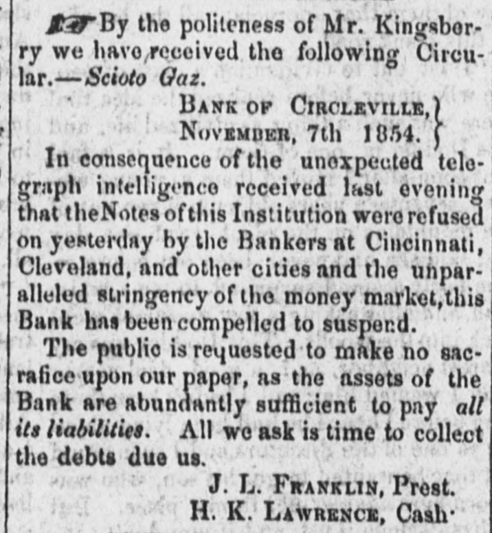 BANK OF CIRCLEVILLE, NOVEMBER, 7th 1854. In consequence of the unexpected telegraph intelligence ... that the Notes of this Institution were refused ... this Bank has been compelled to suspend.