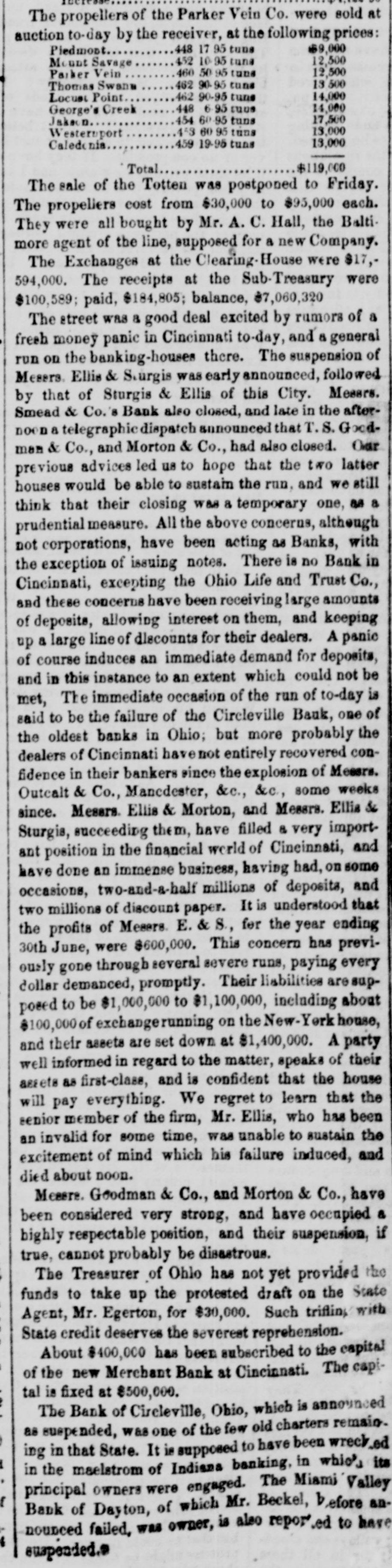 The propellers of the Parker Vein Co. were sold at auction to-day by the receiver, at the following prices: 448 17 95 tuns $9,000 Piedmont 452 10 tuns 12,500 Mount Savage 460 50 95 tuns 12,500 Parker Vein 13 500 462 90. tuns Thomas Swana 462 90-95 tune 14,000 Locust Point 448 6-95 tuus 14,000 George's Creek 17,500 454 60 95 tuns Jakson 13,000 453 60 tuns Westernport 459 19-95 tuns 13,000 Caledonia $119,000 Total The sale of the Totten was postponed to Friday. The propeliers cost from $30,000 to $95,000 each. They were all bought by Mr. A. C. Hall, the Baltimore agent of the line, supposed for a new Company. The Exchanges at the Clearing-House were $17,594,000. The receipts at the Sub-Treasury were $100,589; paid, $184,805; balance, $7,060,320 The street was a good deal excited by rumors of a fresh money panic in Cincinnati to-day, and a general run on the banking-houses there. The suspension of Messrs. Ellis & Sturgis was early announced, followed by that of Sturgis & Ellis of this City. Messrs. Smead & Co.'s Bank also closed, and late in the afternoon a telegraphic dispatch announced that T.S. Goodman & Co., and Morton & Co., had also closed. Our previous advices led us to hope that the two latter houses would be able to sustain the run, and we still think that their closing was a temporary one, as a prudential measure. All the above concerns, although not corporations, have been acting as Banks, with the exception of issuing notes. There is no Bank in Cincinnati, excepting the Ohio Life and Trust Co., and these concerns have been receiving large amounts of deposits, allowing interest on them, and keeping up a large line of discounts for their dealers. A panic of course induces an immediate demand for deposits, and in this instance to an extent which could not be met, The immediate occasion of the run of to-day is said to be the failure of the Circleville Bauk, one of the oldest banks in Ohio; but more probably the dealers of Cincinnati havenot entirely recovered confidence in their bankers since the explosion of Messrs. Outcalt & Co., Mancdester, &c., &c, some weeks since. Messrs. Eltis & Morton, and Messrs. Ellis & Sturgis, succeeding them, have filled & very important position in the financial world of Cincinnati, and have done an immense business, having had, on some occasions, two-and-a-half millions of deposits, and two millions of discount paper. It is understood that the profits of Mesers. E. & S., for the year ending 30th June, were $600,000. This concern has previously gone through several severe runs, paying every dollar demanced, promptly. Their liabilities are supposed to be $1,000,000 to $1,100,000, including about $100,000 of exchangerunning on the New-York house, and their assets are set down at $1,400,000. A party well informed in regard to the matter, speaks of their assets as first-class, and is confident that the house will pay everything. We regret to learn that the senior member of the firm, Mr. Ellis, who has been an invalid for some time, was unable to sustain the excitement of mind which his failure induced, and died about noon. Messre. Goodman & Co., and Morton & Co., have been considered very strong, and have occupied a highly respectable position, and their suspension, if true, cannot probably be disastrous. The Treasurer of Ohlo has not yet provided the funds to take up the protested draft on the State Agent, Mr. Egerton, for $30,000. Such trifling with State credit deserves the severest reprehension. About $400,000 has been subscribed to the capital of the new Merchant Bank at Cincinnati. The capital is fixed at $500,000. The Bank of Circleville, Ohio, which is announced as suspended, was one of the few old charters remain. ing in that State. It is supposed to have been wrecked in the maelstrom of Indiana banking, in whic's its principal owners were engaged. The Miami Valley Bank of Dayton, of which Mr. Beckel, before announced failed, was owner, is also report to have suspended.»