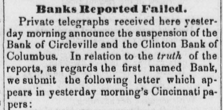 Banks Reported Failed. Private telegraphs received here yesterday morning announce the suspension of the Bank of Circleville and the Clinton Bank of Columbus. In relation to the truth of the reports, as regards the first named Bank, we submit the following letter which appears in yesterday morning's Cincinnati papers: