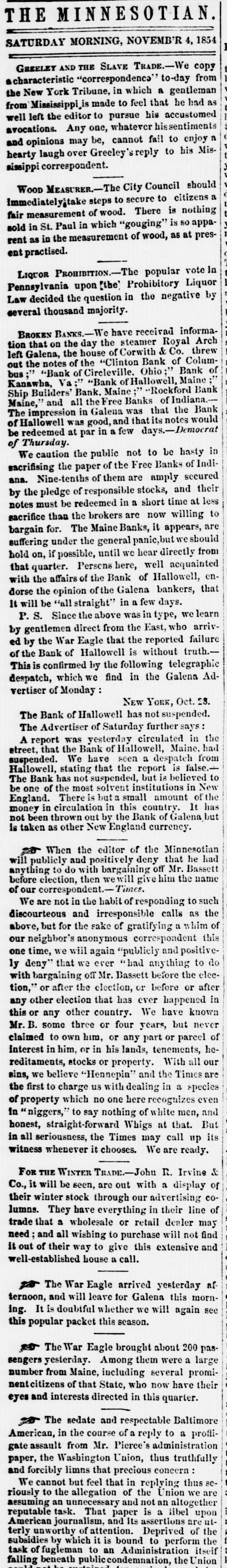 THE MINNESOTIAN. SATURDAY MORNING, NOVEMB'R 4, 1854 GREELEY AND THE SLAVE TRADE.-We copy acharacteristic "correspondenca" to-day from the New York Tribune, in which a gentleman from Mississippi made to feel that he had as well left the editor to pursue his accustomed avocations. Any one, whatever hissentiments and opinions may be, cannot fail to enjoy a hearty laugh over Greeley's reply to his Mississippi correspondent. WOOD MEASURER.-The City Council should Immediatelyttake steps to secure to citizens a fair measurement of wood. There is nothing sold in St. Paul in which "gouging" is so apparent as in the measurement of wood, as at present practised. LIQUOR PROHIBITION.-The popular vote In Pennsylvania upon [the] Prohibitory Liquor Law decided the question in the negative by several thousand majority. BROKEN BANKS.-We have receivad information that on the day the steamer Royal Arch left Galena, the house of Corwith & Co. threw out the notes of the "Clinton Bank of Columbus "Bank of Circleville. Ohio Bank of Kanawha, Va :" "Bank of Hallowell, Maine Ship Builders' Bank. Maine ;" "Rockford Bank Maine," and all the Free Banks of Indiana.The impression in Galena was that the Bank of Hallowell was good, and that its notes would be redeemed at par in a few days.-Democrat of Thursday. We caution the public not to be hasty in sacrifising the paper of the Free Banks of Indiana. Nine-tenths of them are amply secured by the pledge of responsible stocks, and their notes must be redeemed in a short time at less sacrifice than the brokers are now willing to bargain for. The Maine Banks, it appears, are suffering under the general panic,but we should hold on, if possible, until we hear directly from that quarter. Persons here, well acquainted with the affairs of the Bank of Hallowell, ondorse the opinion of the Galena bankers, that It will be "all straight" in a few days. P. S. Since the above was in type, we learn by gentlemen direct from the East, who arrived by the War Eagle that the reported failure of the Bank of Hallowell is without truth.This is confirmed by the following telegraphic despatch, which we find in the Galena Advertiser of Monday NEW YORK, Oct. 28. The Bank of Hallowell has not suspended. The Advertiser of Saturday further says A report was yesterday circulated in the street, that the Bank of Hallowell, Maine, had suspended. We have seen a despatch from Hallowell, stating that the report is false.The Bank has not suspended, but is believed to be one of the most solvent institutions in New England. There is but a small amount of the money in circulation in this country. It has not been thrown out by the Bank of Galena but is taken as other New England currency. When the editor of the Minnesotian will publicly and positively deny that he had anything to do with bargaining off Mr. Bassett before election, then wewill give him the name of our correspondent.-Tmes. We are not in the habit of responding to such discourteous and irresponsible calls as the above, but for the sake of gratifying a whim of our neighbor's anonymous correspondent this one time, we will again "publicly and positively deny" that we ever "had anything to do with bargaining off Mr. Bassett before the election," or after the election, or before or after any other election that has ever happened in this or any other country. We have known Mr. B. some three or four years, but never claimed to own him, or any part or parcel of interest in him, or in his lands, tenements, hereditaments, stocks or property. With all our sins, we believe "Hennepin" and the Times are the first to charge us with dealing in a species of property which no one here recognizes even in "niggers," to say nothing of white men, and honest, straight-forward Whigs at that. But in all seriousness, the Times may call up its witness whenever it chooses. We are ready. FOR THE WINTER TRADE.-John R. Irvine & Co., it will be seen, are out with a display of their winter stock through our advertising COlumns. They have everything in their line of trade that a wholesale or retail dealer may need and all wishing to purchase will not find it out of their way to give this extensive and well-established house a call. The War Eagle arrived yesterday af ternoon, and will leave for Galena this morning. It is doubtful whether we will again see this popular packet this season. The War Eagle brought about 200 passengers yesterday. Among them were a large number from Maine, including several prominentcitizens of that State, who now have their eyes and interests directed in this quarter. The sedate and respectable Baltimore American, in the course of a reply to a profligate assault from Mr. Pierce's administration paper, the Washington Union, thus truthfully and foreibly limns that precious concern We cannot but feel that in replying thus SCriously to the allegation of the Union we are assuming an unnecessary and not an altogether reputable task. That paper is a libel upon American journalism, and its assertions are utterly unworthy of attention. Deprived of the subsidies by which it is bound perform the