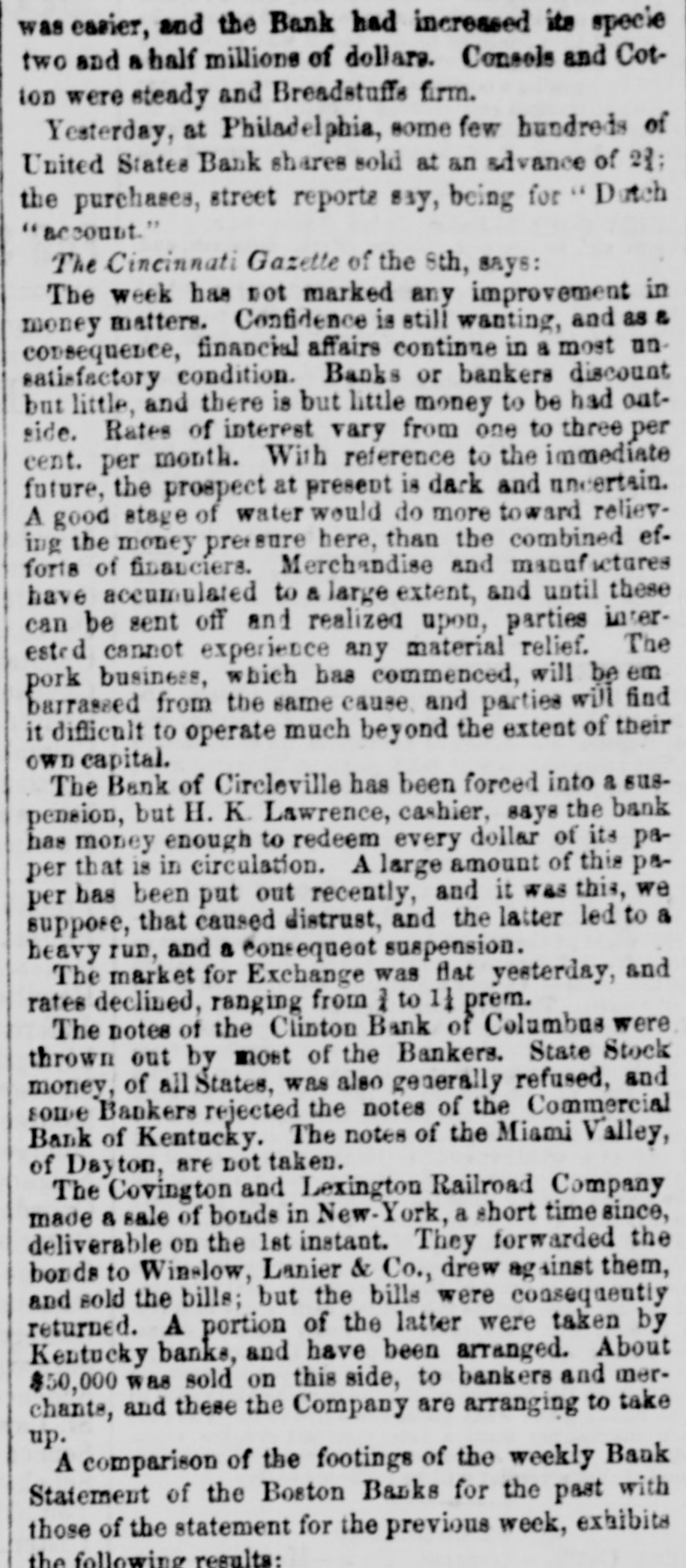 was easier, and the Bank had increased its specie two and ahalf millions of dollars. Consols and Cotton were steady and Breadstuffs firm. Yesterday, at Philadelphia, some few hundreds of United States Bank shares sold at an advance of 21; the purchases, street reports say, being for Datch "account." The Cincinnati Gazette of the 8th, says: The week has not marked any improvement in money matters. Confidence is still wanting, and as & consequence, financial affairs continue in a most unsatisfactory condition. Banks or bankers discount but little, and there is but little money to be had oatside. Rates of interest vary from one to three per cent. per month. With reference to the immediate future, the prospect at present is dark and uncertain. A good stage of water would do more toward relieving the money pressure here, than the combined efforts of financiers. Merchandise and manufactures have accumulated to & large extent, and until these can be sent off and realized upon, parties interested cannot experience any material relief. The pork business, which has commenced, will be em barrassed from the same cause, and parties will find it difficult to operate much beyond the extent of their own capital. The Bank of Circleville has been forced into a suspension, but H. K. Lawrence, cashier, says the bank has money enough to redeem every dollar of its paper that is in circulation. A large amount of this paper has been put out recently, and it was this, we suppose, that caused distrust, and the latter led to a heavy run, and a consequent suspension. The market for Exchange was flat yesterday, and rates declined, ranging from I to 11 prem. The notes of the Clinton Bank of Columbus were thrown out by most of the Bankers. State Stock money, of all States, was also generally refused, and some Bankers rejected the notes of the Commercial Bank of Kentucky. The notes of the Miami Valley, of Dayton, are not taken. The Covington and Lexington Railroad Company made a sale of bonds in New-York, a short time since, deliverable on the 1st instant. They forwarded the bonds to Winslow, Lanier & Co., drew against them, and sold the bills; but the bills were consequently returned. A portion of the latter were taken by Kentucky banks, and have been arranged. About $50,000 was sold on this side, to bankers and merchants, and these the Company are arranging to take up. A comparison of the footings of the weekly Bank Statement of the Boston Banks for the past with those of the statement for the previous week, exhibits the following results: