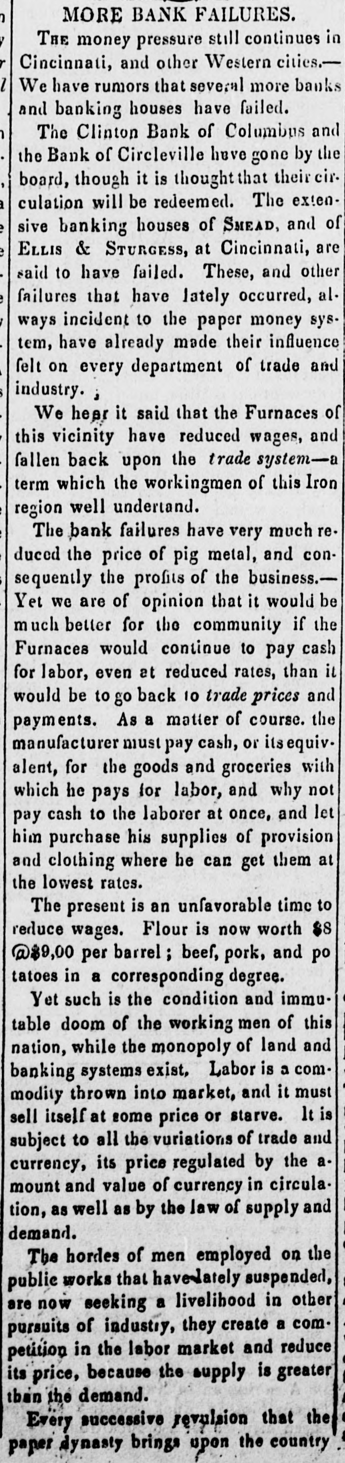 MORE BANK FAILURES. THE money pressure still continues in Cincinnati, and other Western cities.— We have rumors that several more banks and banking houses have failed. The Clinton Bank of Columbus and the Bank of Circleville have gone by the board, though it is thoughtthat their cir. culation will be redeemed. The extensive banking houses of SMEAD, and of ELLIS & STURGESS, at Cincinnati, are said to have failed. These, and other failures that have lately occurred, always incident to the paper money system, have already made their influence felt on every department of trade and industry. i We hear it said that the Furnaces of this vicinity have reduced wages, and fallen back upon the trade system-a term which the workingmen of this Iron region well undertand. The bank failures have very much reduced the price of pig metal, and consequently the profits of the business.Yet we are of opinion that it would be much better for the community if the Furnaces would continue to pay cash for labor, even at reduced rates, than it would be to go back 10 trade prices and payments. As a matter of course. the manufacturer must pay cash, or its equivalent, for the goods and groceries with which he pays for labor, and why not pay cash to the laborer at once, and let him purchase his supplies of provision and clothing where he can get them at the lowest rates. The present is an unfavorable time to reduce wages. Flour is now worth $8 @$9,00 per barrel beef, pork, and po tatoes in a corresponding degree. Yet such is the condition and immutable doom of the working men of this nation, while the monopoly of land and banking systems exist, Labor is a commodity thrown into market, and it must sell itself at some price or starve. It is subject to all the vuriations of trade and currency, its price regulated by the amount and value of currency in circulation, as well as by the law of supply and demand. The hordes of men employed on the public works that havedately suspended, are now seeking a livelihood in other pursuits of industry, they create a competition in the labor market and reduce its price, because the supply is greater than the demand. Every successive revulsion that the paper dynasty brings upon the country