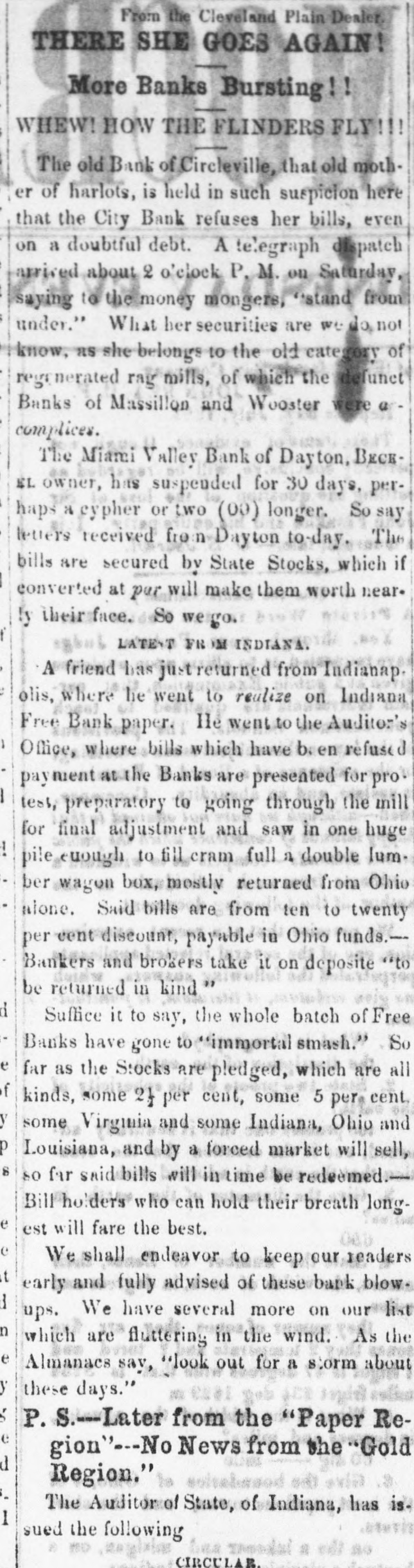 From the Cleveland Plain Dealer. THERE SHE GOES AGAIN! More Banks Bursting !! WHEW! HOW THE FLINDERS FLY!!! The old Bank of Circleville, that old mother of harlots, is held in such suspicion here that the City Bank refuses her bills, even on a doubtful debt. A telegraph dispatch arrived about 2 o'clock P. M. on Saturday saying to the money mongers, "stand from under." What her securities are we do not know, as she belongs to the old category of regenerated rag mills, of which the defunct Banks of Massillon and Wooster were a complices. The Miami Valley Bank of Dayton, BecKEL owner, has suspended for 30 days, perhaps a eypher or two (00) longer. So say letters received fro n Dayton to-day. The bills are secured by State Stocks, which if converted at pur will make them worth nearby their face. So welgo. LATEST FR IM INDIANA. A friend has just returned from Indianap. olis, where he went to reulize on Indiana Free Bank paper. He went to the Auditor's Office, where bills which have b. en refused payment at the Banks are presented for pro. test, preparatory to going through the mill for final adjustment and saw in one huge pile uough to fill cram full a double lum. ber wagon box, mostly returned from Ohio alone. Said bills are from ten to twenty per cent discount, payable in Ohio funds.Bankers and brokers take it on deposite "to be returned in kind Suffice it to say, the whole batch of Free Banks have gone to "immortal smash." So far as the Stocks are pledged, which are all f kinds, some 21 per cent, some 5 per cent. some Virgmia and some Indiana, Ohio and Louisiana, and by a forced market will sell, S 80 far said bills will in time be redeemed.Bill holders who can hold their breath longe est will fare the best. e We shall endeavor to keep our readers early and fully advised of these bank blow. ups. We have several more on our list n which are fluttering in the wind. As the e Almanacs sav, "look out for a scorm about these days." P. S.--Later from the "Paper Ree gion"---No News from the Gold d Region." The Auditor of State, of Indiana, has is1 sued the following CIRCULAR.