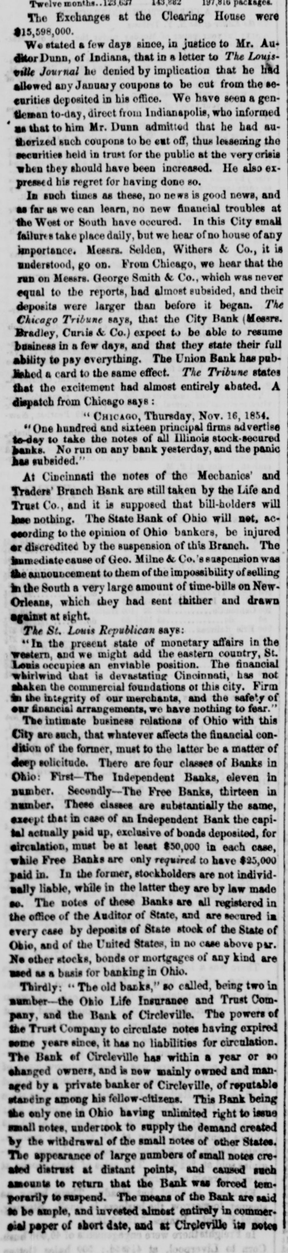 months Twelve The Exchanges at the Clearing House were $15,598,000. We stated a few days since, in justice to Mr. Au+ ditor Dunn, of Indiana, that in a letter to The Louisville Journal he denied by implication that he had allowed any January coupons to be cut from the securities deposited in his office. We have seen a gentleman to-day, direct from Indianapolis, who informed as that to him Mr. Dunn admitted that he had authorized such coupons to be eut off, thus lessening the securities held in trust for the public at the very crisis when they should have been increased. He also expressed his regret for having done 80. In such times as these, no news is good news, and as far as we can learn, no new financial troubles at the West or South have occured. In this City small failures take place daily, but we hear of no house of any importance. Messrs. Selden, Withers & Co., it is understood, go on. From Chicago, we hear that the run on Messrs. George Smith & Co., which was never equal to the reports, had almost subsided, and their deposits were larger than before it began. The Chicago Tribune says, that the City Bank (Messrs. Bradley, Curtis & Co.) expect to be able to resume business in a few days, and that they state their full ability to pay everything. The Union Bank has published a card to the same effect. The Tribune states that the excitement had almost entirely abated. A dispatch from Chicago says: CHICAGO, Thursday, Nov. 16, 1854. One hundred and sixteen principal firms advertise to-day to take the notes of all Illinois stock-secured banks. No run on any bank yesterday, and the panic has subsided." At Cincinnati the notes of the Mechanics' and Traders' Branch Bank are still taken by the Life and Trust Co., and it is supposed that bill-holders will lose nothing. The State Bank of Ohio will not, acocording to the opinion of Ohio bankers, be injured or discredited by the suspension of this Branch. The immediate cause of Geo. Milne & Co.'s suspension was the announcement to them of the impossibility of selling in the South a very large amount of time-bills on NewOrleans, which they had sent thither and drawn against at sight. The St. Louis Republican says: In the present state of monetary affairs in the western, and we might add the eastern country, St. Louis occupies an enviable position. The financial whirlwind that is devastating Cincinnati, has not shaken the commercial foundations of this city. Firm to the integrity of our merchants, and the safety of our financial arrangements, we have nothing to fear." The intimate business relations of Ohio with this City are such, that whatever affects the financial condition of the former, must to the latter be a matter of deep solicitude. There are four classes of Banks in Ohio: First-The Independent Banks, eleven in number. Secendly-The Free Banks, thirteen in number. These classes are substantially the same, except that in case of an Independent Bank the capital actually paid up, exclusive of bonds deposited, for circulation, must be at least $50,000 in each case, while Free Banks are only required to have $25,000 paid in. In the former, stockholders are not individmally liable, while in the latter they are by law made so. The notes of these Banks are all registered in the office of the Auditor of State, and are secured in every case by deposits of State stock of the State of Obio, and of the United States, in no case above par. No other stocks, bonds or mortgages of any kind are used as a basis for banking in Ohio. Thirdly: The old banks," so called, being two in number-the Ohio Life Insurance and Trust Company, and the Bank of Circleville. The powers of the Trust Company to circulate notes having expired some years since, it has no liabilities for circulation. The Bank of Circleville has within a year or 80 changed owners, and is now mainly owned and managed by a private banker of Circleville, of reputable standing among his fellow-citizens. This Bank being the only one in Ohio having unlimited right to issue small notes, undertook to supply the demand created by the withdrawal of the small notes of other States. The appearance of large numbers of small notes created distrust at distant points, and caused such amounts to return that the Bank was forced temporarily to suspend. The means of the Bank are said to be ample, and invested almost entirely in commercial paper of short date, and at Circleville its notes