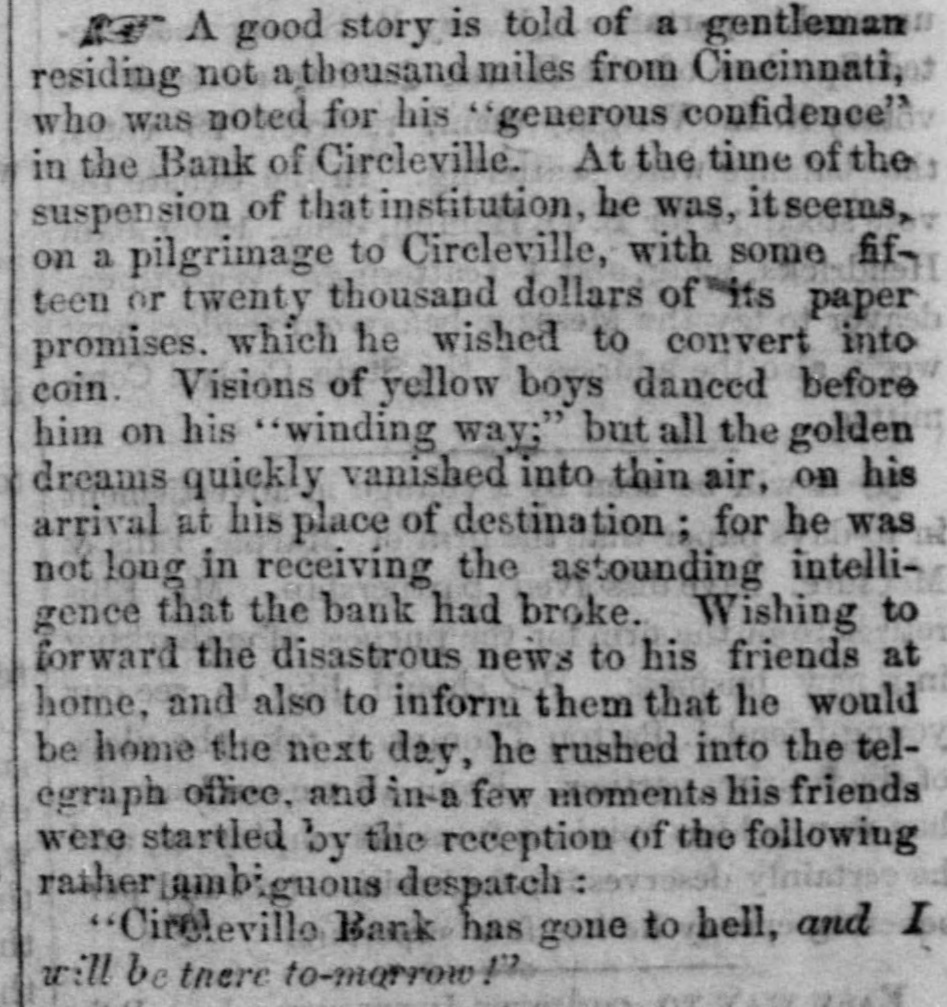 N A good story is told of a gentleman residing not a thousand miles from Cincinnati, who was noted for his "generous confidence" in the Bank of Circleville. At the time of the suspension of that institution, he was, itseems, on a pilgrimage to Circleville, with some fifteen or twenty thousand dollars of its paper promises. which he wished to convert into coin. Visions of yellow boys danced before him on his "winding way;" but all the golden dreams quickly vanished into thin air, on his arrival at his place of destination; for he was not long in receiving the astounding intelligence that the bank had broke. Wishing to forward the disastrous news to his friends at home, and also to inform them that he would be home the next day, he rushed into the telegraph office, and in-a few moments his friends were startled by the reception of the following rather ambi guous despatch "Cirolevillo Bank has gone to hell, and I will be there to-marrow 17