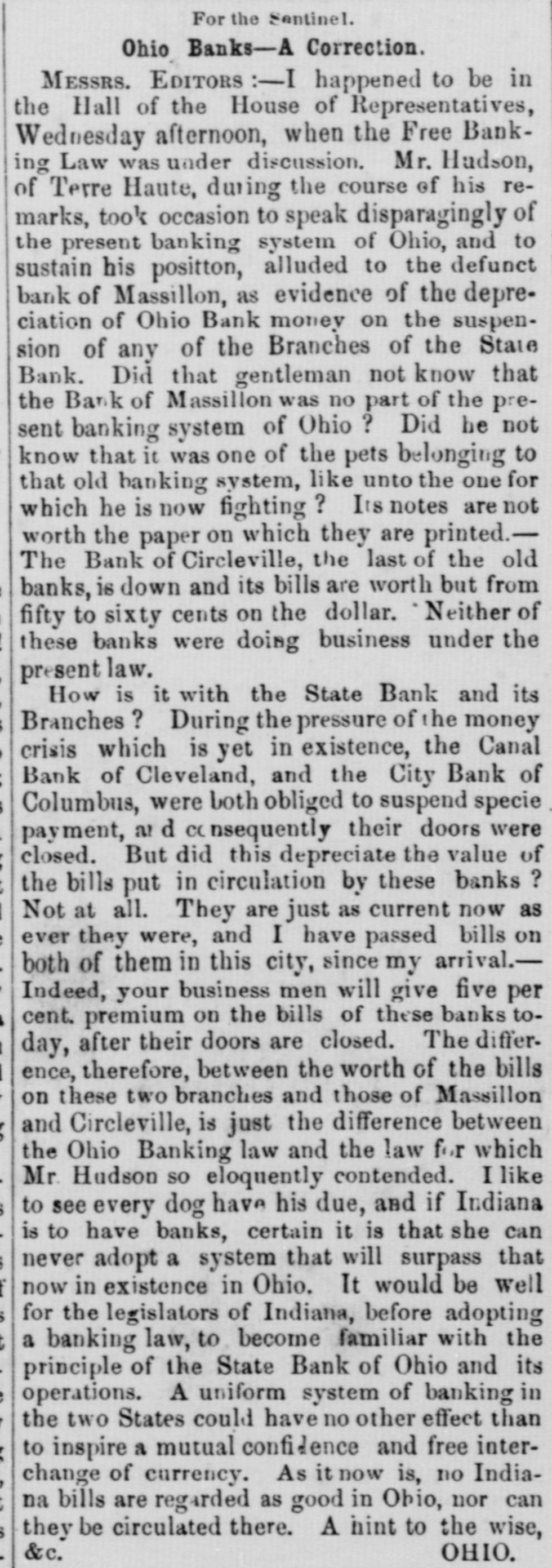 For the Sentinel. Ohio Banks-A Correction. MESSRS. EDITORS :-I happened to be in the Hall of the House of Representatives, Wednesday afternoon, when the Free Banking Law was under discussion. Mr. Hudson, of Terre Haute, during the course of his remarks, took occasion to speak disparagingly of the present banking system of Ohio, and to sustain his positton, alluded to the defunct bank of Massillon, as evidence of the depreciation of Ohio Bank money on the suspension of any of the Branches of the State Bank. Did that gentleman not know that the Bank of Massillon was no part of the present banking system of Ohio ? Did he not know that it was one of the pets belonging to that old banking system, like unto the one for which he is now fighting ? Its notes are not worth the paper on which they are printed.The Bank of Circleville, the last of the old banks, is down and its bills are worth but from fifty to sixty cents on the dollar. Neither of these banks were doing business under the present law. How is it with the State Bank and its Branches ? During the pressure of the money crisis which is yet in existence, the Canal Bank of Cleveland, and the City Bank of Columbus, were both obliged to suspend specie payment, at d cc nsequently their doors were closed. But did this depreciate the value of the bills put in circulation by these banks ? Not at all. They are just as current now as ever they were, and I have passed bills on both of them in this city, since my arrival.Indeed, your business men will give five per cent. premium on the bills of these banks today, after their doors are closed. The difference, therefore, between the worth of the bills on these two branches and those of Massillon and Circleville, is just the difference between the Ohio Banking law and the law for which Mr. Hudson so eloquently contended. I like to see every dog have his due, and if Indiana is to have banks, certain it is that she can never adopt a system that will surpass that now in existence in Ohio. It would be well for the legislators of Indiana, before adopting a banking law, to become familiar with the principle of the State Bank of Ohio and its operations. A uniform system of banking in the two States could have no other effect than to inspire a mutual confidence and free interchange of currency. As it now is, no Indiana bills are regarded as good in Obio, nor can they be circulated there. A hint to the wise, &c. OHIO.