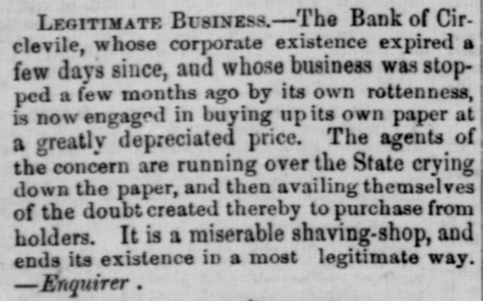 The Bank of Circleville, whose corporate existence expired a few days since, and whose business was stopped a few months ago by its own rottenness, is now engaged in buying up its own paper at a greatly depreciated price.